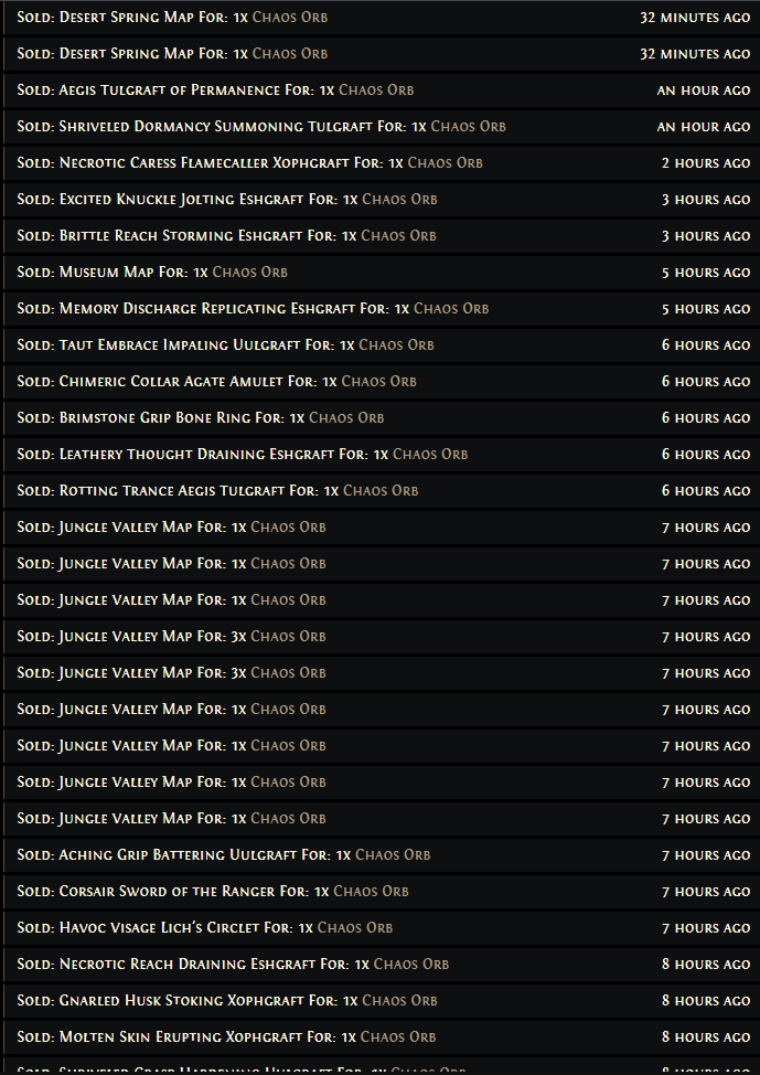да я не кичился, я прост показал что надо весь день ждать чтоб свои копейки продать. щас заработок в пое напрямую зависит от того сколько у тебя торговых вкладок, а потом будут говорить пое не пей ту вин