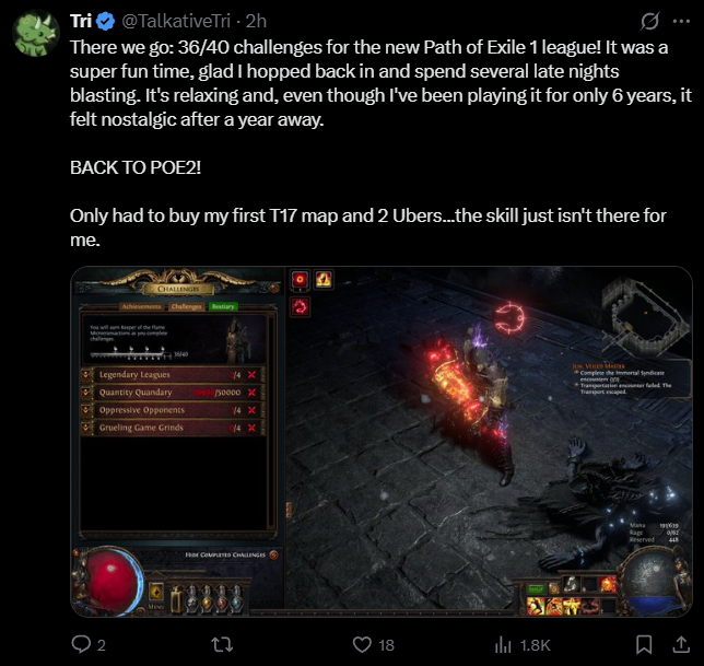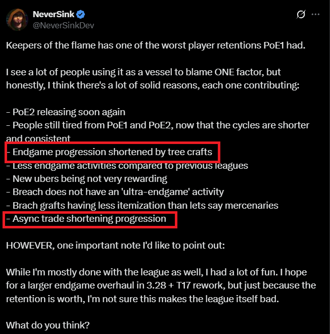 это все дерево виновато в слишком быстром прогрессе этой лиге с дерева сыпется сильный гир например 1000 ЕС регалии по 5с люди почти не крафтя оделись и сделали челенжи и ливнули игру большинство казуалов не заинтересованы в эндгейм гринде ради гринда