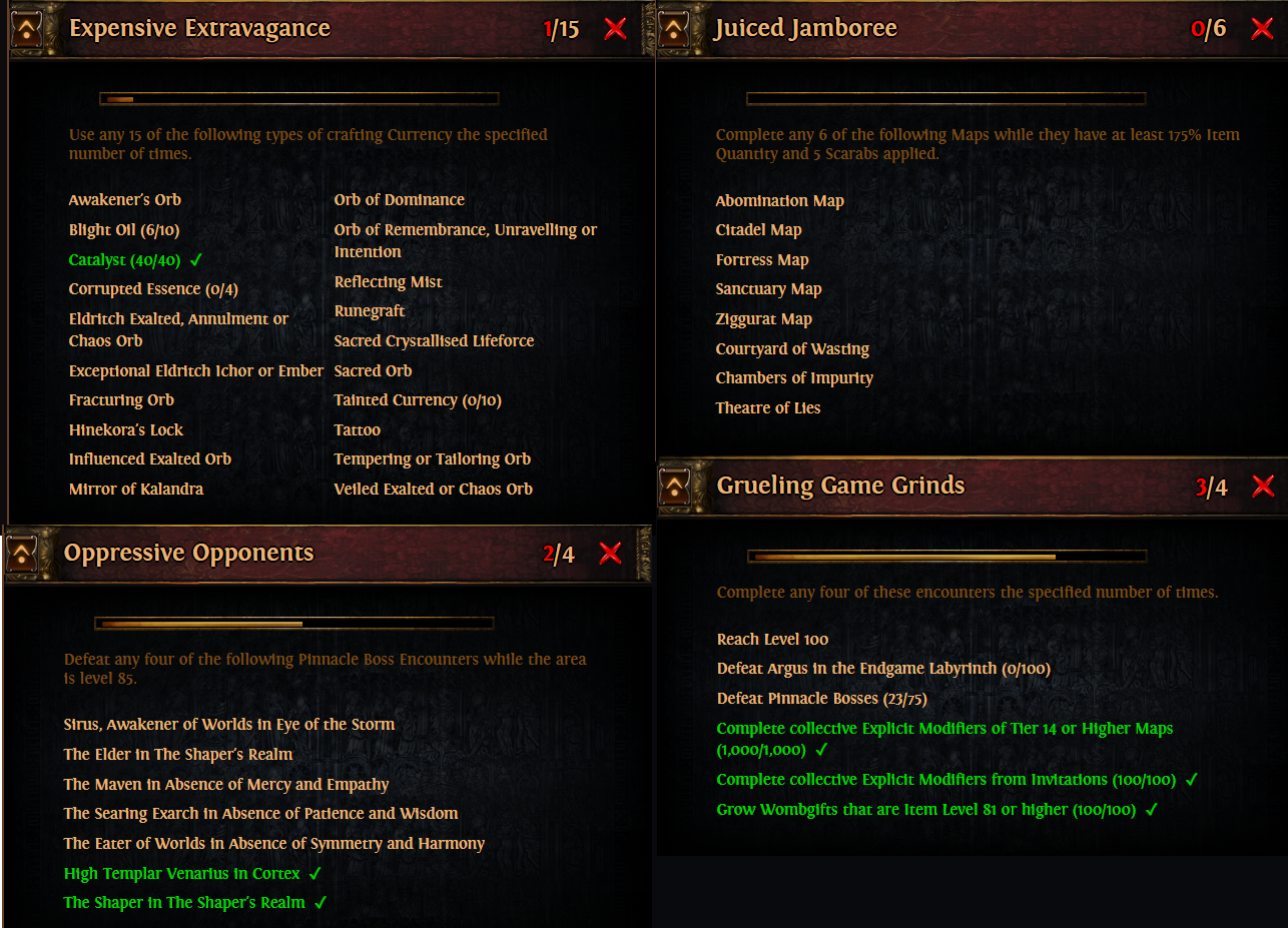 вообще с момента калгура(что до него было я уже не помню), то есть это больше года, все фармят предыдущие лигмеханики(те что есть на атласе), коробки, эсенции, ритуалы, ультиматумы и тд, то есть это сколько лет подряд поешеры фармят одни и теже лигмеханики? что в калгуре принципально нового добавили, татуировки и руны, и между этими они добавили целую прокладку в виде кингсмарша, где надо фармить всякую хуету и золото, чтобы эту хуйню добыть, хотя могли сделать чтобы вся эта хуйня просто с мобов на картах падала, разницы никакой небыло бы. дальше наёмники, с наёмников нихуя не падало, там вообще 4 слота под свитки мудрости, дальше переделаные разломы, что добавили, наросты и новые уники, опять же добавили между этими вещами прокладку в виде дерева и даров и крови, а могли просто сделать чтобы наросты и новые уники просто с мобов с разлома на карте падали, ну а дерево чисто для редких предмтов для крафта оставить.