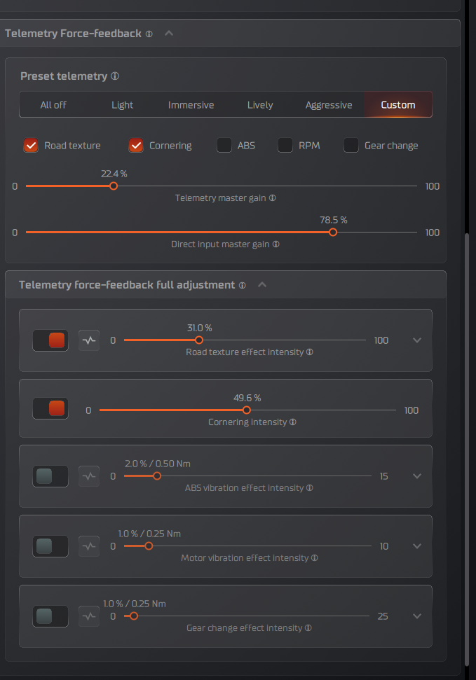 >>50615593 > Ванильный фидбек корсы он вообще пустой. Нет ощущения "зацепа" и "скольжения" передней оси. Крайне слабые вибраций по езде по неровной трассе. Нет вибрации от холостого хода двигателя. Ты просто не умеешь настраивать. Всё там есть. А эта хуйня твоя — это хуйня, какие-то искусственные хаптик-эффекты.