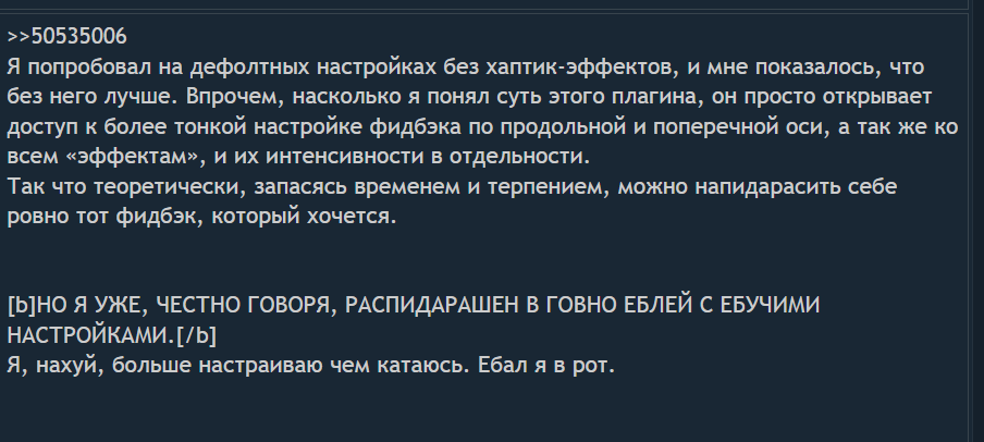 >>50637428 >Чому глючные? Тому. Что копирасты, котоые не умеют и не хотят в файнтюн того, что исполнили в железе. Там "глюки" лежат в другой плоскости, которая тебе пока недостуупна. ФФБ хуячит - уже збс. >Я заметил только на 100% фидбеке микрофризы после 2-3 часов езды, фиксится понижением до 85%. ЮВо-во фризов нет уже супер. >Ну а что вот ты можешь предложить, просто интересно. Какой сетап? Мидл-сегмент начинается с мозы. Банально. Ничего так-то не поменялось пока. Даже б/у моза будет более выгодным и ровным девайсом, нежели все остальное, что пытается хоть как-то вскарабкаться на её пъедестал. Проблема в том, что раньше симресерским железом торговали профильные площадки. А теперь у нас "рынок-черкизон" в виде маркетплейсов. Где любую дичь и паль могут толкать под видом годноты. Ну и сетевики со своими "народными решениями" не отстают.