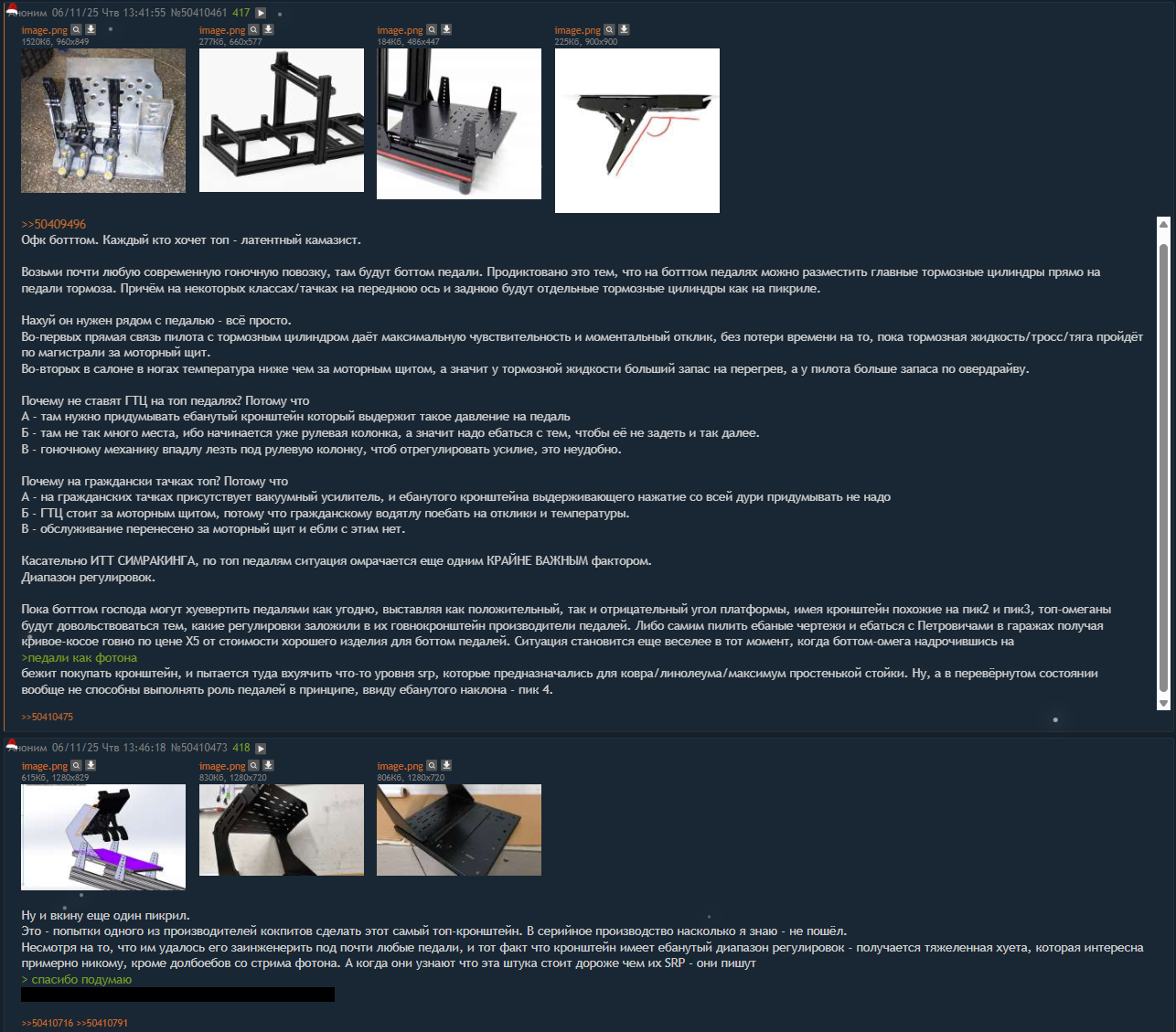 Короч докладываю. Около месяца пользую пикрил. Изначально привлекла возможность быстро сложить это все и поставить в угол, а мне такое и надо. Заказывал, ожидая, что это будет фейл и улетит в помойку. Воткнул по итогу на него мозу R12, хотя думал, что оно и 3нм не вывезет. Внезапно, оно оказалось удобным по посадке и, с некоторым пердолингом, вывозит базу. Из пердолинга. Отмеченное красным место разъемное и предполагает, что эту перекладину можно откидывать в сторону, шобы удобно в это залезать. Соединение хлипкое и люфтило, потому пришлось загнать туда кусок трубы чуть меньшего диаметра и залить эпоксидкой. Теперь оно не размыкается, зато никаких люфтов. Но залезать приходится сверху. Ну и кладу 20кг блин обрезиненный на место, отмеченное черным, чтобы вся эта хуйня не поднималась, когда продавливаю тормоз до конца. В остальном, за те смешные копейки, которые за это просят, оно збс. Немного не хватает жесткости перекладины под базу по продольной оси, но это в общем-то похуй. Я в виаре этих колебаний даже не замечаю. По поперечной оси, в которой, собсна, крутится руль, жесткость ок. В общем, складная китайская хуйня за 10к оценивается мной в 10/10 по соотношению ожидал/получил. А еще через нее виброэффекты ффб хорошо передаются прямо в жеппу.