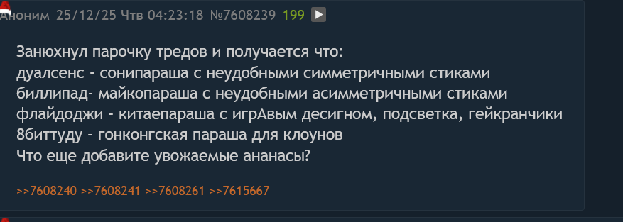 >>50636869 >Похуй существует, и он уже лучше лохотека, Да. Существует. Но в области полноценных симрейсерских девайсов - пока нонейм. Лохотек никогда ранее и не лез в про-сегмент. Они владели массмаркетом. Если с этой точки зрения, то да, похукен в массмаркете для казуал-подпивасов уделывает лохотек. Тут спору нет. Но в контексте треда - это пока нонейм чудо с самого дна лишь слегка оторвавшееся и начавшее всплывать. >обычный китайский середнячок на уровне мозы, Моза, как производитель узконаправленного симрейс-железа - впереди пхн чудоделов на две головы. У мозы уже таки есть стратегия развития линеек, есть дизойн, есть коллаборации. У пхн пока мешанина из натыреных решений. Зато дешман.