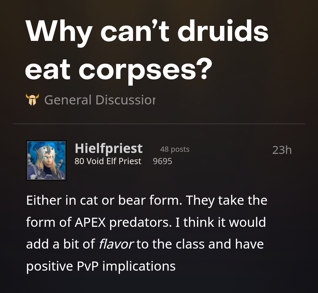 >>50478319 Газонюх и чмаг всегда такими были и будут. Чисто классы для протыков, чтобы крутить за них комбо-вомбо в ПвП и снимать про это видосики. В остальную игру они не играют, поэтому близзюки и не дизайнят эти классы под неё.