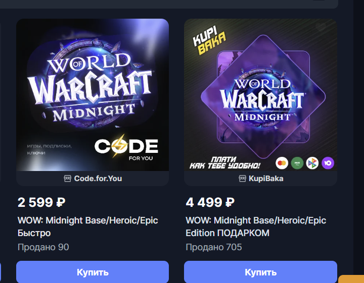 >>50499575 Можно зарегать новый акк, пойти на веселоплати и там аддон купить, типа, на новый акк. Время можно тайм-картами пополнять без проблем. Они там же есть. Стоит ~1200р/мес Ценники сам смотри че там. Да и сильно зависит берешь tww нынешний и почти кончившийся или предзаказ миднайта.