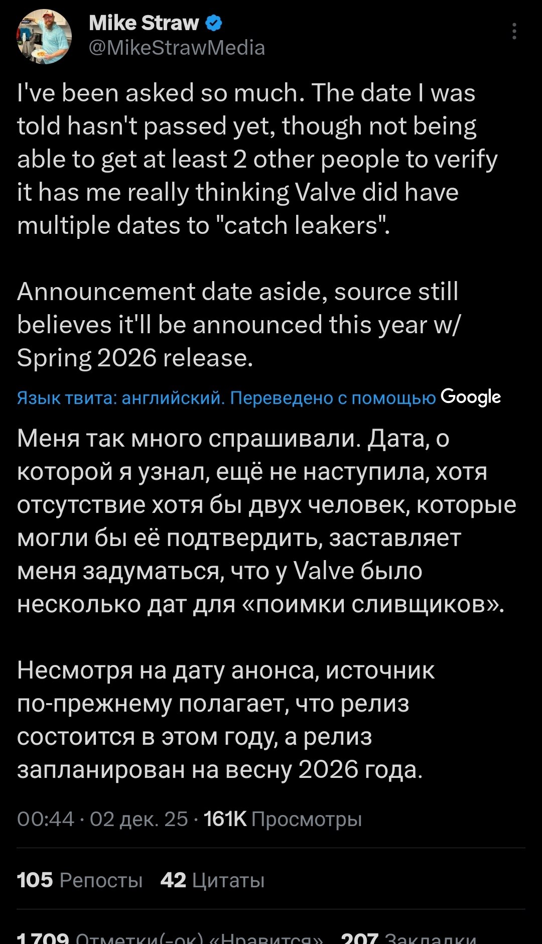 "Deadlock, TF3, L4D3 and HL3 announcement first week of DEC. All being released in 2026, starting with Deadlock in Q1, HL3 in Q2, L4D3 in Q3 and TF3 in Q4 TF3 is going to be a replacement for TF2 with S2 engine; just like they did with CS:GO > CS2