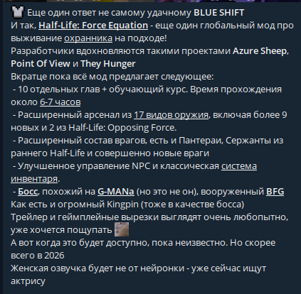 Тут, кстати, слышал, что какие-то обзорщики мошнили на то, что автор использовал ИИ для озвучки новых фраз в стиле персов из ХЛ1. А почему нет, собственно? Ладно доебаться до этого в платной игре какой-то, но здесь-то это реально аутентично. Мне норм. Не текстурная нейромережа и хорошо.