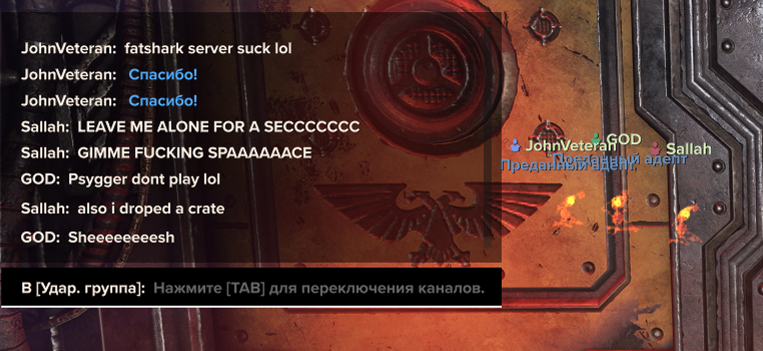 >>50474057 (OP) Что за дела. Почему я не могу отправлять свои высеры в чат? Набираю текст, жму ентер и нихуя не происходит. При этом все спокойно общаются, один даже пишет гигантскими розовыми буквами на полэкрана, блядь, а мне нельзя даже обычными. Хотя команды в духе спасибо и нужны патроны работают и отправляются.