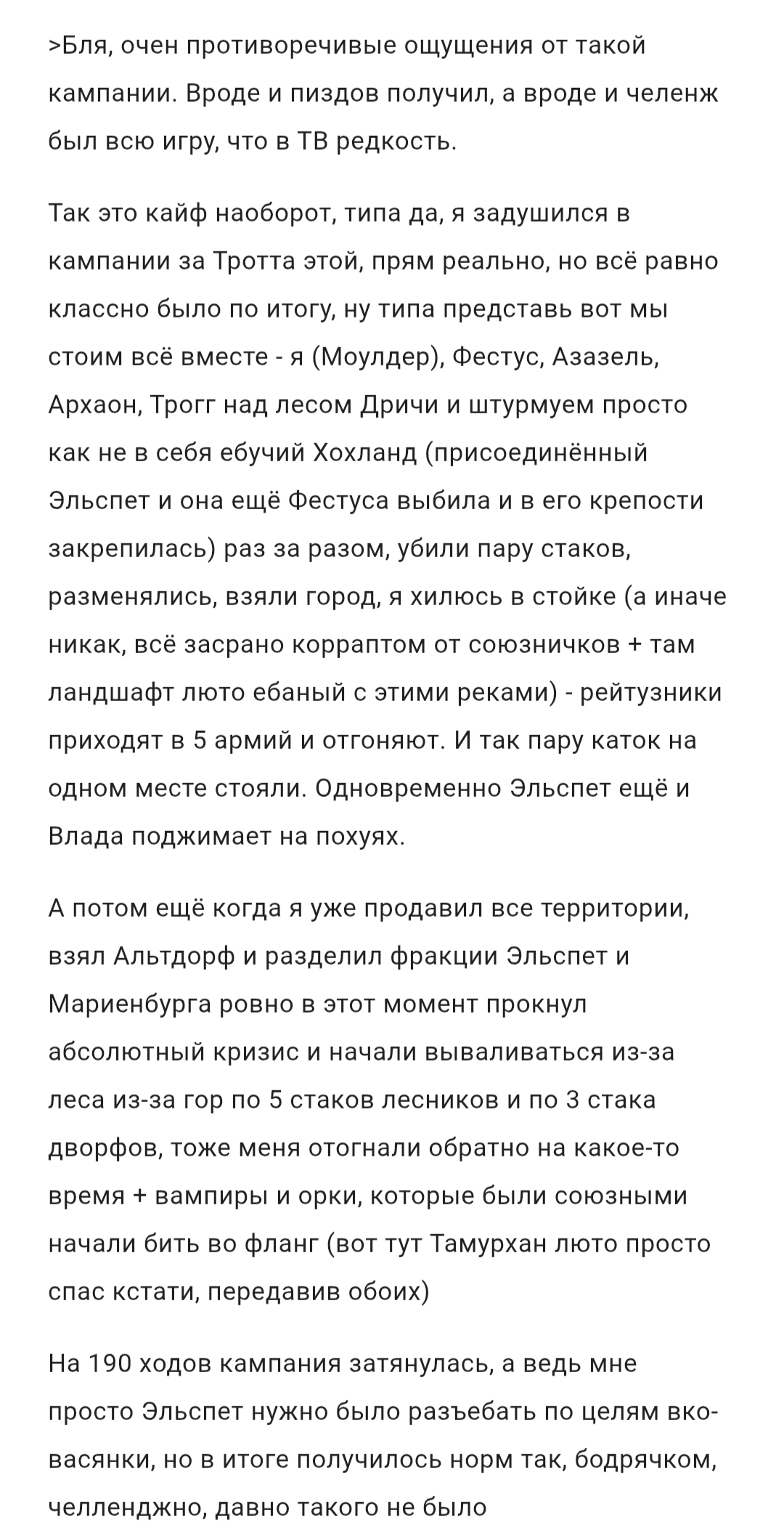 >>50500577 >нет. потому что это занимает буквально первые пять семь ходов в зависимости от фракции, что полчаса игры если не автобатлить, после чего начинается тв Если ты уже не первый раз играешь то это полчаса одинаковой эуйни, задроченной до автоматизма, найс. После чего начинается не тотал вар, а одни и те же стартовые враги, которые тоже задрочены до автоматизма. >даже на примере " унылого " тириона хуйню несешь какую-то. у тебя банально как и у большинства эльфов есть вариант брать или не брать меч кейна в будущем Пиздец выбор, найс. Уныл Тирион и Теклисом полным отсутствием своих механик до нынешнего длц из-за чего я в рот ебал ими играть. И учитывая, что разрабы таки сделали им механики, я такой был не один. >восемь сторон света со старта, иди куда хочу делай что хочу пизди кого хочешь союзничай с кем хочешь враждуй с кем хочешь А васянки только добавляют насыщенности твоему плыви и делай че хочешь. Вот я Айслинн, хочу лорно приплыть разъебать Мариенбург. Ты предлагаешь мне убить минорчика? Вау, ахуеть. А я поставлю васянку на Мариенбург и это будет нормальная заруба с ограблением морских конвоев и полноценной войной с уникальной фракцией. >ты не мы если что А ты это мы что ли? >ну ты дохуя понятливый пожиратель васянок получается который видит цель не видит препятствий, вариативности оказывается не завезли Достаточно аргументировал свою мысль по моему
