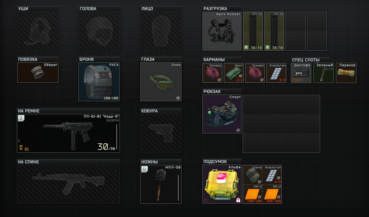 Если супер ирли гейм до 15 лвл и у тебя нихуя нет, то покупается самый дешман броник 2 класса (чтобы не ваншотнуться от мясных патронов ботов), уши гсш и любой стреляющий кал (кроме ТОЗика). По мне так сейчас мета глока у механика - на 3 тыщи дороже всего лишь, чем ПМ, но в разы круче. Разгруз - самый дешман, рюкзака нет. Я люблю приправить сверху панамой и усами. Два жгута, два бинта (и жгуты и бинты у скупщика дешёвле всего), что-то на похил. Регаешь любую карту, хоть квестовую, убиваешь цель - обнюхиваешь, скидывая с себя кал, и заменяя на кал получше. Далее либо находишь имбу диких в виде полуавтоматического дробовика/вепрь хантера, либо ёбаешь случайного чвк и скорее всего облутав его у тебя уже будет около топ гир.