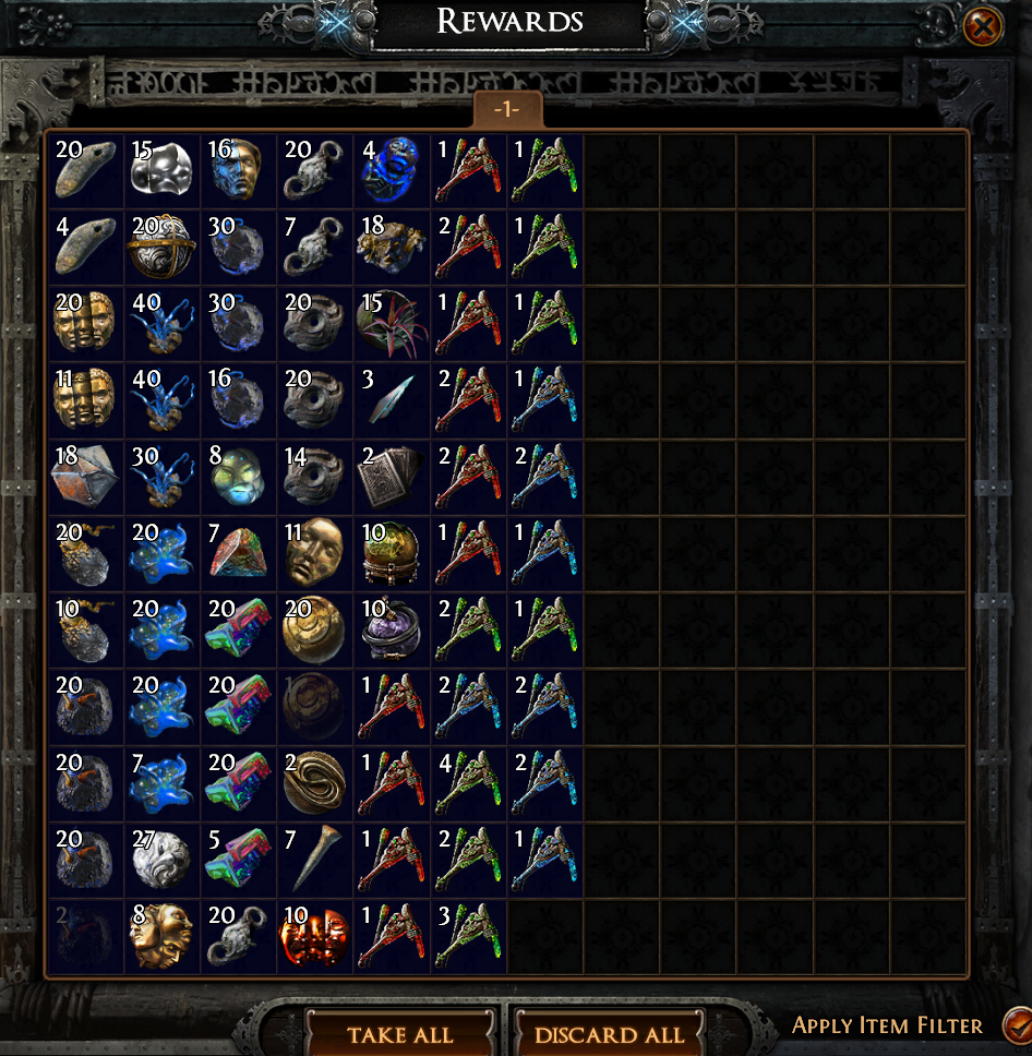 дропнул менее чем через неделю лиги харбинжер, харверс, ритуал, эспедиция, скорж, сентинел, архнемезис, санктум, наемники в остальные больше месяца играл