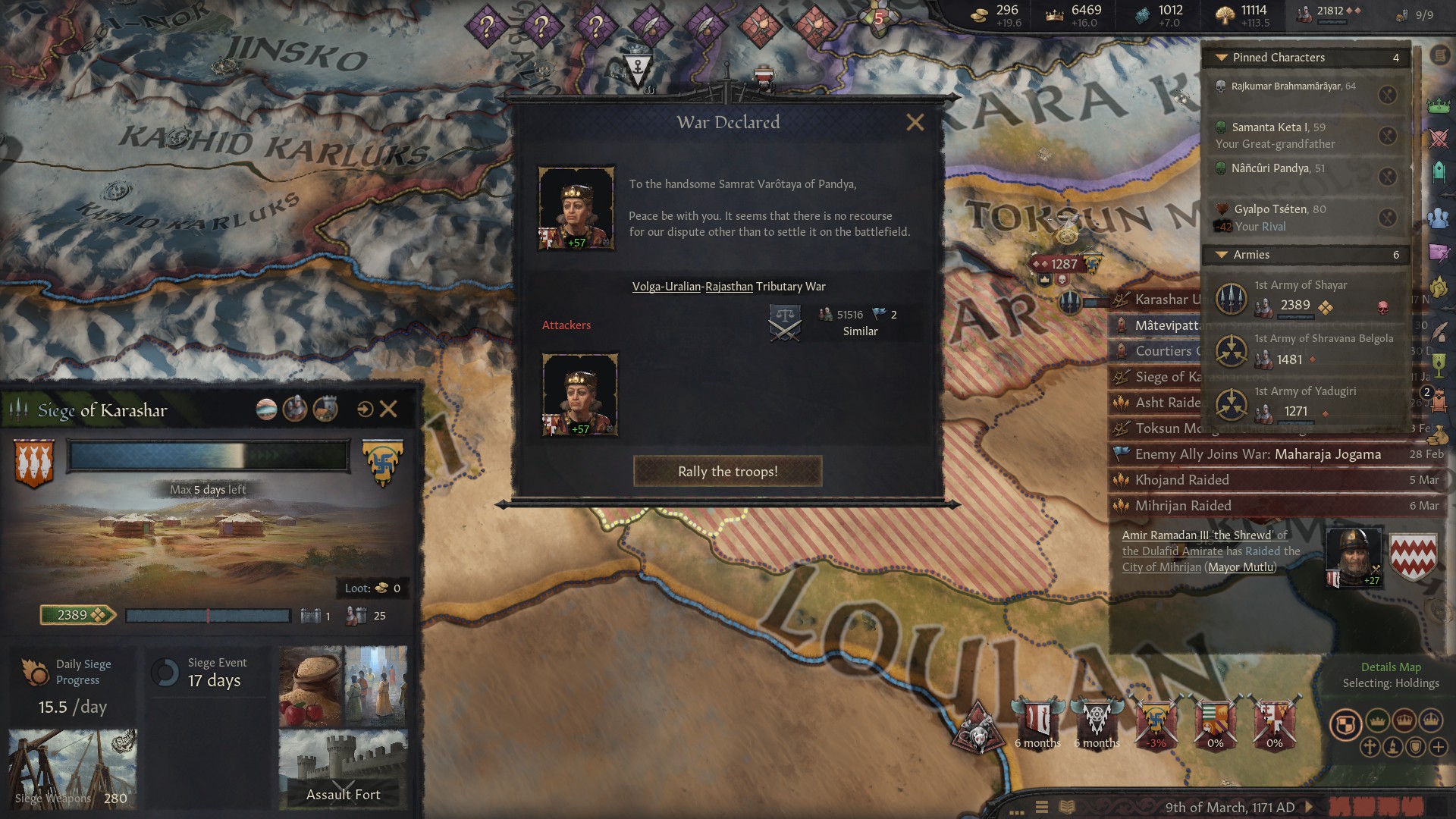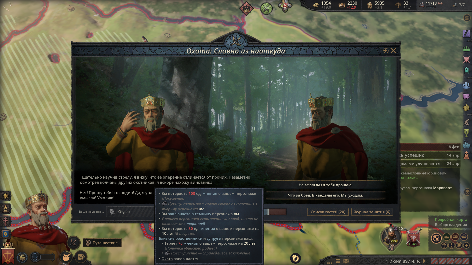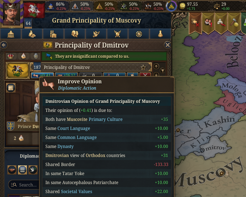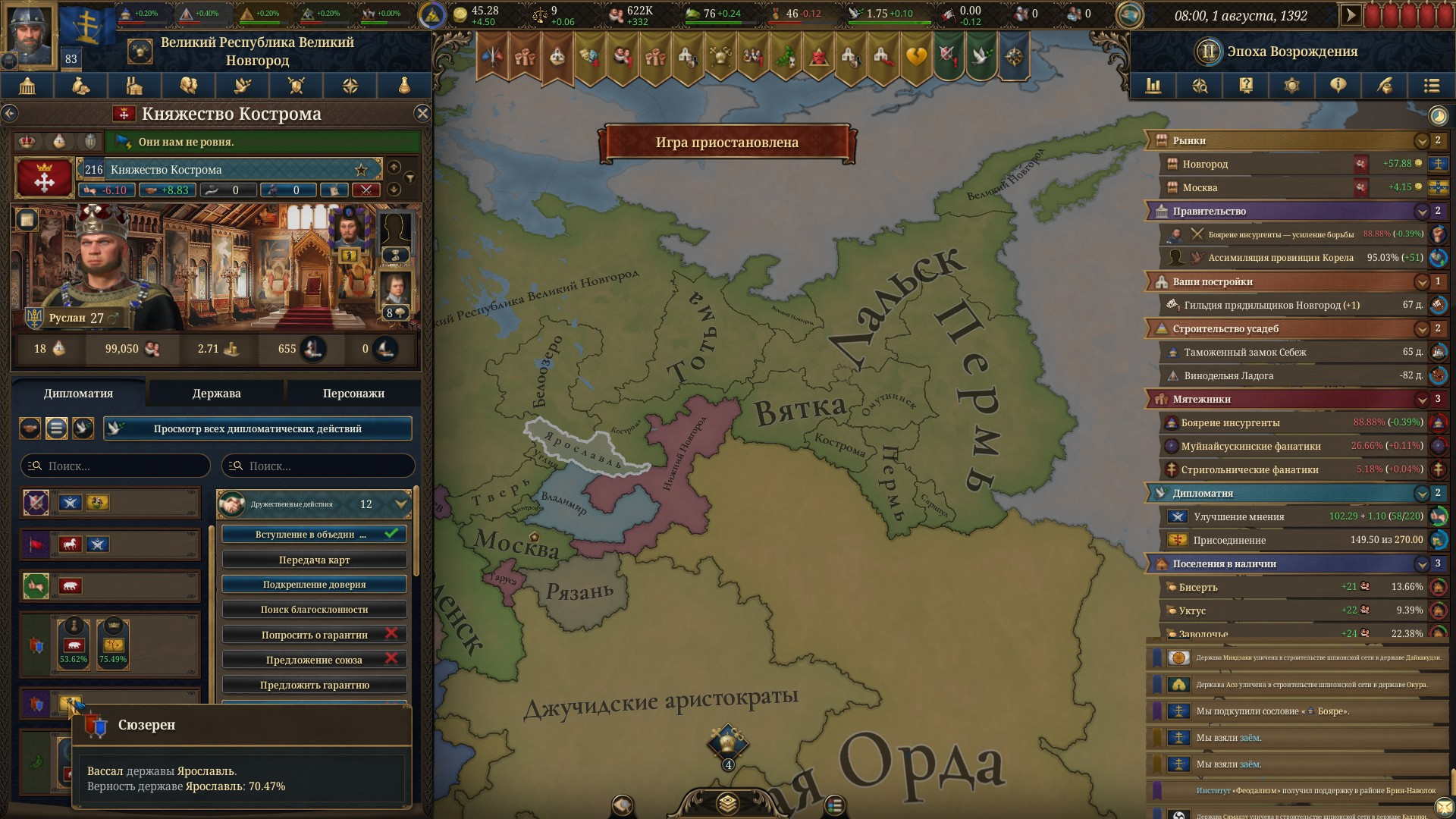 И так бывает оказывается? У меня мой вассал Ярославль сам завассалил Кострому, а под Костромой были Вятка, Москва, и остатки Перми, которые я не успел захватить. Удобно. Бтв обратите внимание на моих мятежников. Игра уже несколько лет хуярит мне негативные ивенты. 7 или 8 подряд негативных ивентов было. Меня бояре стали ненавидеть, и я в долги залез на 1100 рублей. Я даже не знаю что больше меня удивило, такой стрик негативных ивентов или халявные вассалы.