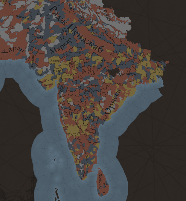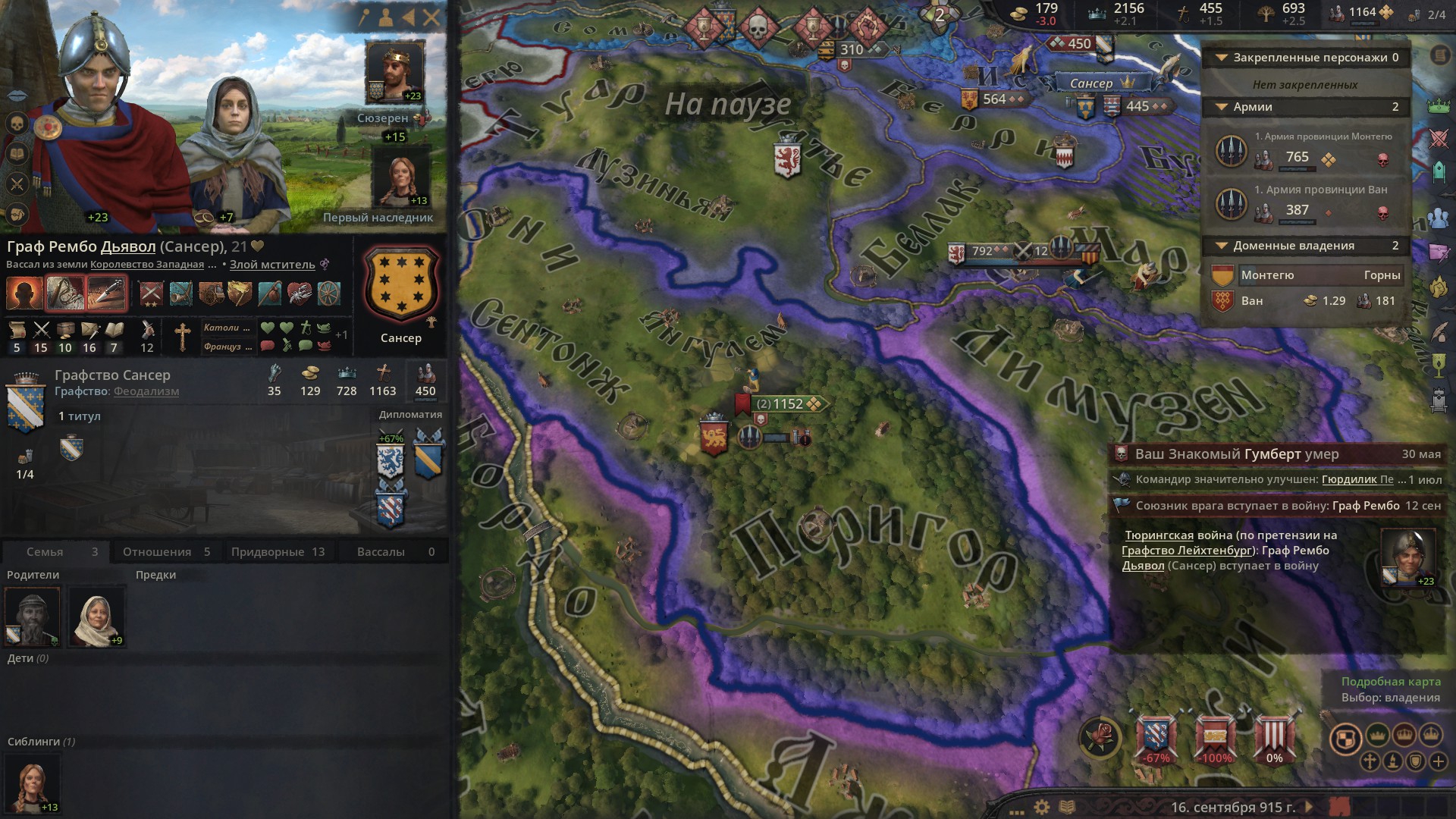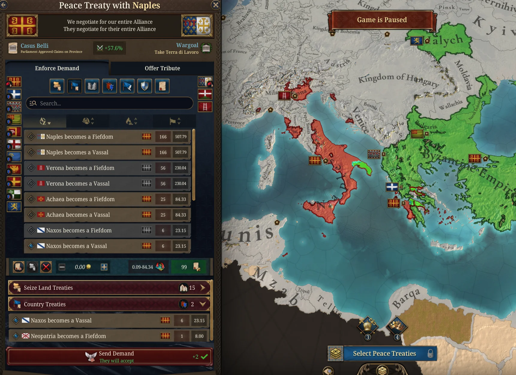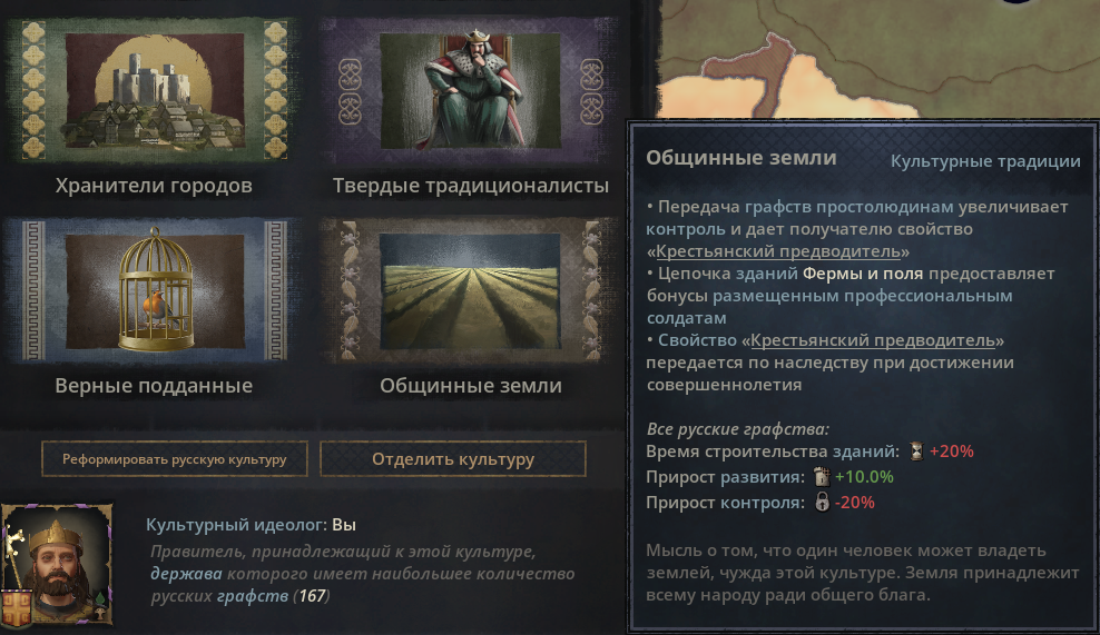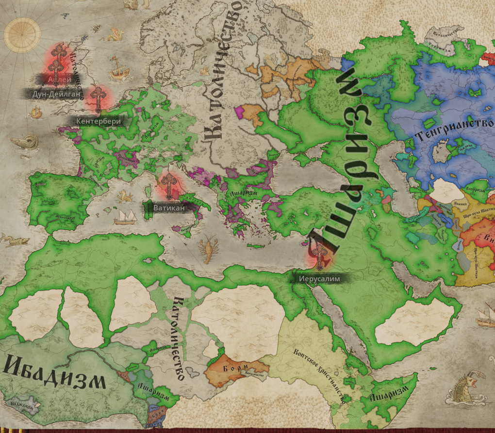 Вышел новый патч, и по ощущениям красить стало еще сложнее, ведь ленники еще менее лояльны, чем раньше, особенно при развитой централизации. У меня всего два маленьких феода (Корсика и Крым), но у обоих лояльность не превышает 36%. Получается, большинство территорий придется так или иначе самостоятельно интегрировать, а потом еще и заниматься их культурой и религией, что геморно.