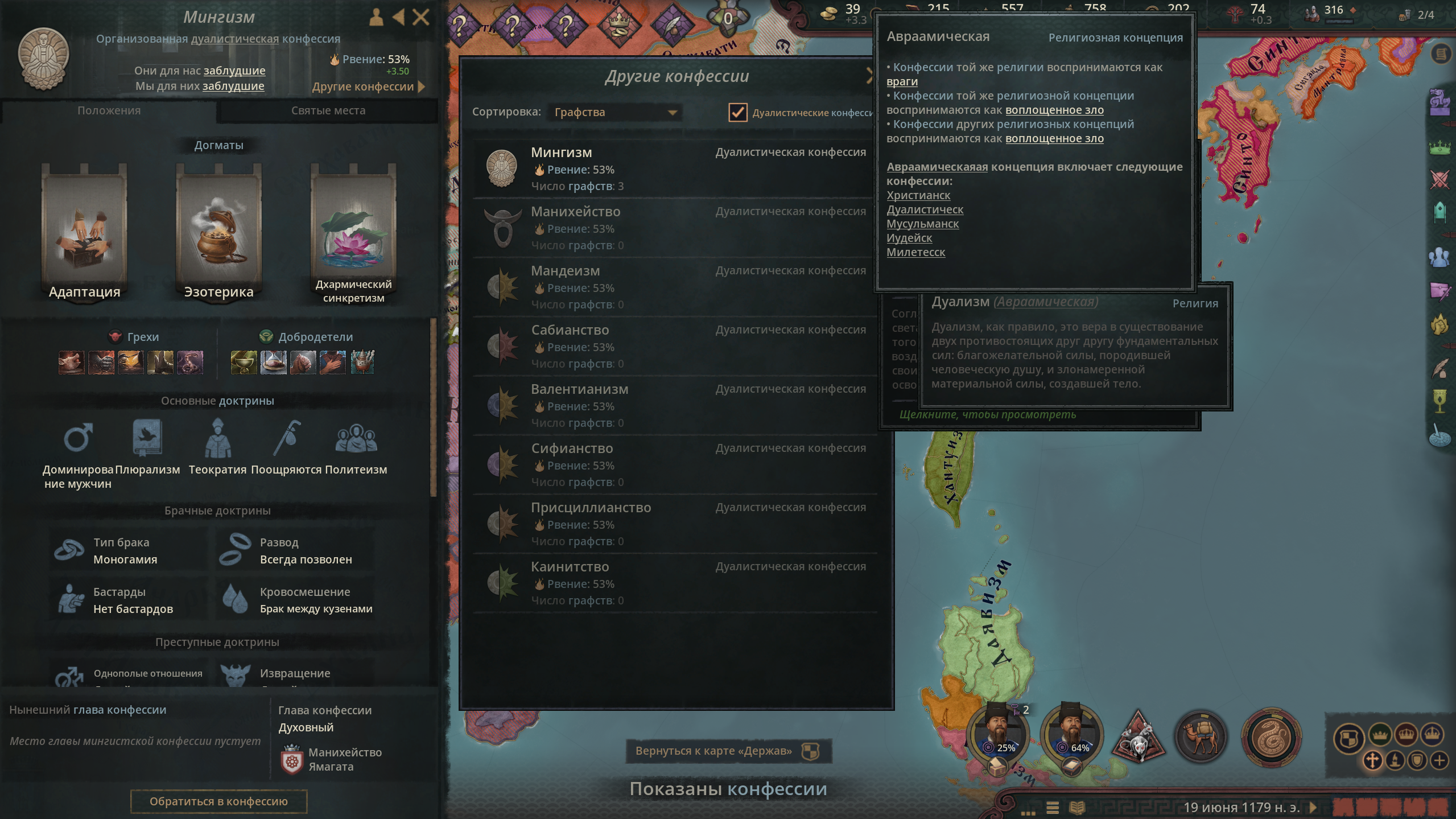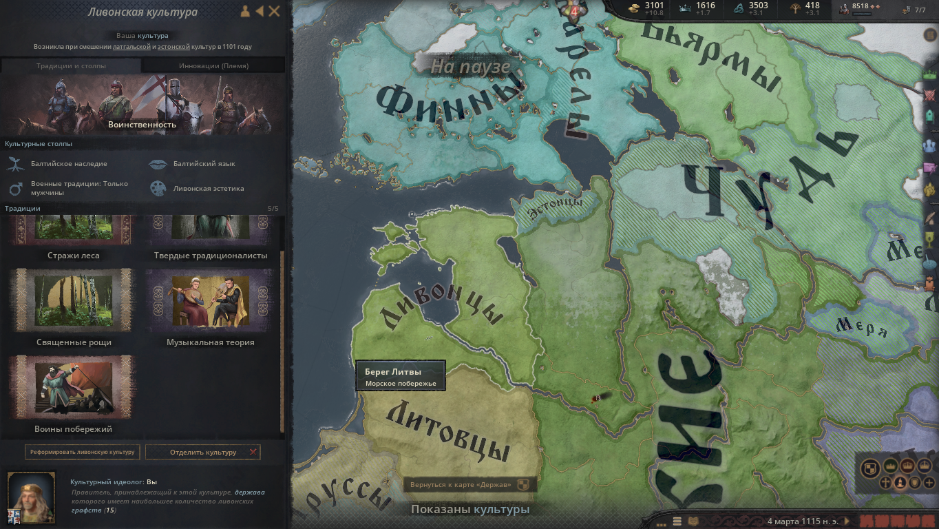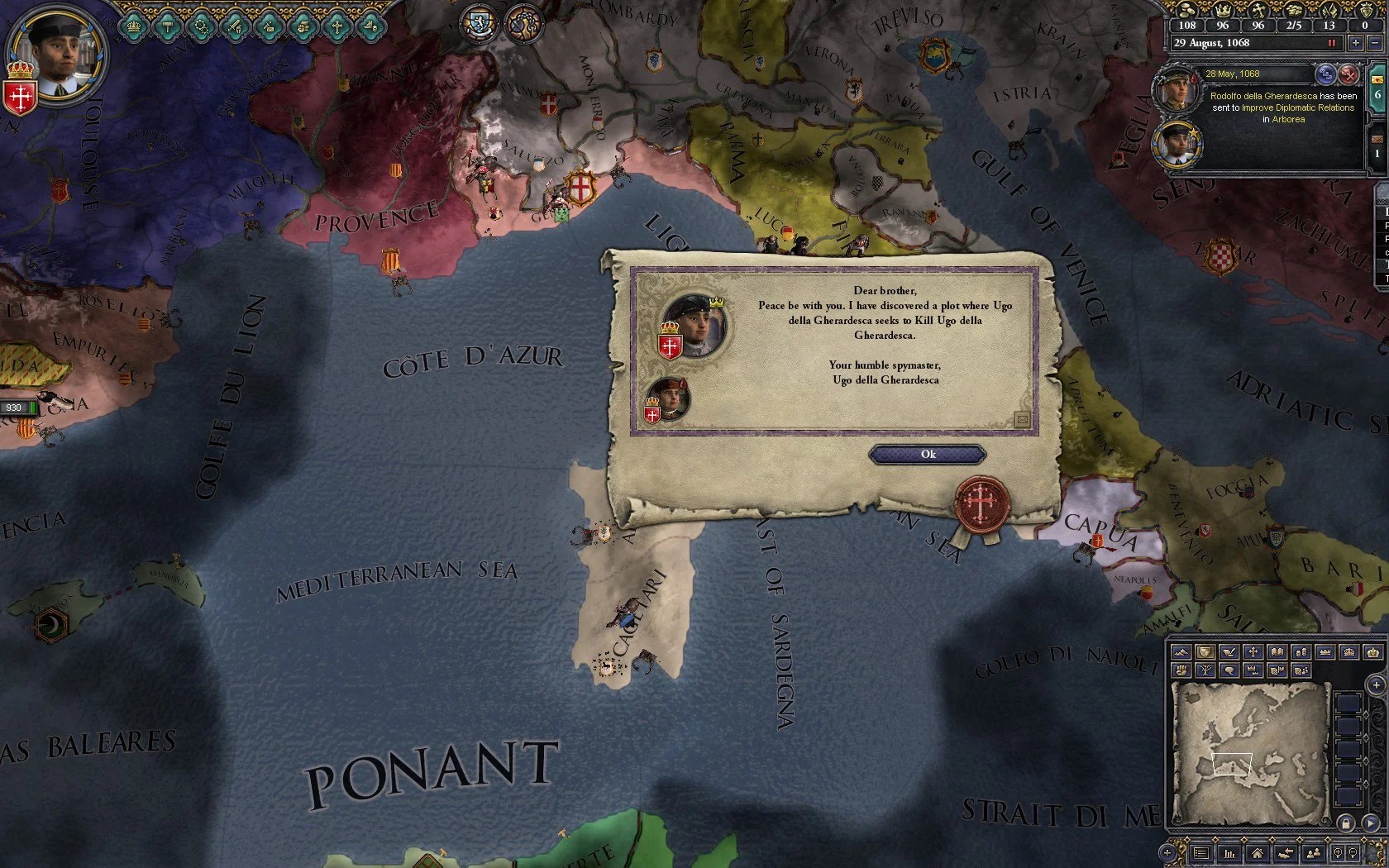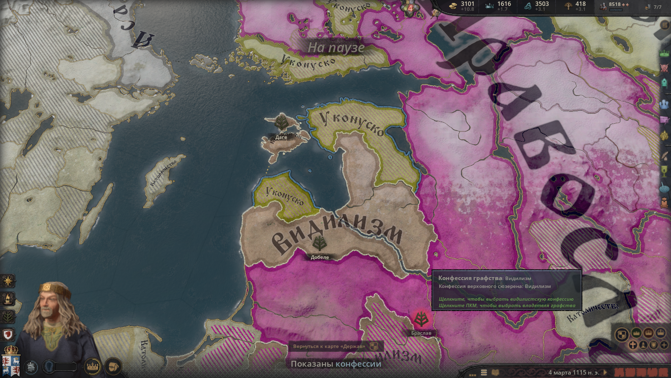 Вышел новый патч, и по ощущениям красить стало еще сложнее, ведь ленники еще менее лояльны, чем раньше, особенно при развитой централизации. У меня всего два маленьких феода (Корсика и Крым), но у обоих лояльность не превышает 36%. Получается, большинство территорий придется так или иначе самостоятельно интегрировать, а потом еще и заниматься их культурой и религией, что геморно.