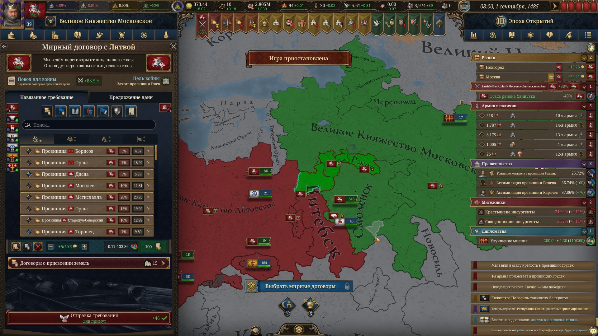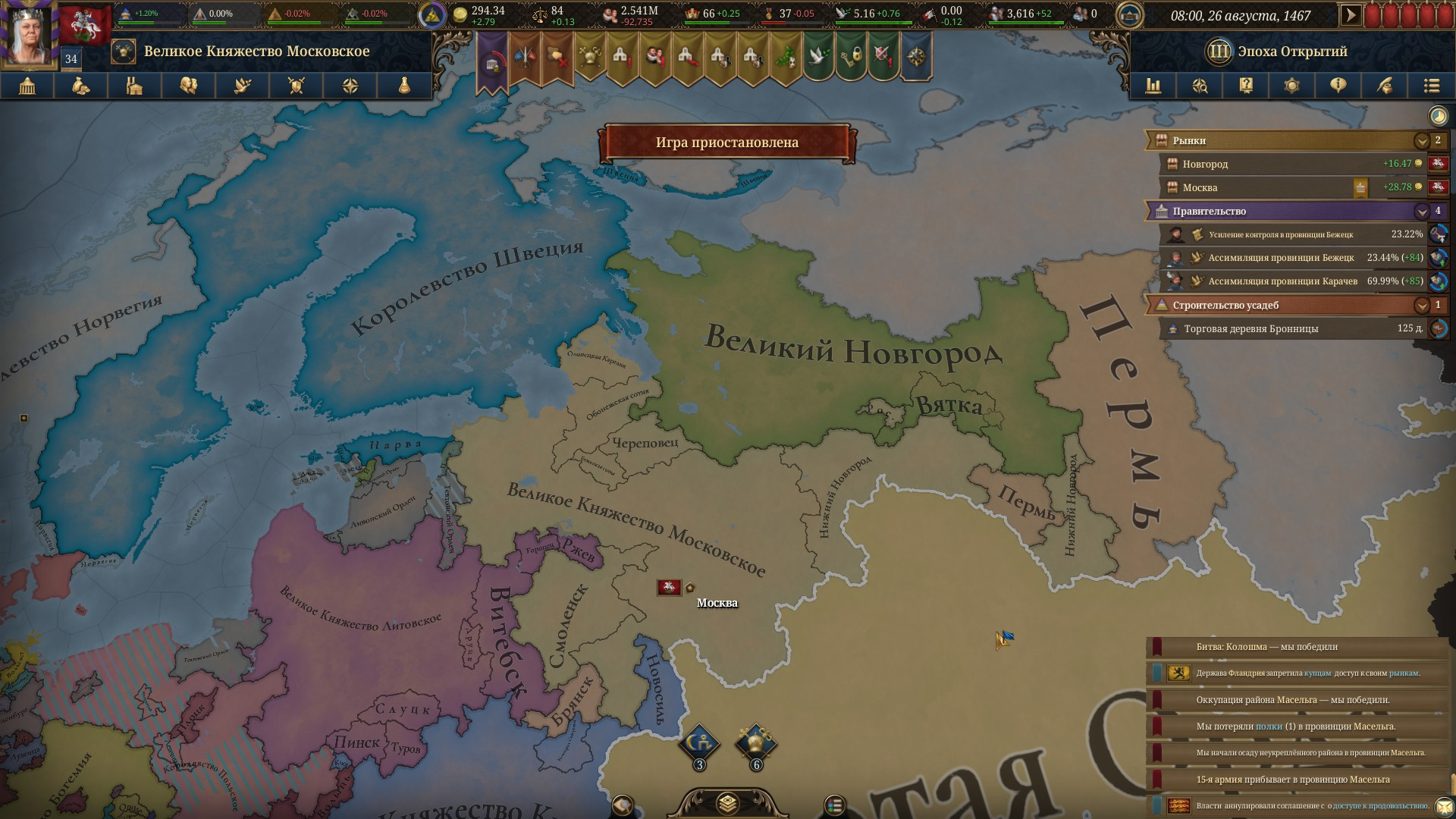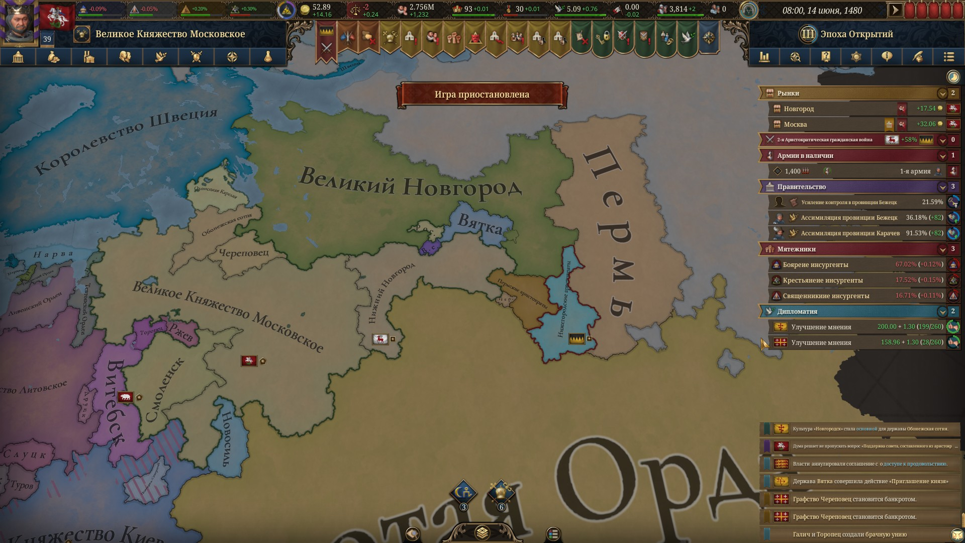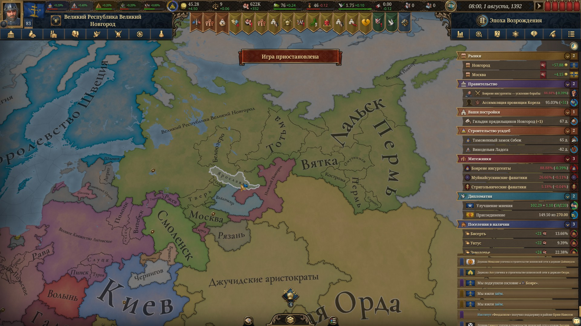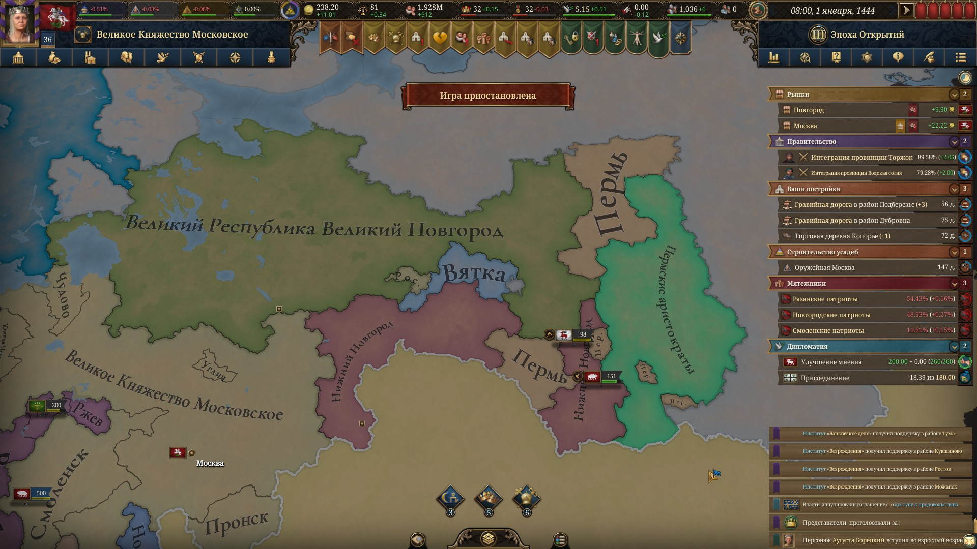 Очень удобно получилось. Новгородские патриоты затеяли бунд и за них вписался Новгород(у которого давно нет Новгорода) и у меня получилось еще отобрать у него территории, на которых правда нет ничего, кроме тундры. Но хотя бы на меня никто из соседей не начал бугуртить и собирать коалиции. Как же надоедает порой мирится с этой игровой условностью. В реальном мире Иван 3 за две войны захватил все земли Новгородской республики, а я отвоевал уже третью, и будет еще 4 и не факт что на 5 я все захвачу, может еще 6 будет. И это даже не развитые земли, это ебаное ничего на границе с вечной мерзлотой, но я все равно должен это десятилетиями чистить.