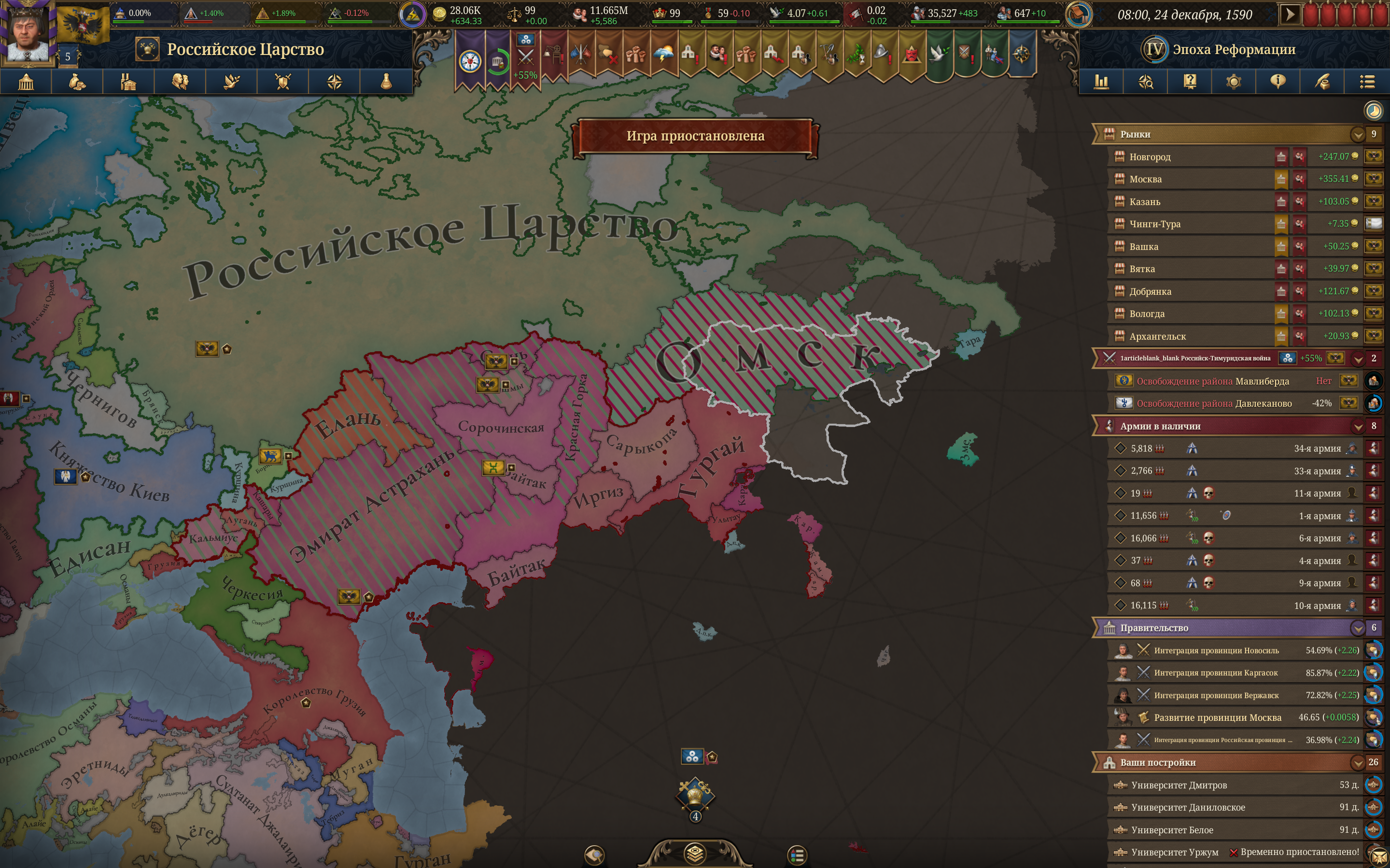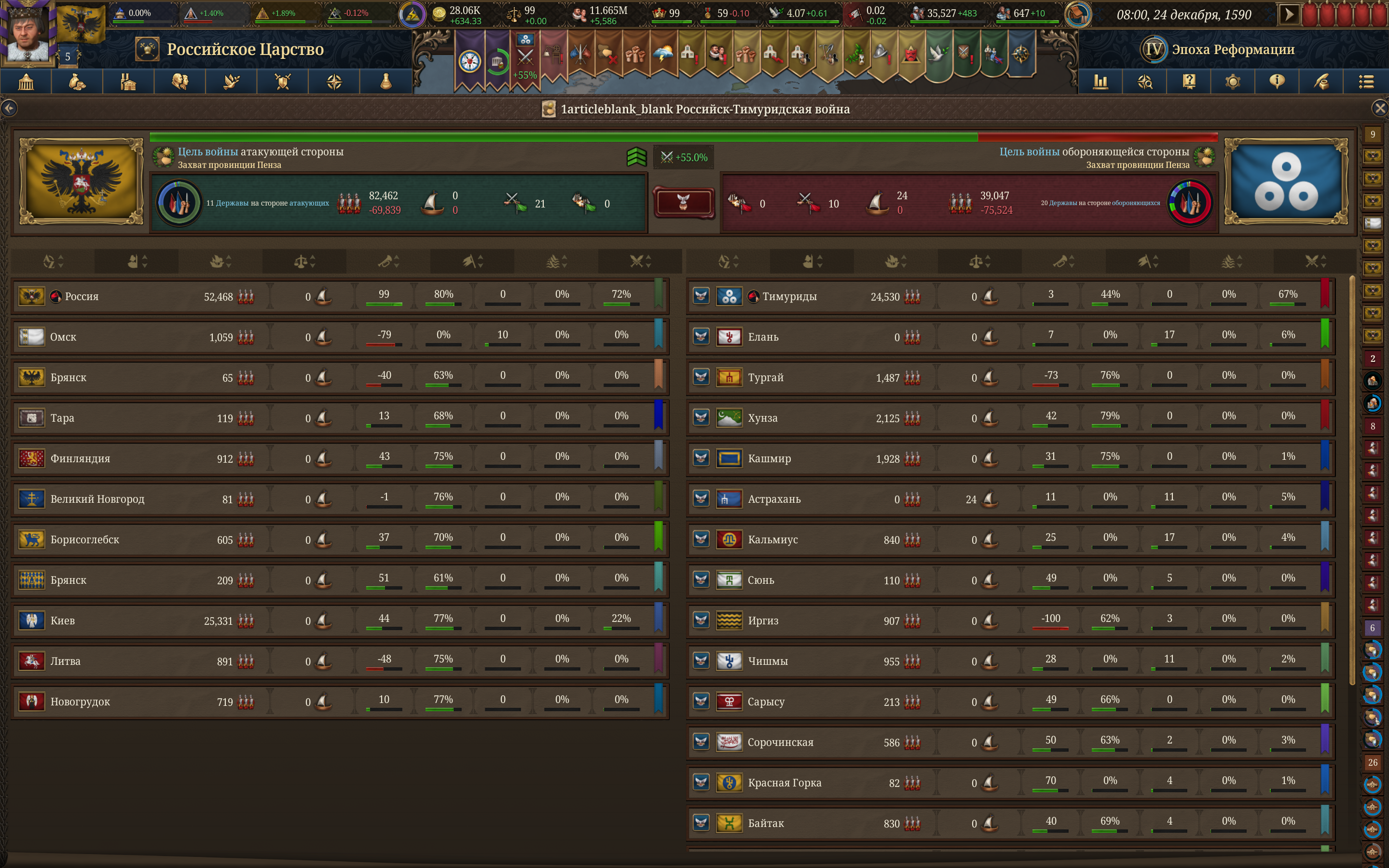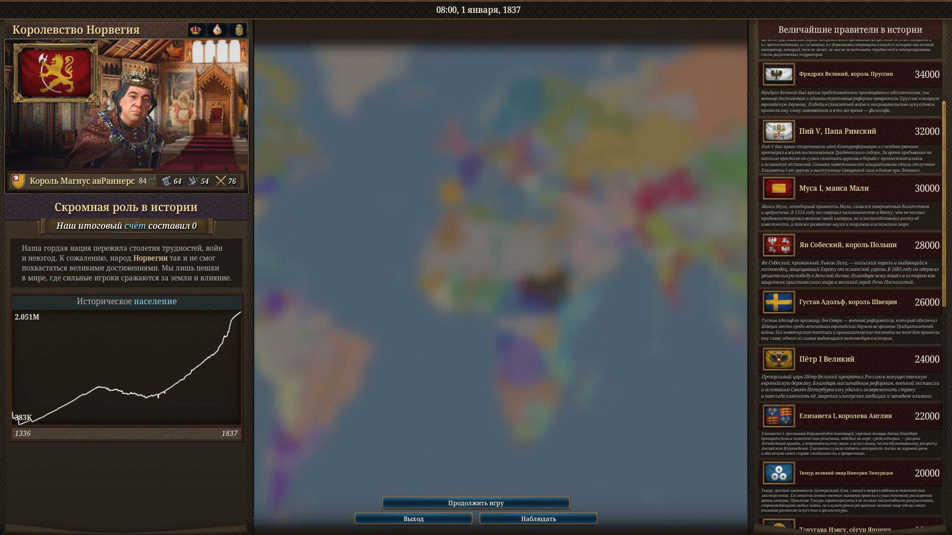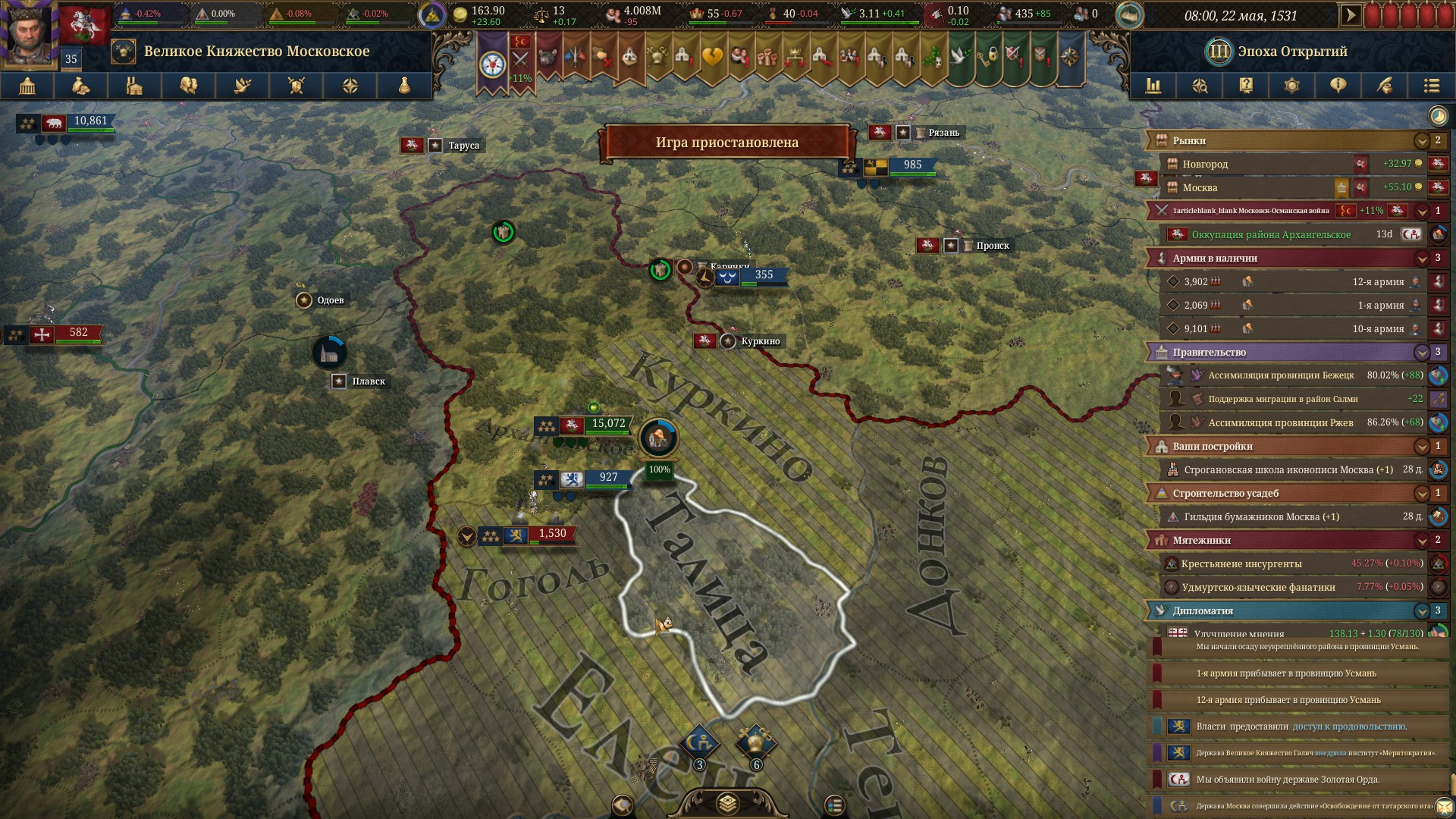 Очень удобно получилось. Новгородские патриоты затеяли бунд и за них вписался Новгород(у которого давно нет Новгорода) и у меня получилось еще отобрать у него территории, на которых правда нет ничего, кроме тундры. Но хотя бы на меня никто из соседей не начал бугуртить и собирать коалиции. Как же надоедает порой мирится с этой игровой условностью. В реальном мире Иван 3 за две войны захватил все земли Новгородской республики, а я отвоевал уже третью, и будет еще 4 и не факт что на 5 я все захвачу, может еще 6 будет. И это даже не развитые земли, это ебаное ничего на границе с вечной мерзлотой, но я все равно должен это десятилетиями чистить.