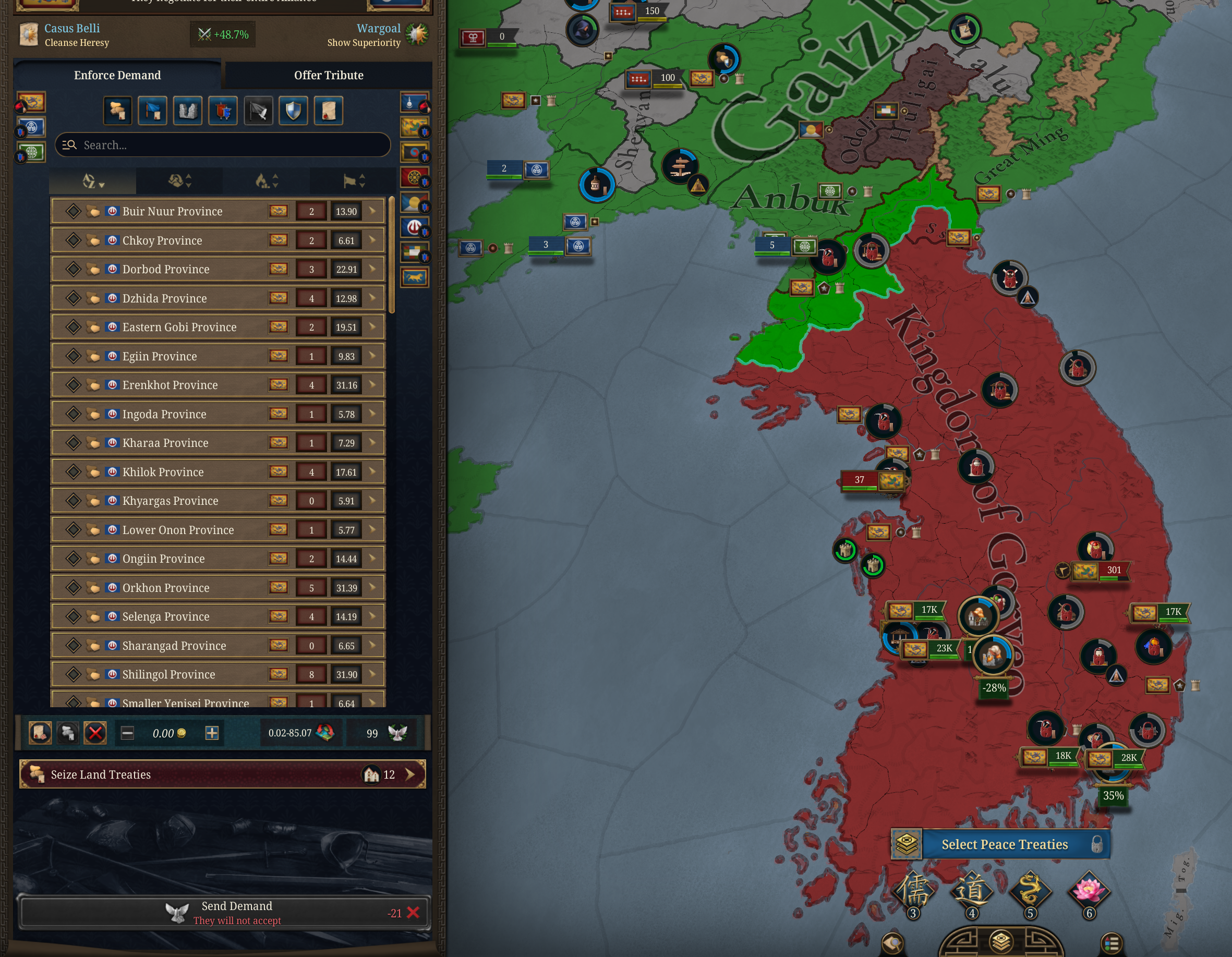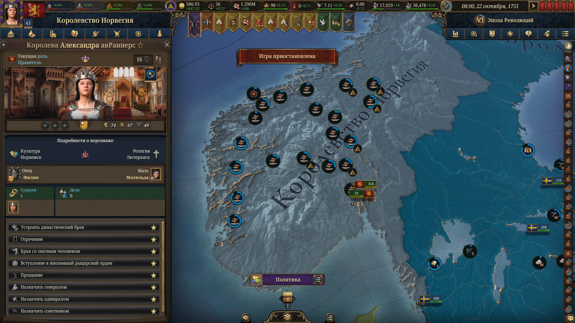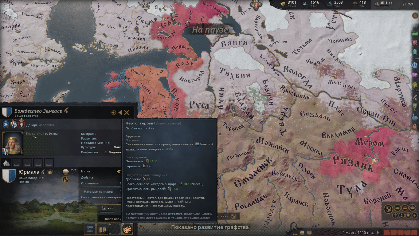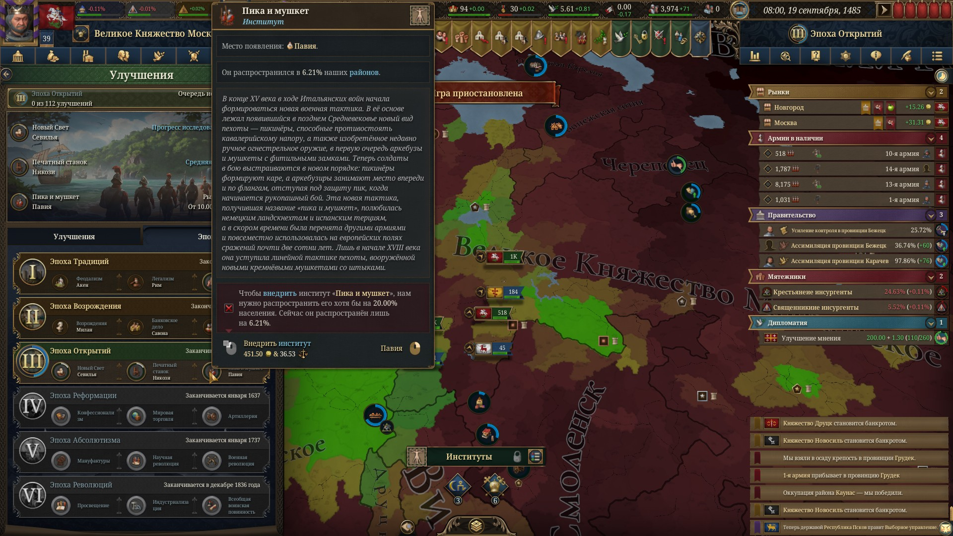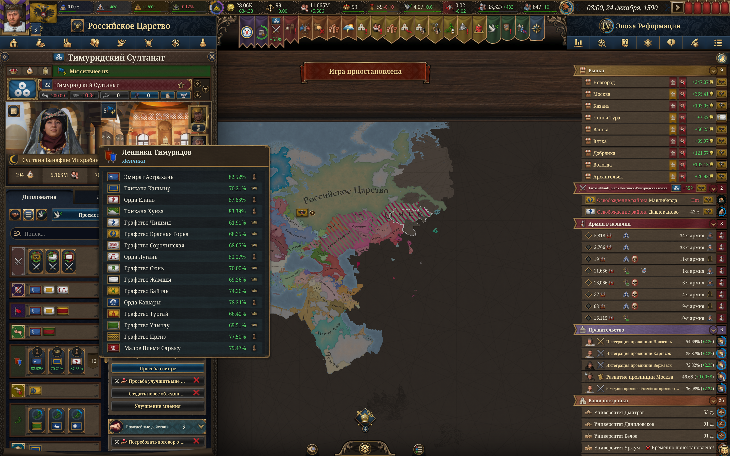 Очень удобно получилось. Новгородские патриоты затеяли бунд и за них вписался Новгород(у которого давно нет Новгорода) и у меня получилось еще отобрать у него территории, на которых правда нет ничего, кроме тундры. Но хотя бы на меня никто из соседей не начал бугуртить и собирать коалиции. Как же надоедает порой мирится с этой игровой условностью. В реальном мире Иван 3 за две войны захватил все земли Новгородской республики, а я отвоевал уже третью, и будет еще 4 и не факт что на 5 я все захвачу, может еще 6 будет. И это даже не развитые земли, это ебаное ничего на границе с вечной мерзлотой, но я все равно должен это десятилетиями чистить.
