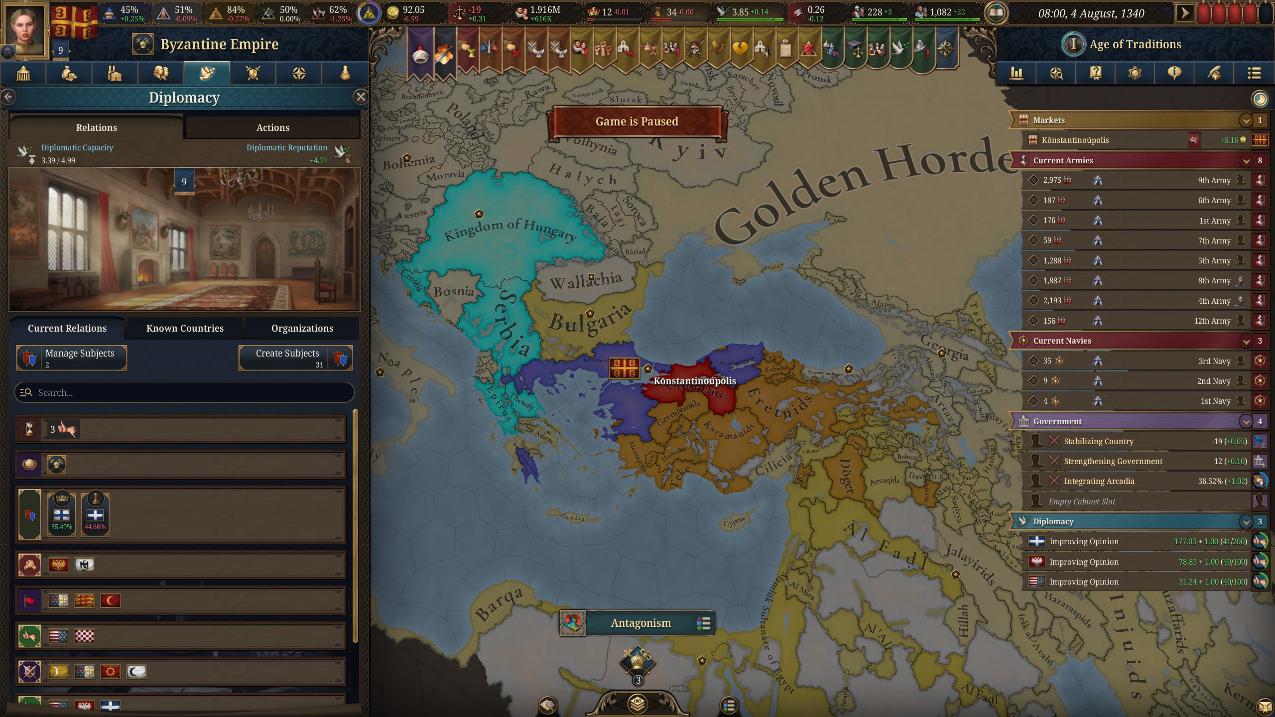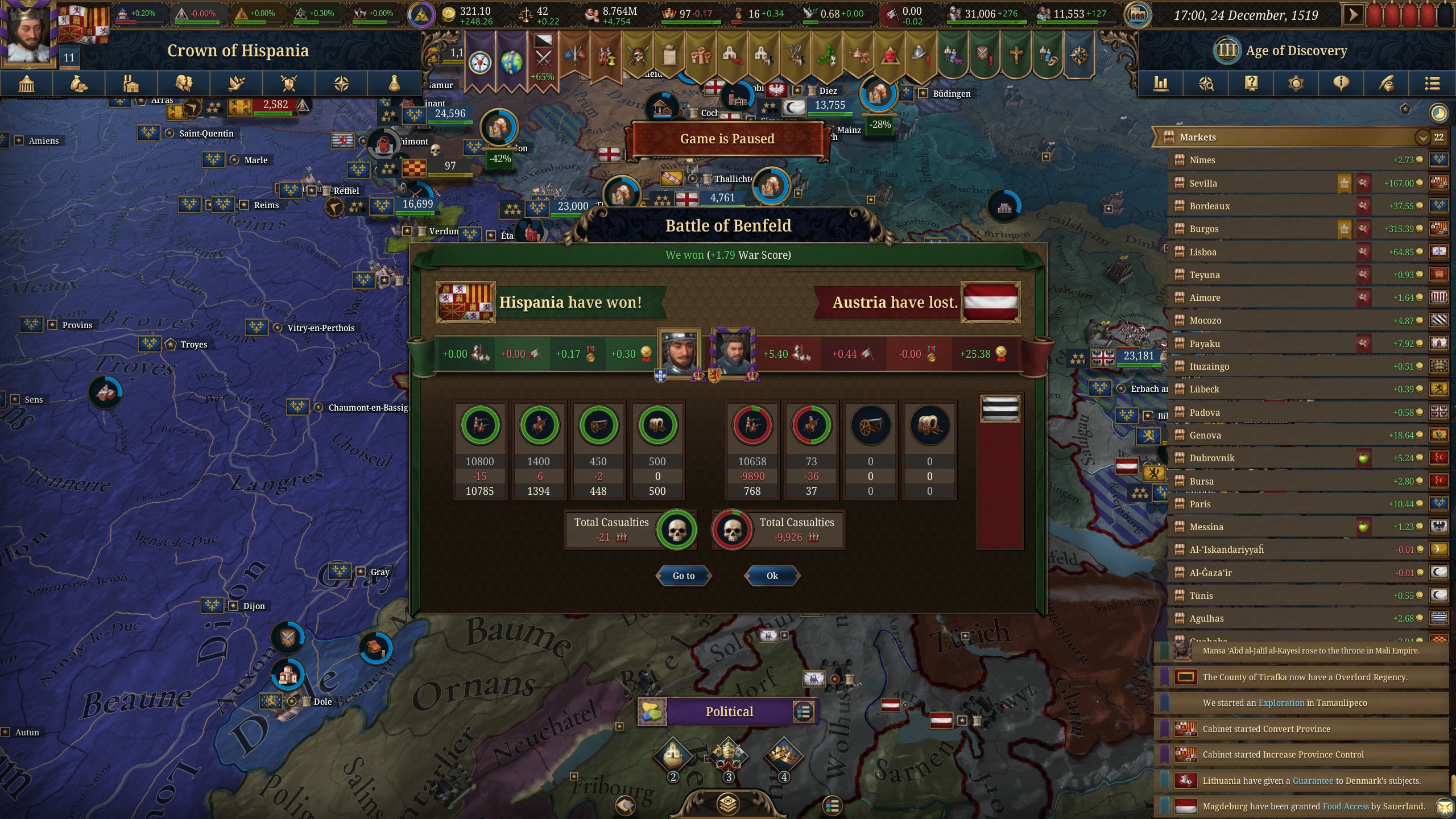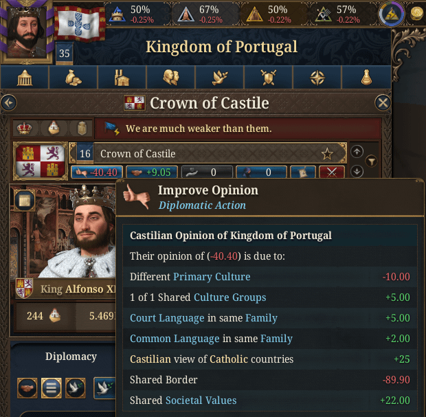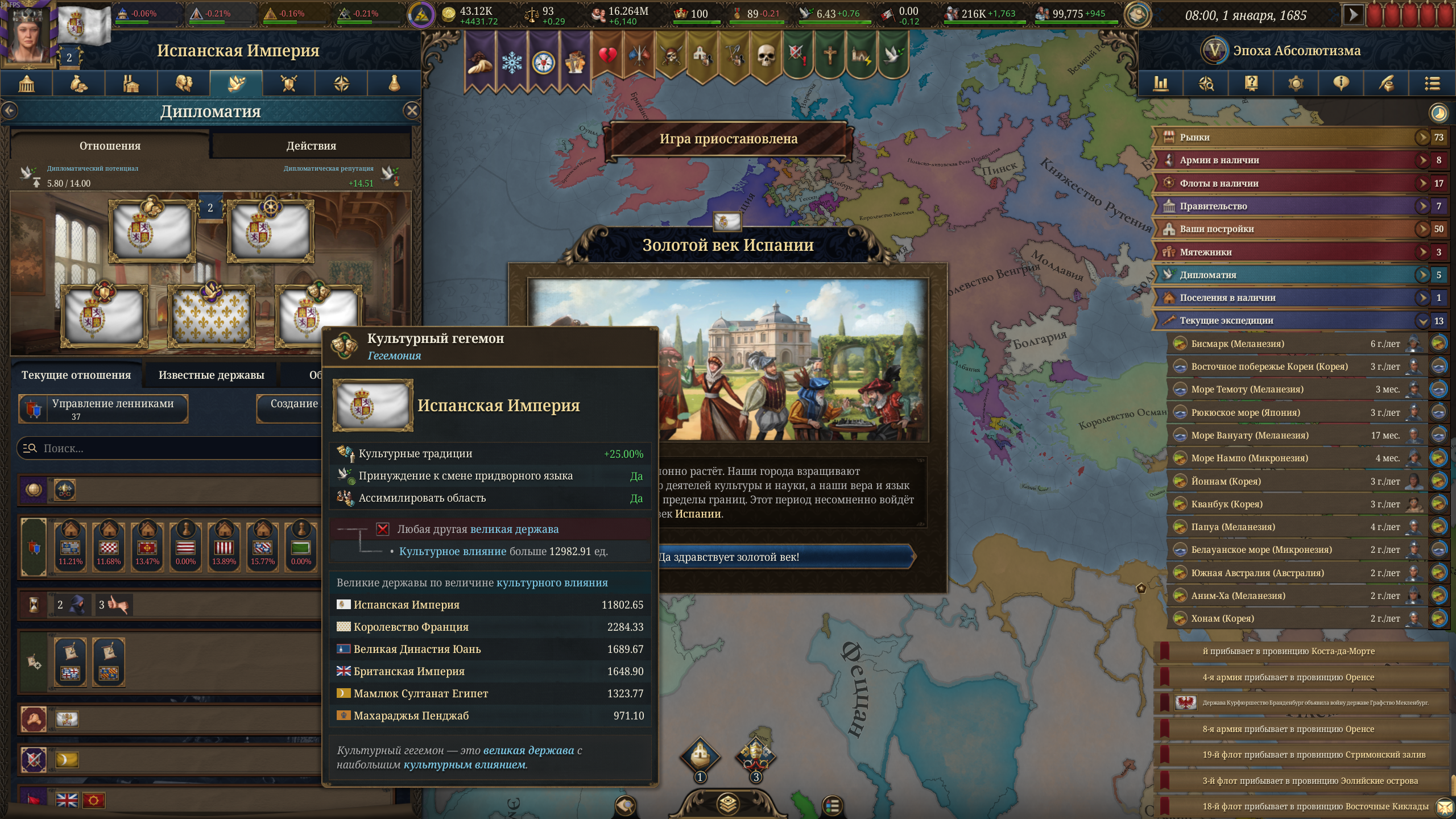 Я вот по советам из прошлого треда решил сесть за Испанию, в итоге поставил все на автомат, по советам решил корешиться с Францией и Португалией, в итоге Португалия с нулевой кидает в ривалы, сука. В четверте был баф у них >+ 25 Хисторикал френд Так же как у Венгрии с Австрией кстати, но тут все враги друг другу.