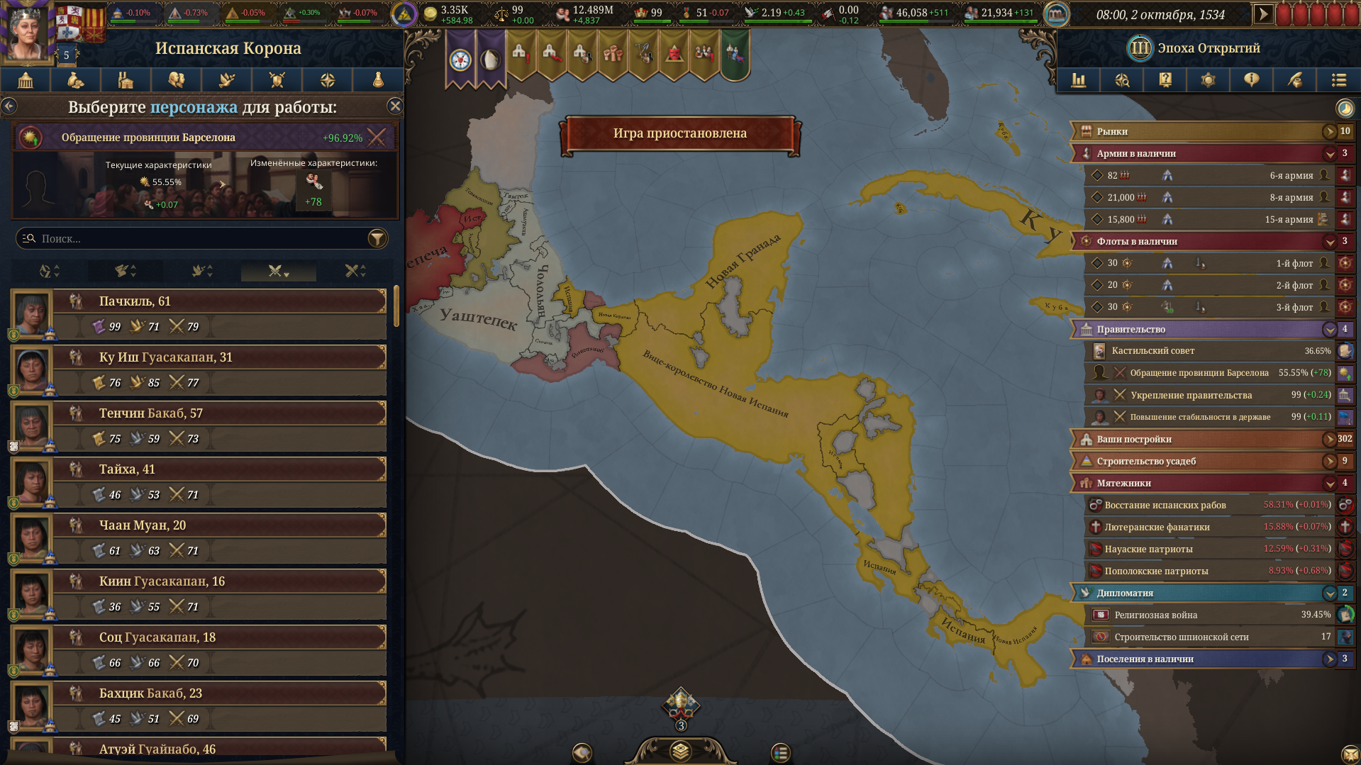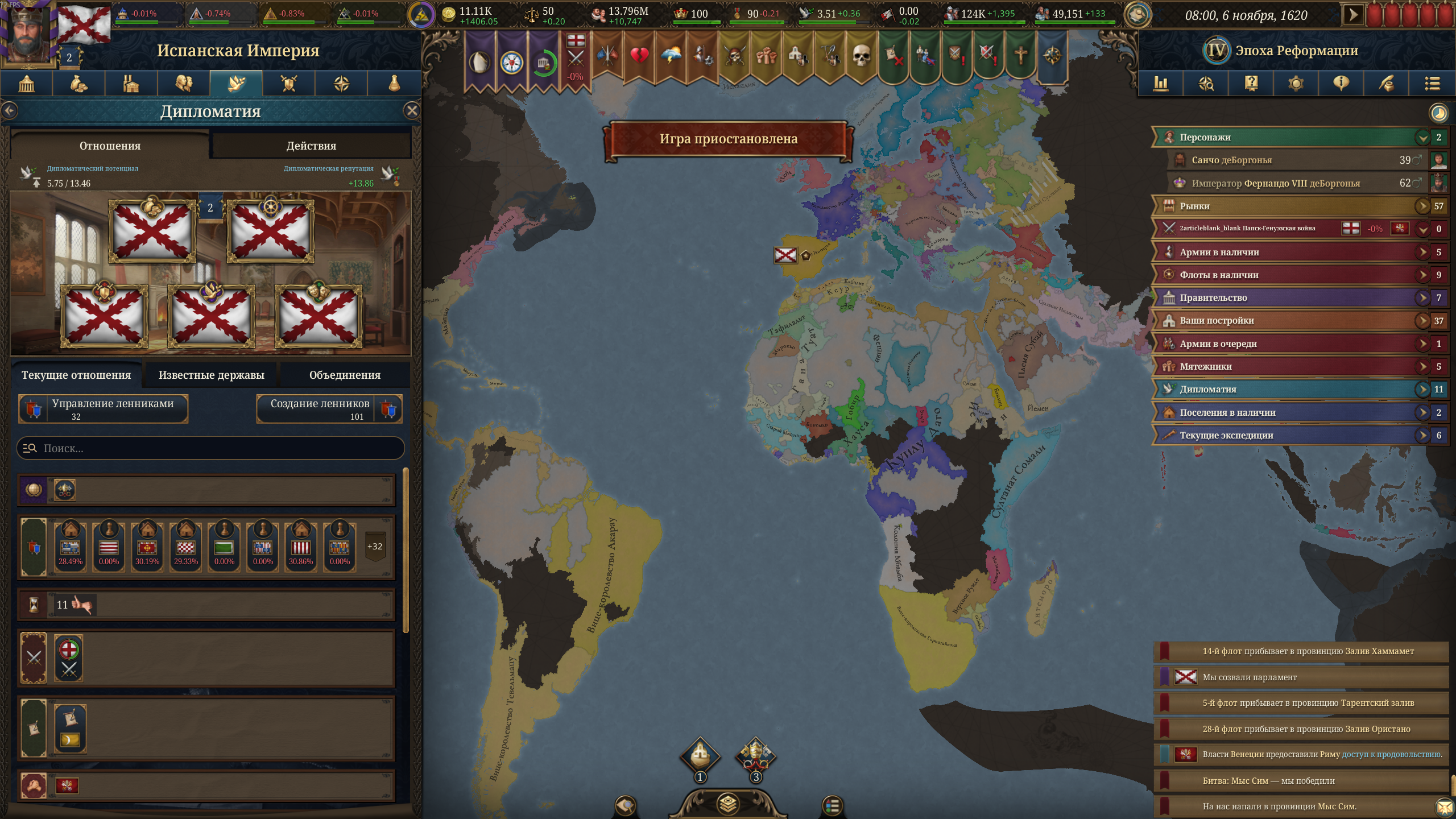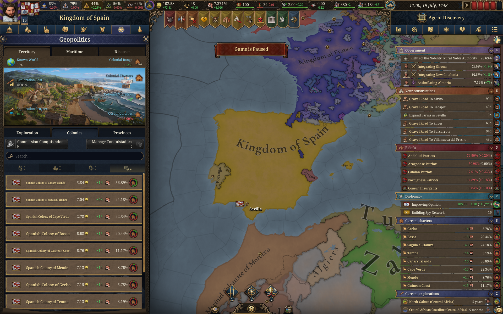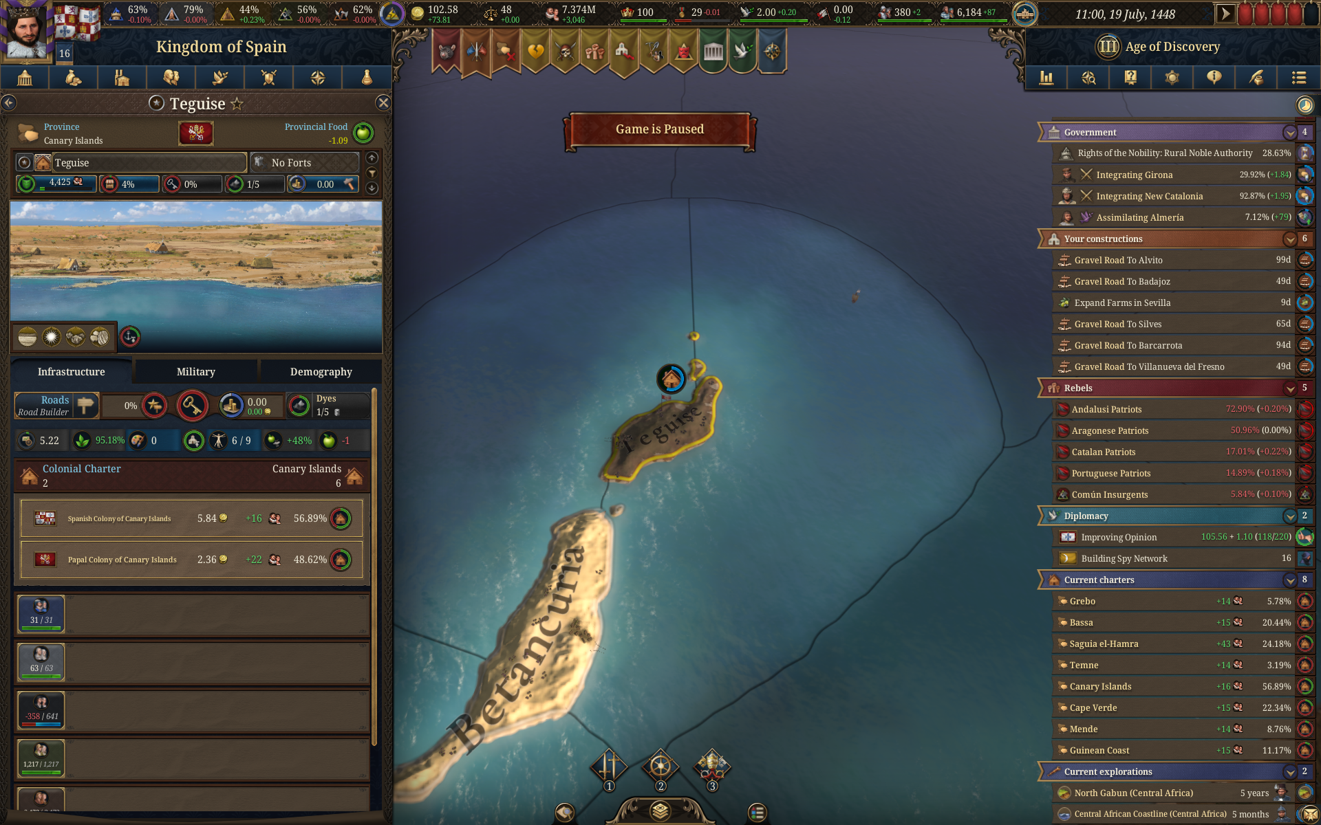 Объясните, что я делаю не так с колониями? С самого начала игры я прокликивал все экспедиции, чтобы первым открывать и колонизировать. В итоге у меня есть такое количество колониальных чартеров. Вопрос, КАКОГО ХУЯ У ПАПСТВА БЫСТРЕЕ ПРОГРЕСС ЧЕМ У МЕНЯ? Я открыл первым этот остров, я его первым начал колонизировать, какого хуя,блять? Я думаю что это может быть связано с тем, что все мои колониальные чартеры шлют людей из одного города - Севильи. Но это самый населённый район, логично везти людей оттуда. Содержание колоний, естественно, на самом высоком уровне. Но почему так долго заселяется всё?