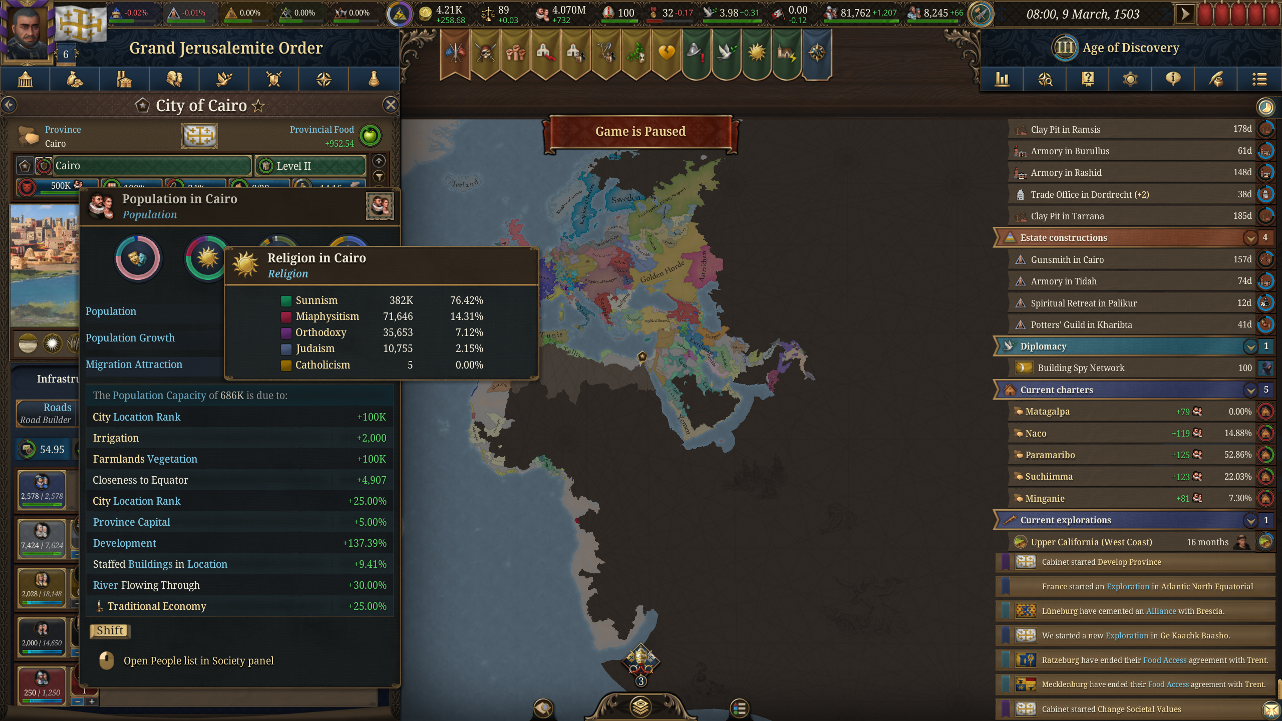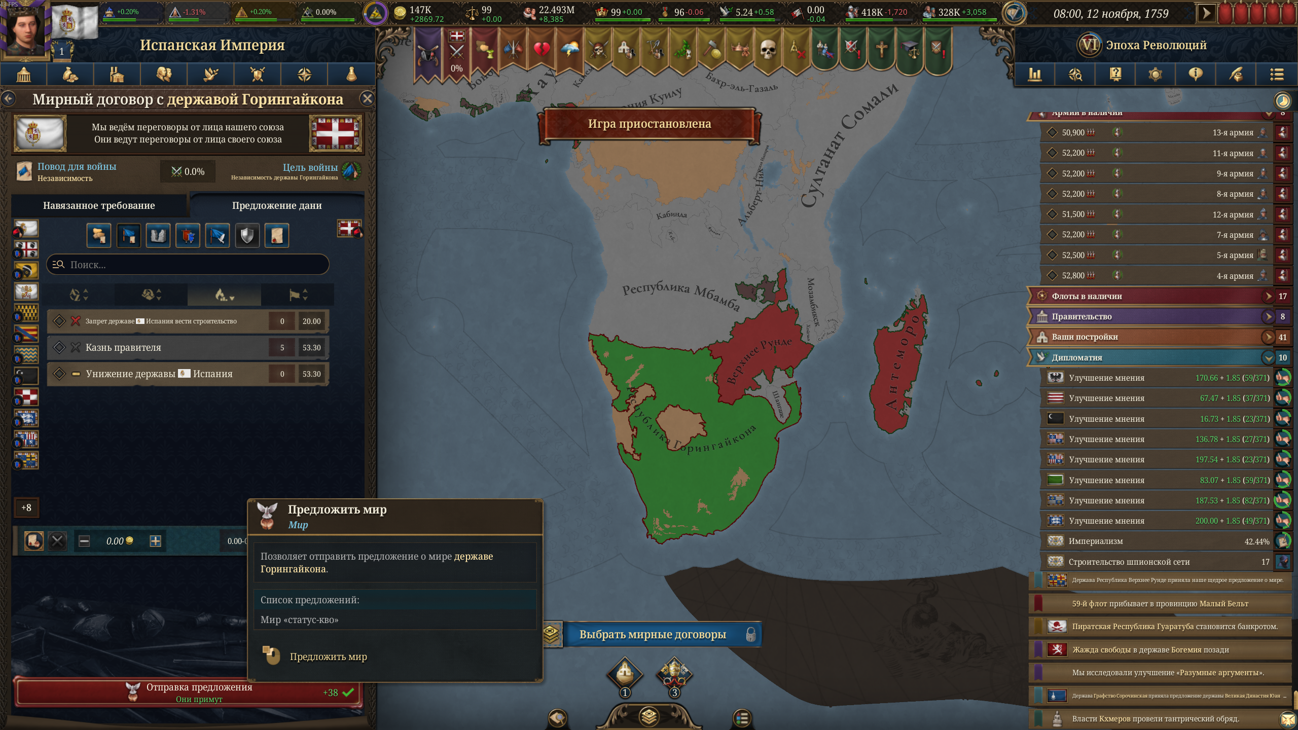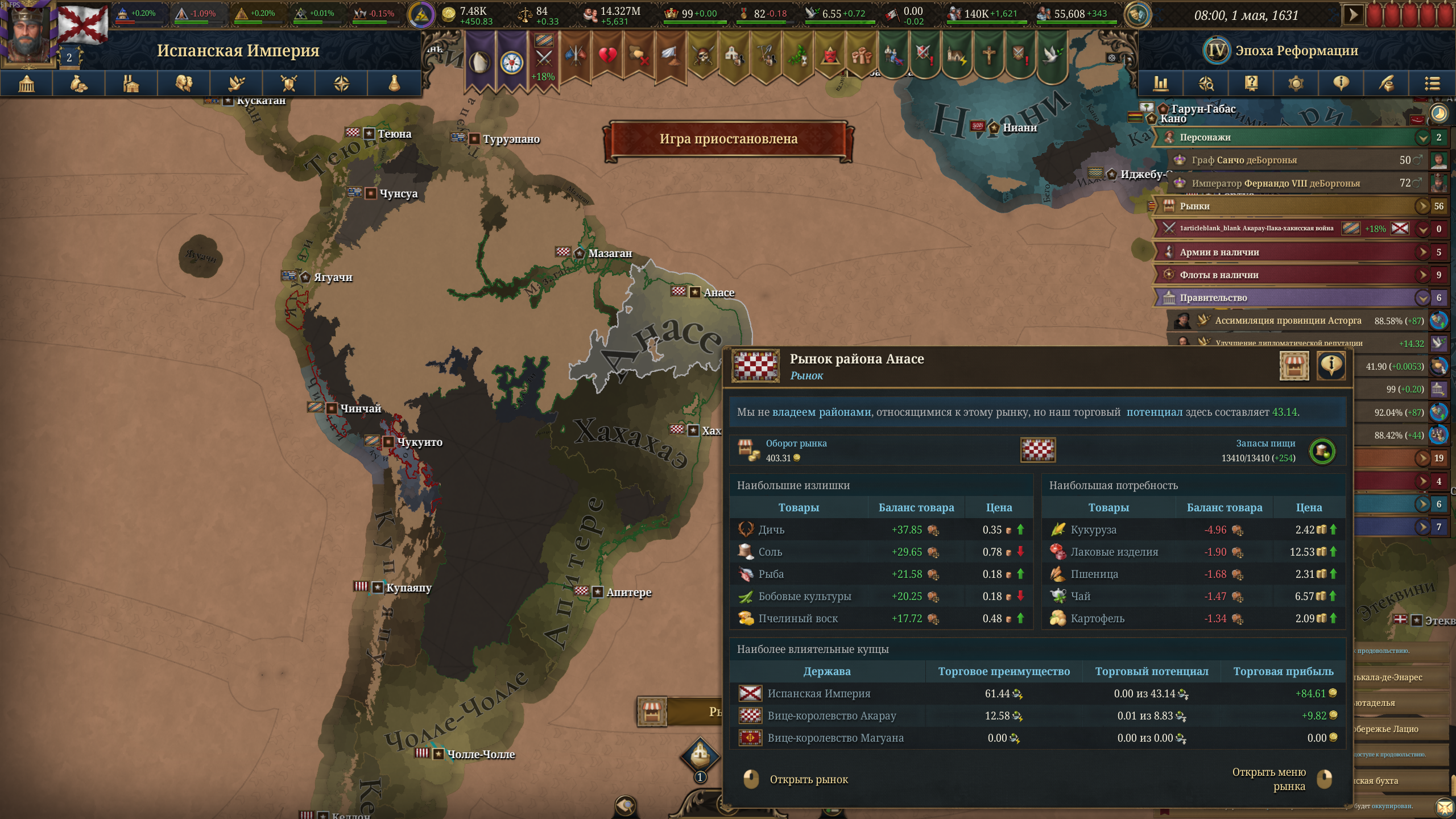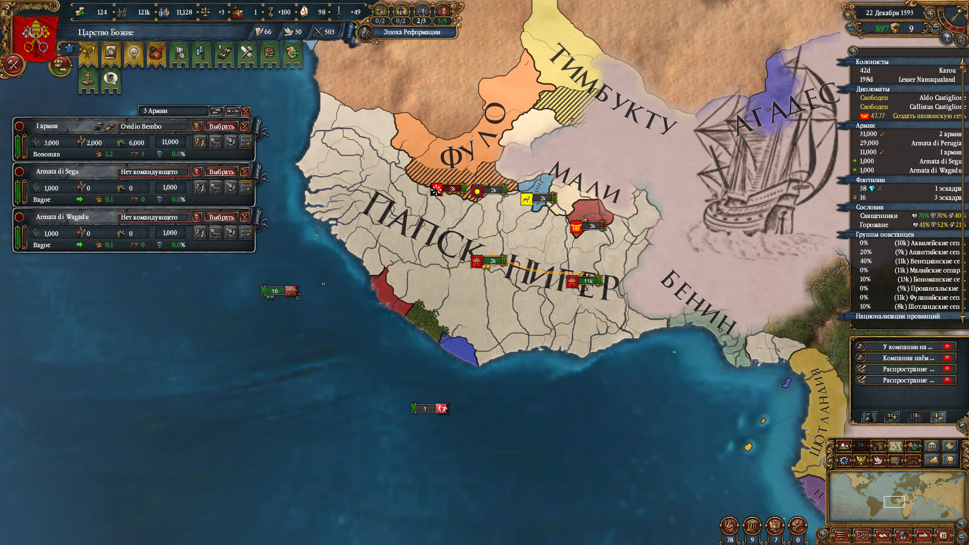 Объясните, что я делаю не так с колониями? С самого начала игры я прокликивал все экспедиции, чтобы первым открывать и колонизировать. В итоге у меня есть такое количество колониальных чартеров. Вопрос, КАКОГО ХУЯ У ПАПСТВА БЫСТРЕЕ ПРОГРЕСС ЧЕМ У МЕНЯ? Я открыл первым этот остров, я его первым начал колонизировать, какого хуя,блять? Я думаю что это может быть связано с тем, что все мои колониальные чартеры шлют людей из одного города - Севильи. Но это самый населённый район, логично везти людей оттуда. Содержание колоний, естественно, на самом высоком уровне. Но почему так долго заселяется всё?