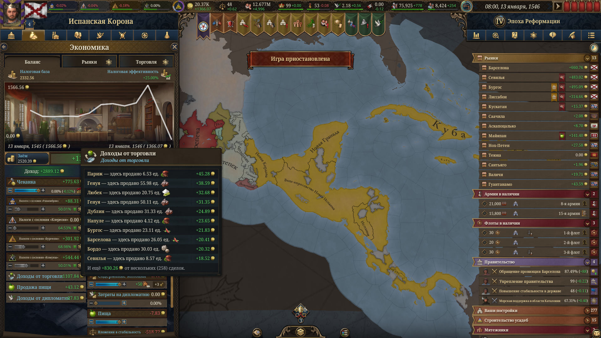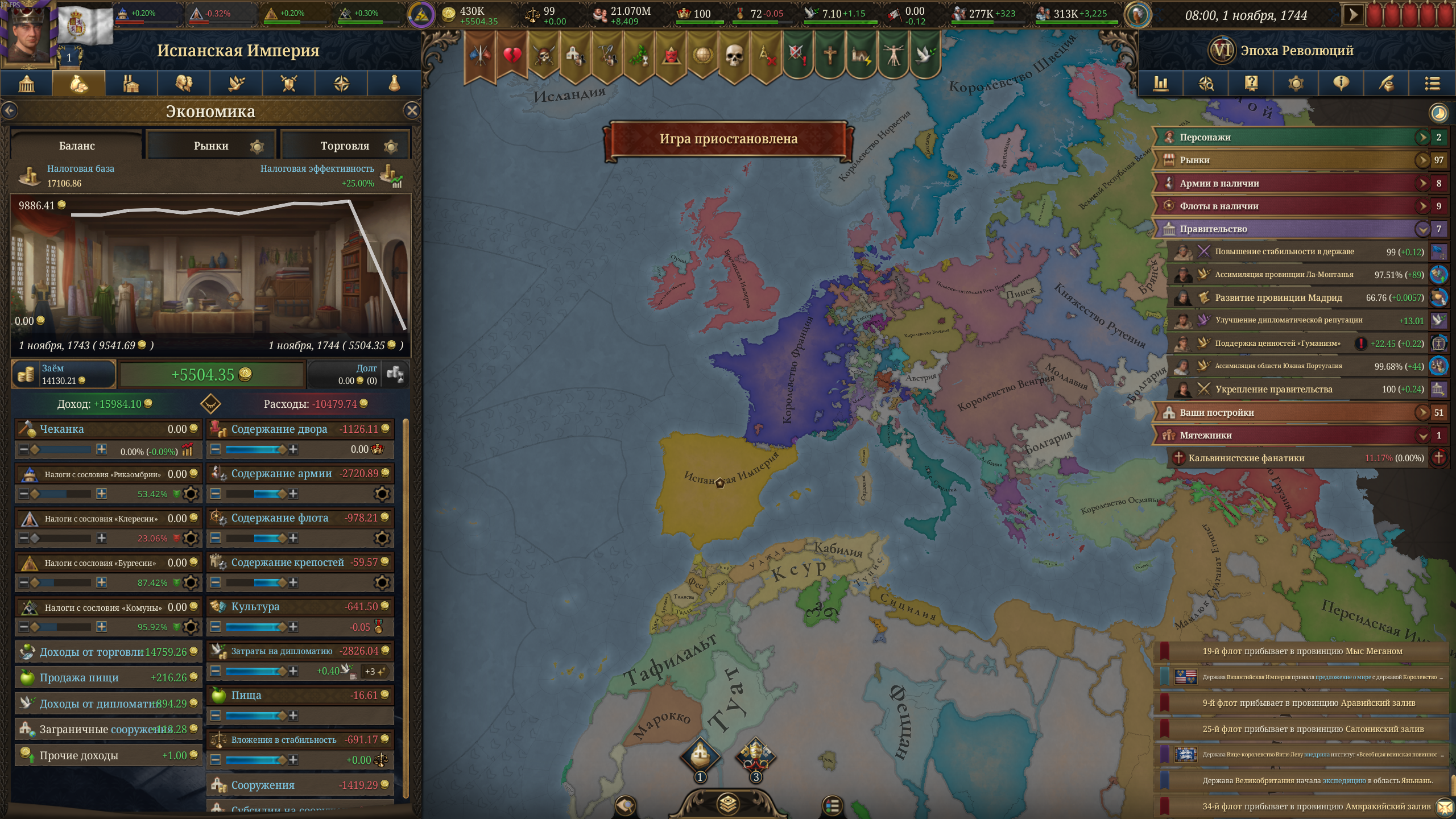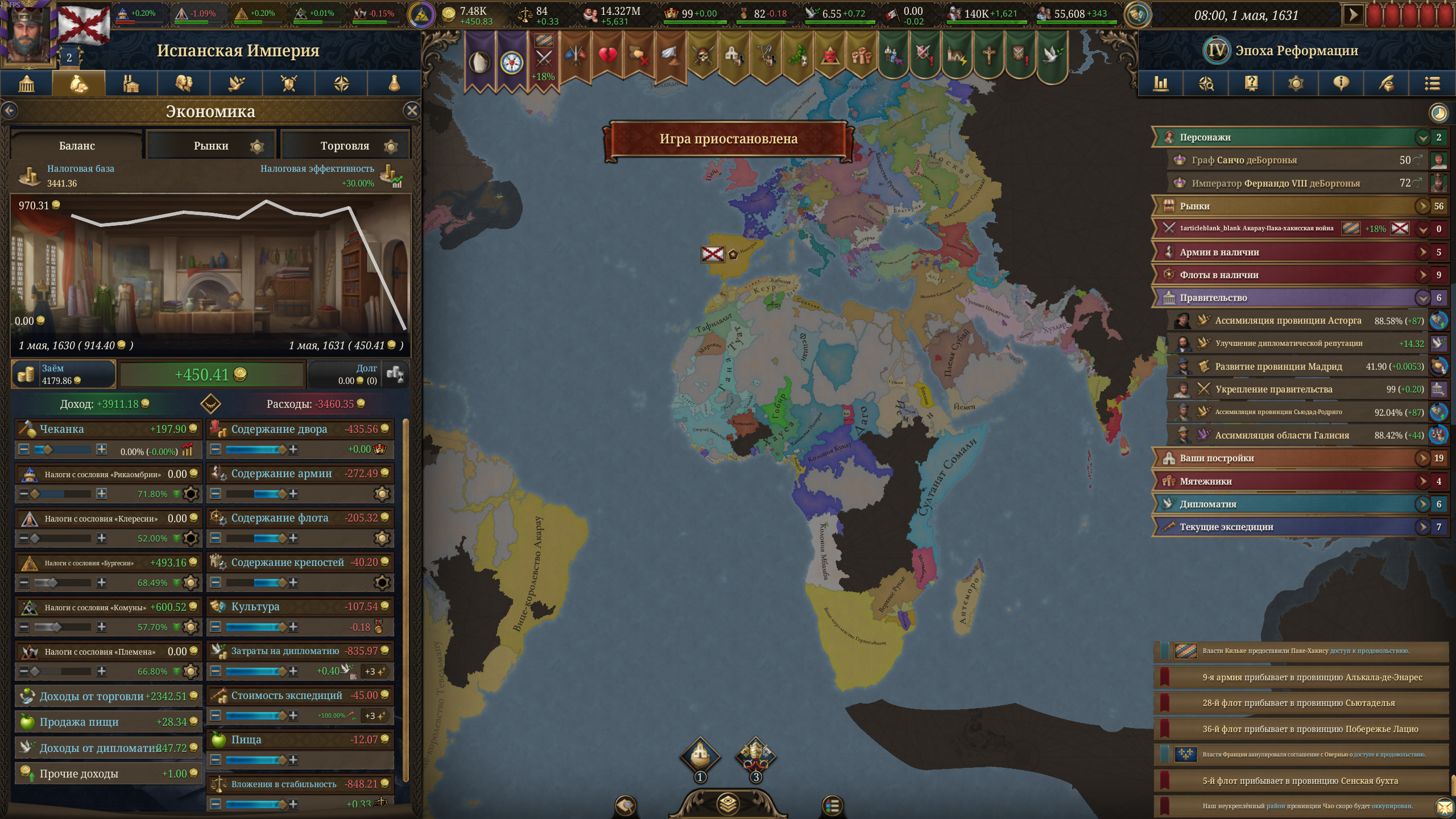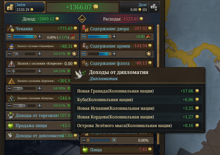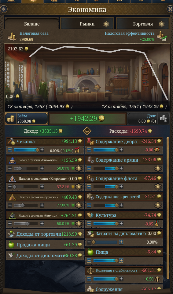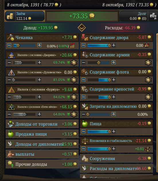 >>50482789 Не знаю где там у тебя неадекватные величины, 1500 год, 3 ляма народу, 40 процентов короны, налоги до упора сколько можно, 0 новых привелегий за всю игру сословиям, застроено все что можно, армия на 10 тысяч и кораблики на 50, на армию половина содержания, бюджет урезан везде где только можно на всякий мусор типа культуры, так вот, доход +100-150 ни о чем.