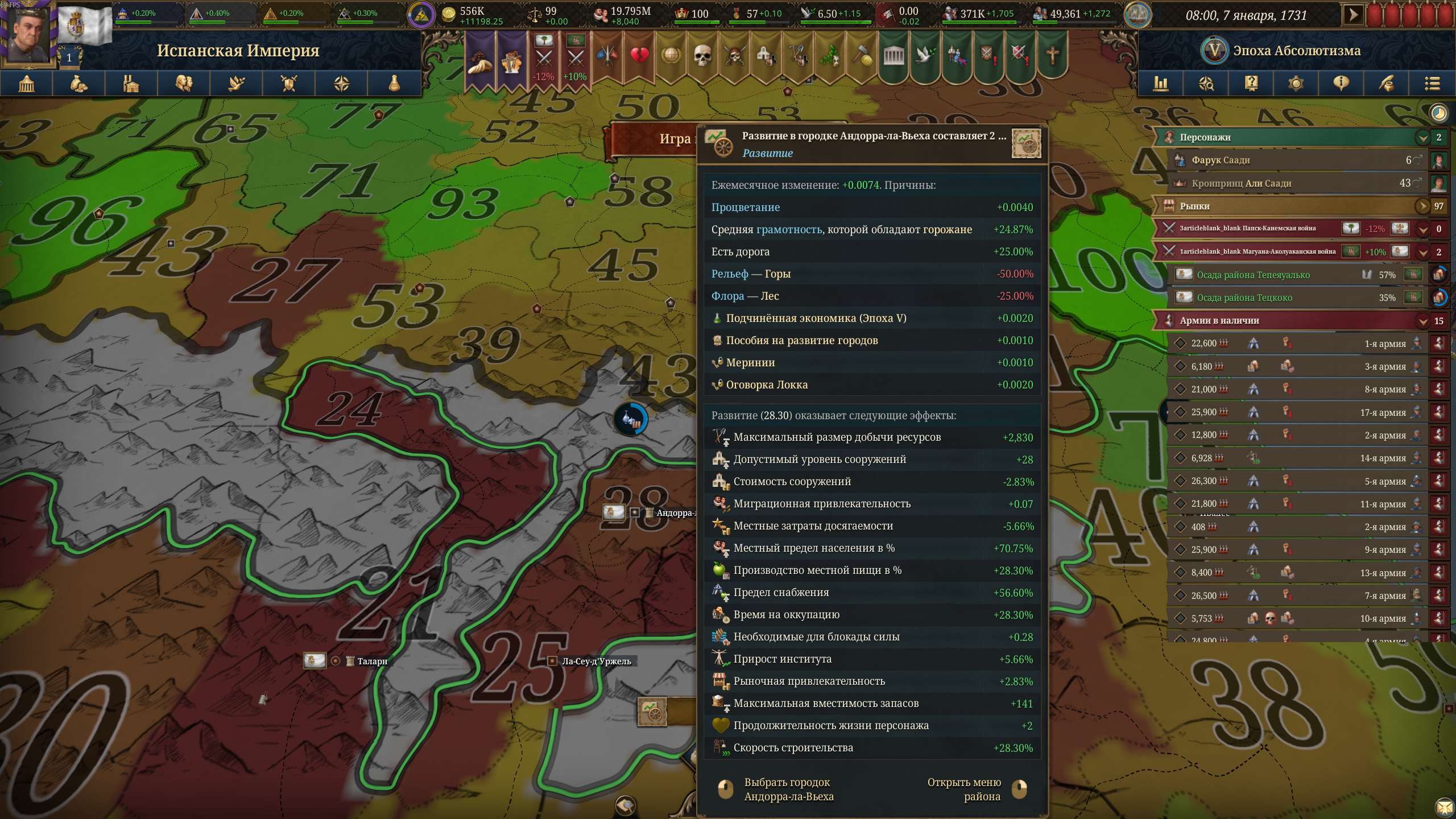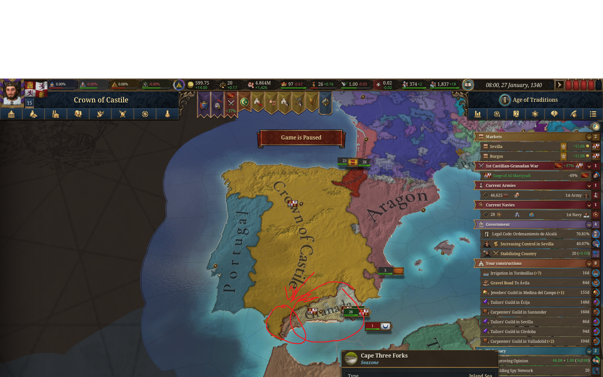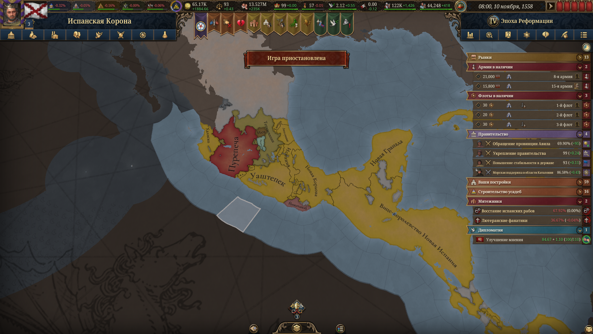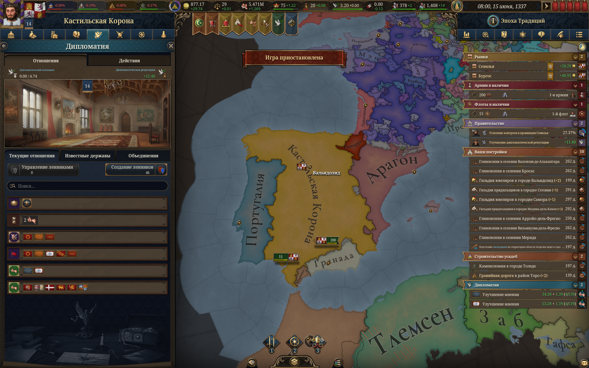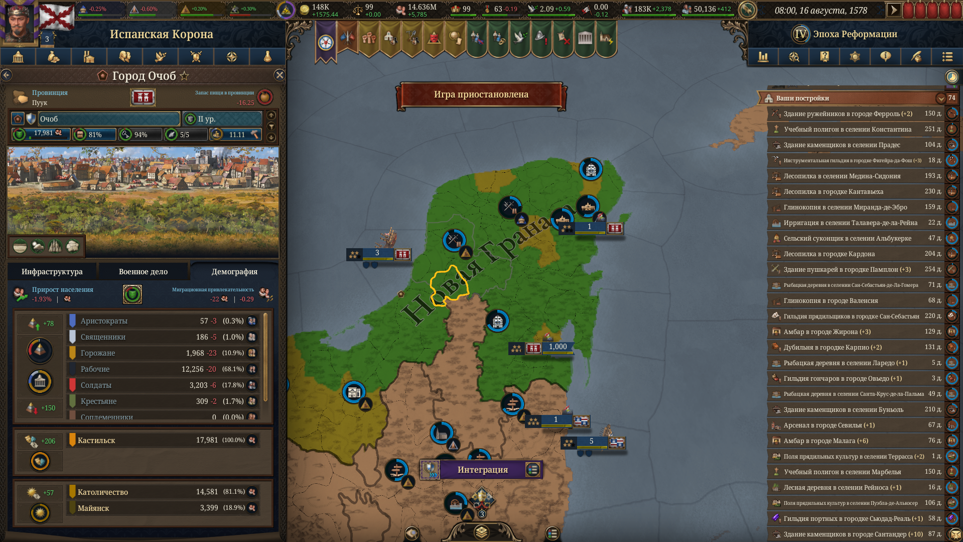 Я видел сверху в треде есть испанские идальго, дайте советов. >Во первых, как вы воюете? Я думал что для Гранады у меня будет КБ, как по миссиям в 4 часте. Но нихуя, что мне, влетать без него? >Во вторых, что мне строить? Я ткнул на автомат денежный вопрос, но я все равно хочу понять концепцию. Я смотрел видево на ютубе, там говорят строить дороги и рядом со столицей в первую очередь развивать RGO. Там говорили всегда строить то, что добівает еду и то, что рядом добывают. Например, если рядом с Вальядолидом есть шерсть, то прядильщиков, если железо то домик на иструменты и тд. >В третьих, как мне воевать? В моей партии за Милан Франция очень резво полезла в Испанию, точнее в Арагон. У меня цель на эту партию построить домики, поколонить и собрать регион Испании. Следовально, нужно сразу отсекать Арагон от Франции ебаша вдоль Пиреней червем-пидором, или что?