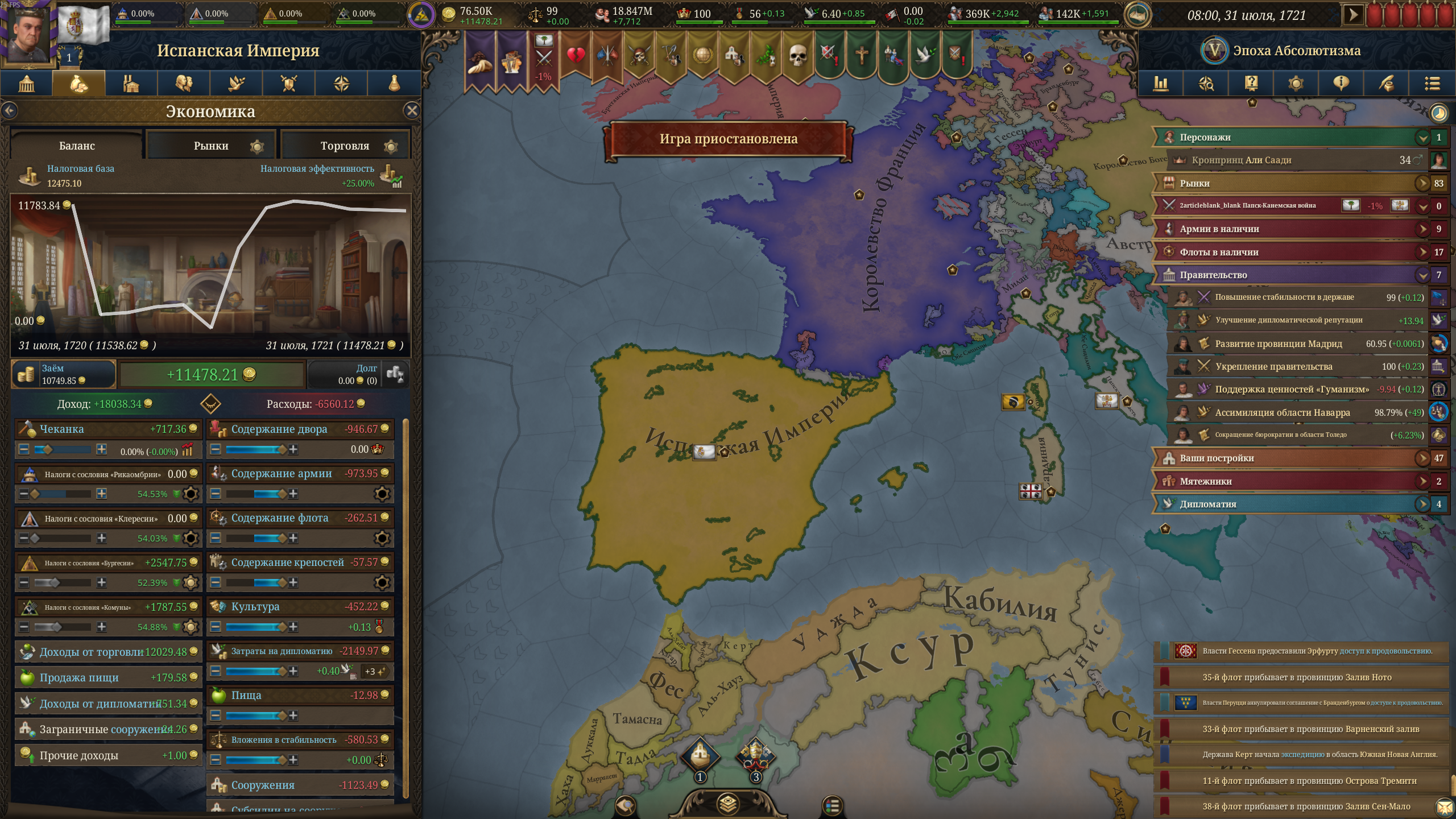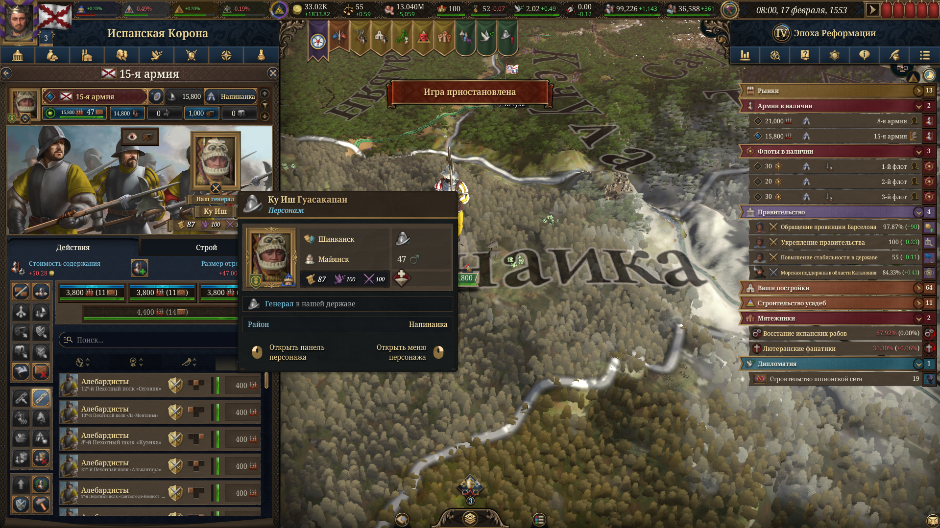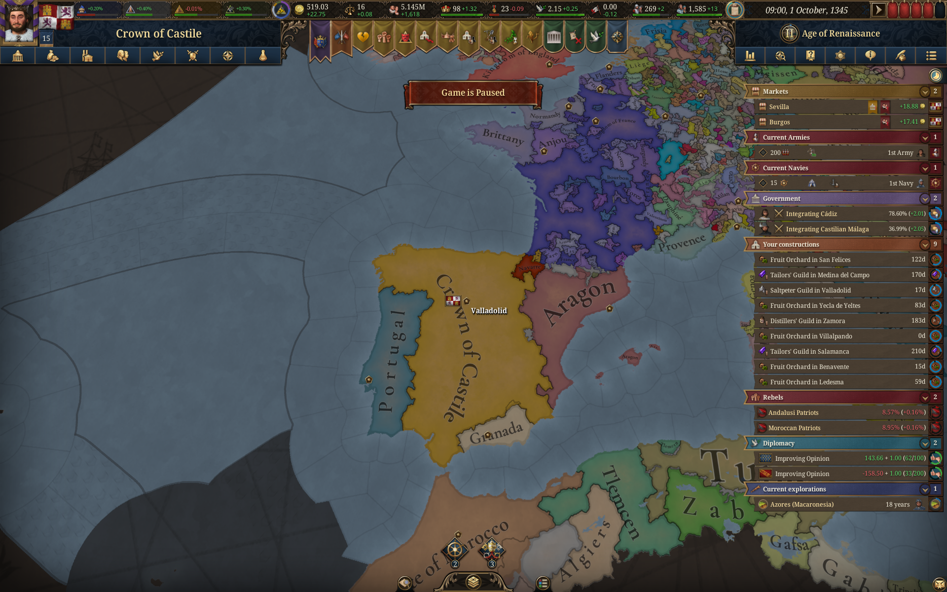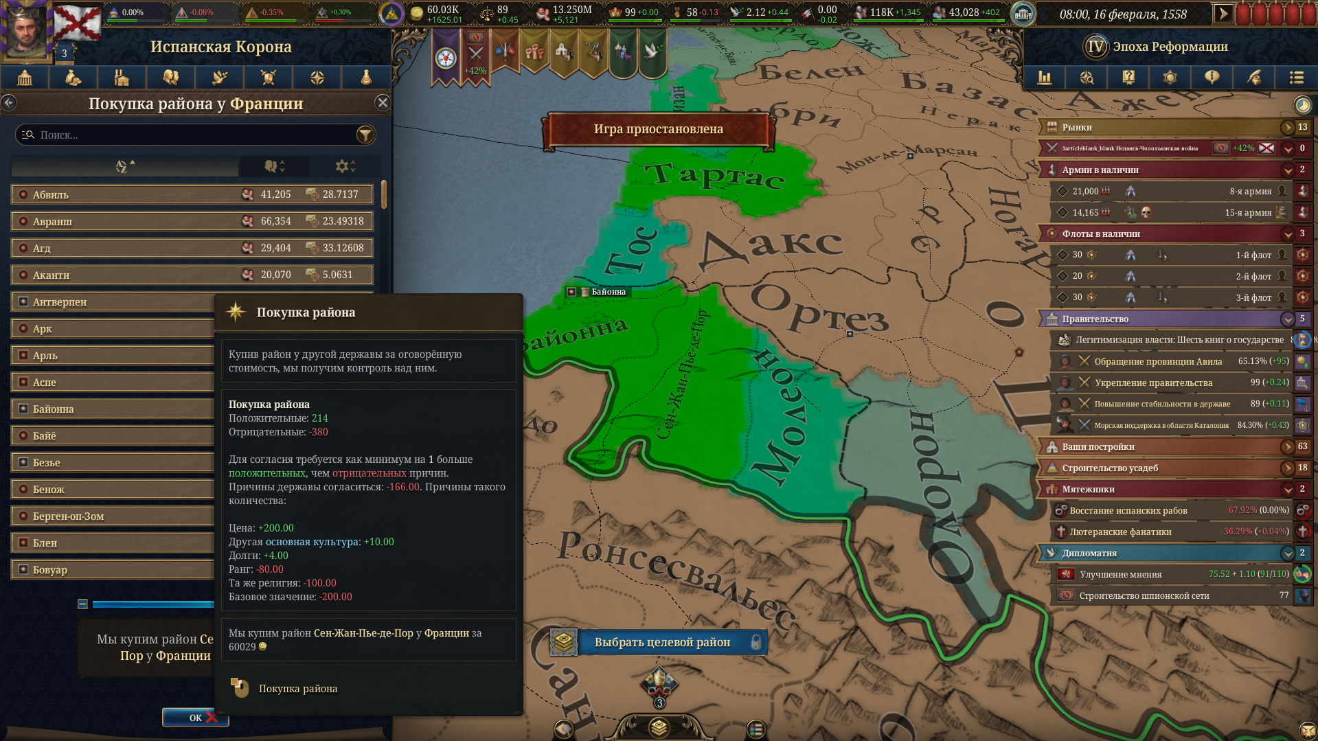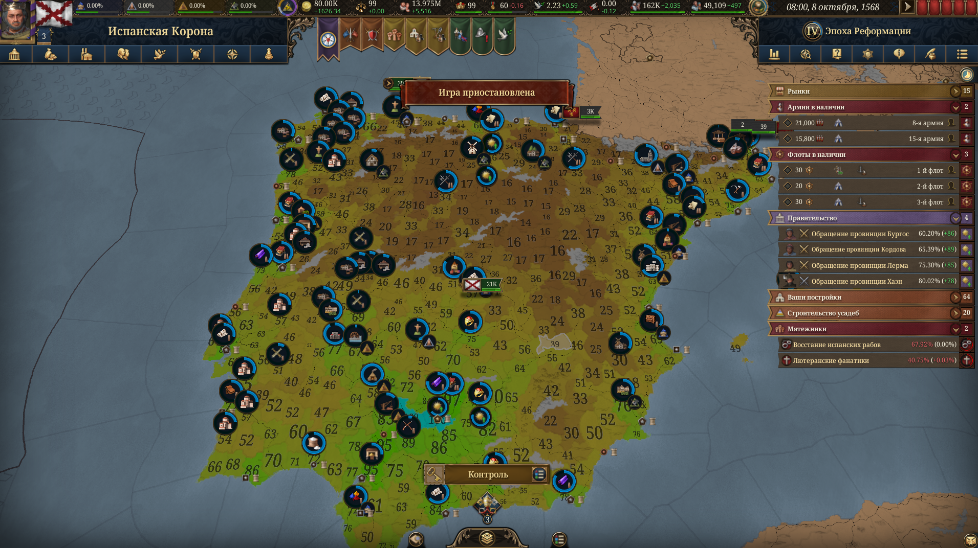 Я видел сверху в треде есть испанские идальго, дайте советов. >Во первых, как вы воюете? Я думал что для Гранады у меня будет КБ, как по миссиям в 4 часте. Но нихуя, что мне, влетать без него? >Во вторых, что мне строить? Я ткнул на автомат денежный вопрос, но я все равно хочу понять концепцию. Я смотрел видево на ютубе, там говорят строить дороги и рядом со столицей в первую очередь развивать RGO. Там говорили всегда строить то, что добівает еду и то, что рядом добывают. Например, если рядом с Вальядолидом есть шерсть, то прядильщиков, если железо то домик на иструменты и тд. >В третьих, как мне воевать? В моей партии за Милан Франция очень резво полезла в Испанию, точнее в Арагон. У меня цель на эту партию построить домики, поколонить и собрать регион Испании. Следовально, нужно сразу отсекать Арагон от Франции ебаша вдоль Пиреней червем-пидором, или что?