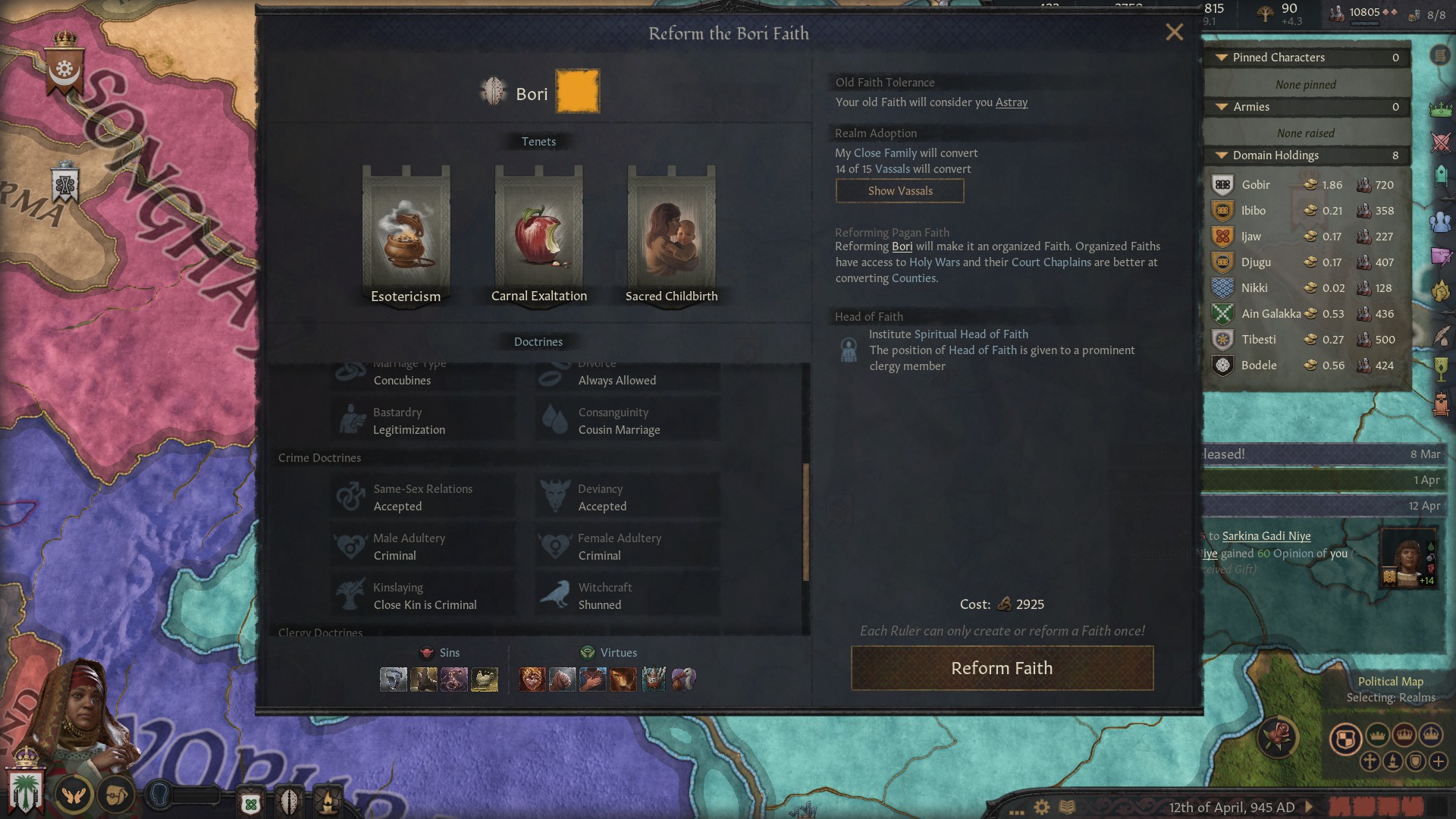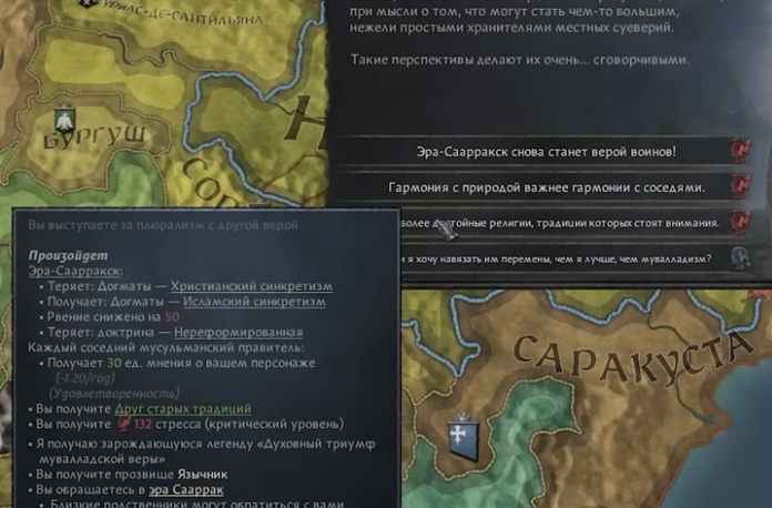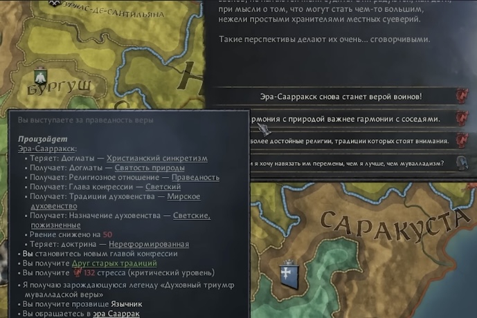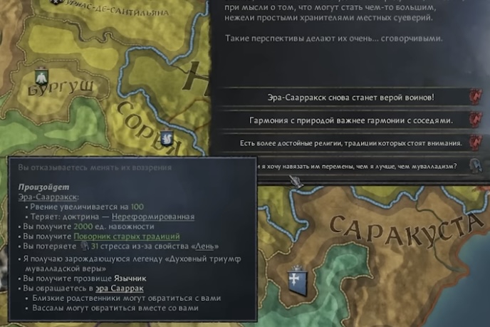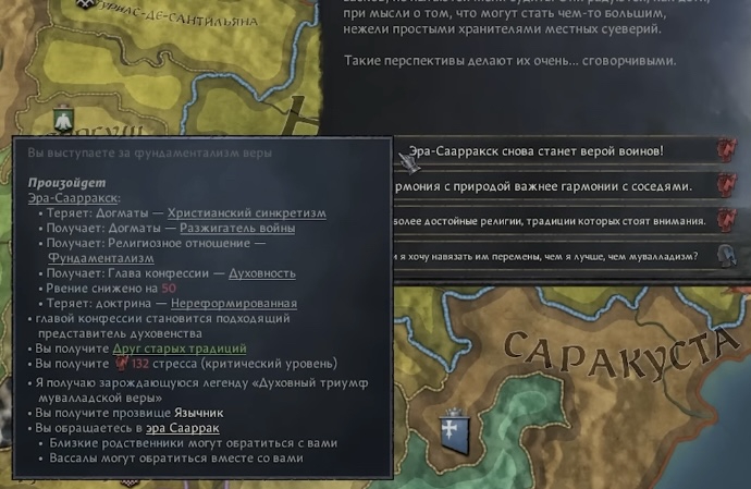 Че выбрать в этом баскском язычестве? С одной стороны первый с разжиганием войны прикольно но я хз кому объявлять войны если вся Старая Васконтя и так под моим контролем, и нереформированный так как там христианский синкретизм, так как возможно против меня не будет крестовых походов, но бля фармить моим правителем которому 70 лет благочестие просто чтобы прожать кнопку это тот еще маразм, ну и плюс че делать наследнику который полностью прокачен как воин я хз.