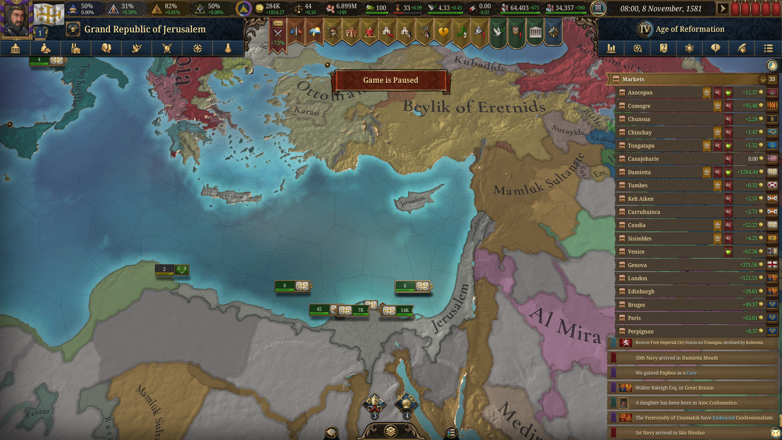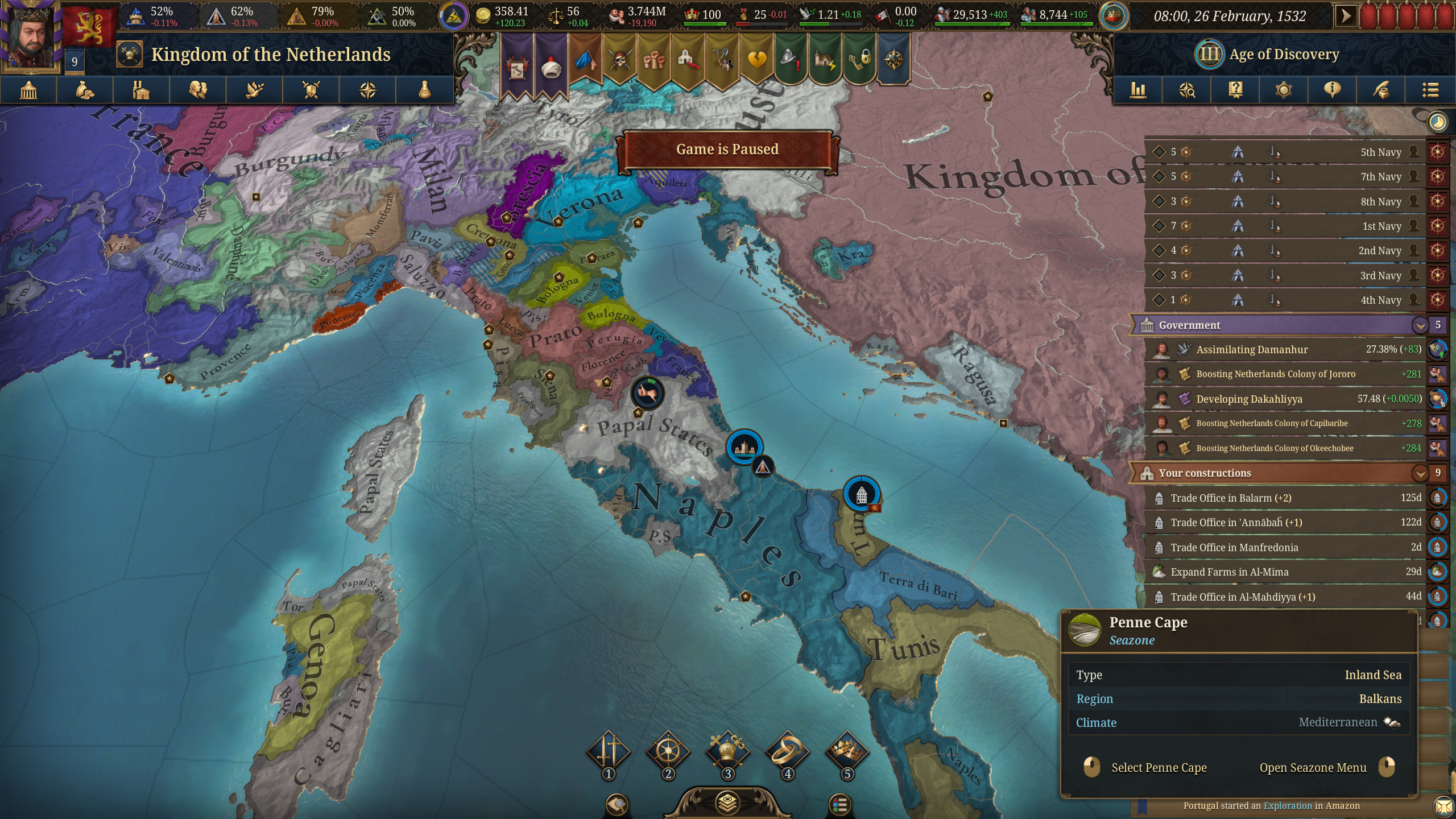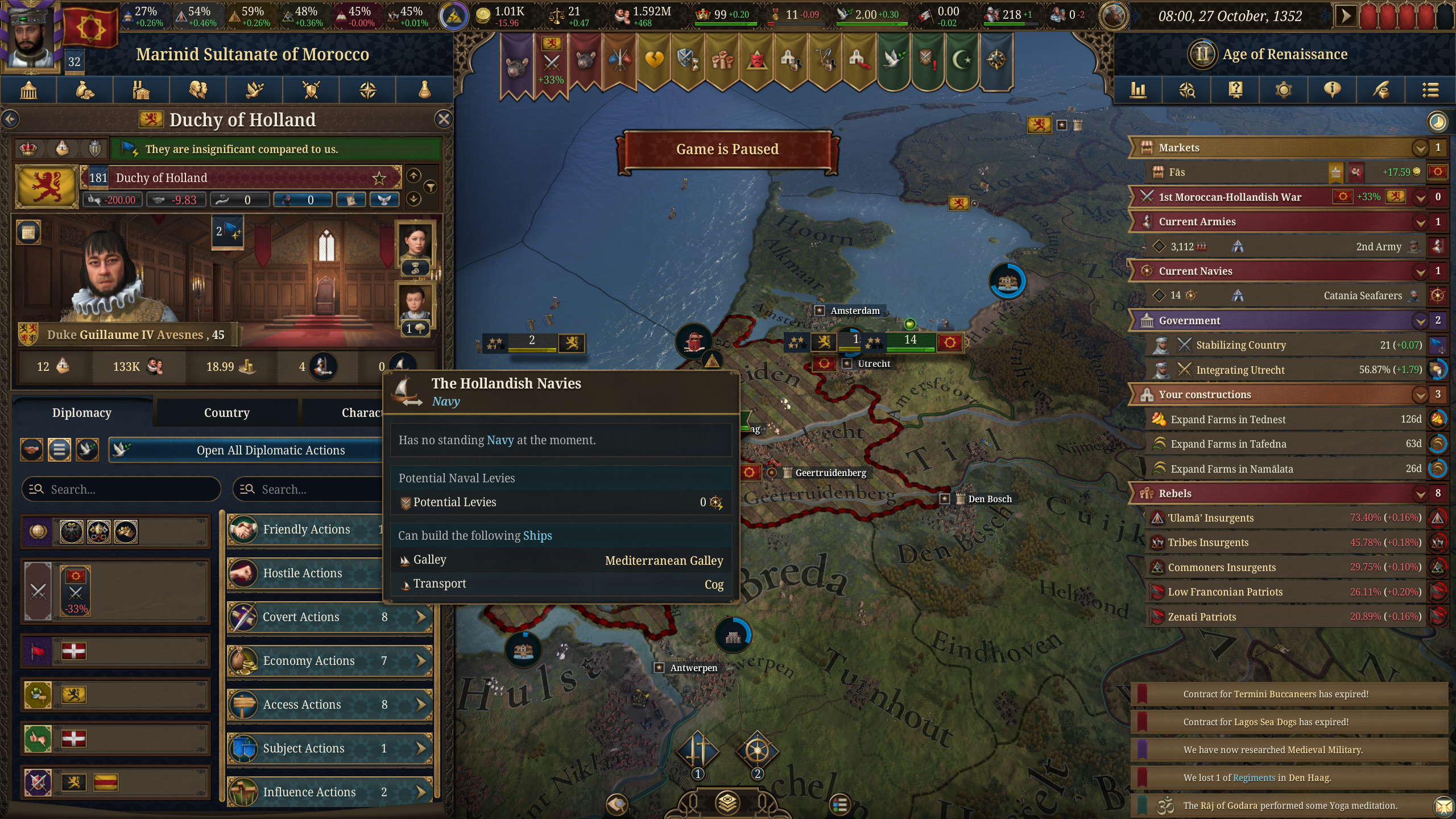 Как же все хорошо сложилось. Пока Император пиздился с Австрией, а голландцы с фризией или кем-то еще, я влетел под шумок. Думал придется ждать до профов, чтобы корабли мне не затопили, у голландца 40 кораблей, у меня 2 без наемников. Но нет, его флот похоже все. До этого играл тестовую партию, окна за 50 лет так и не появилось.
