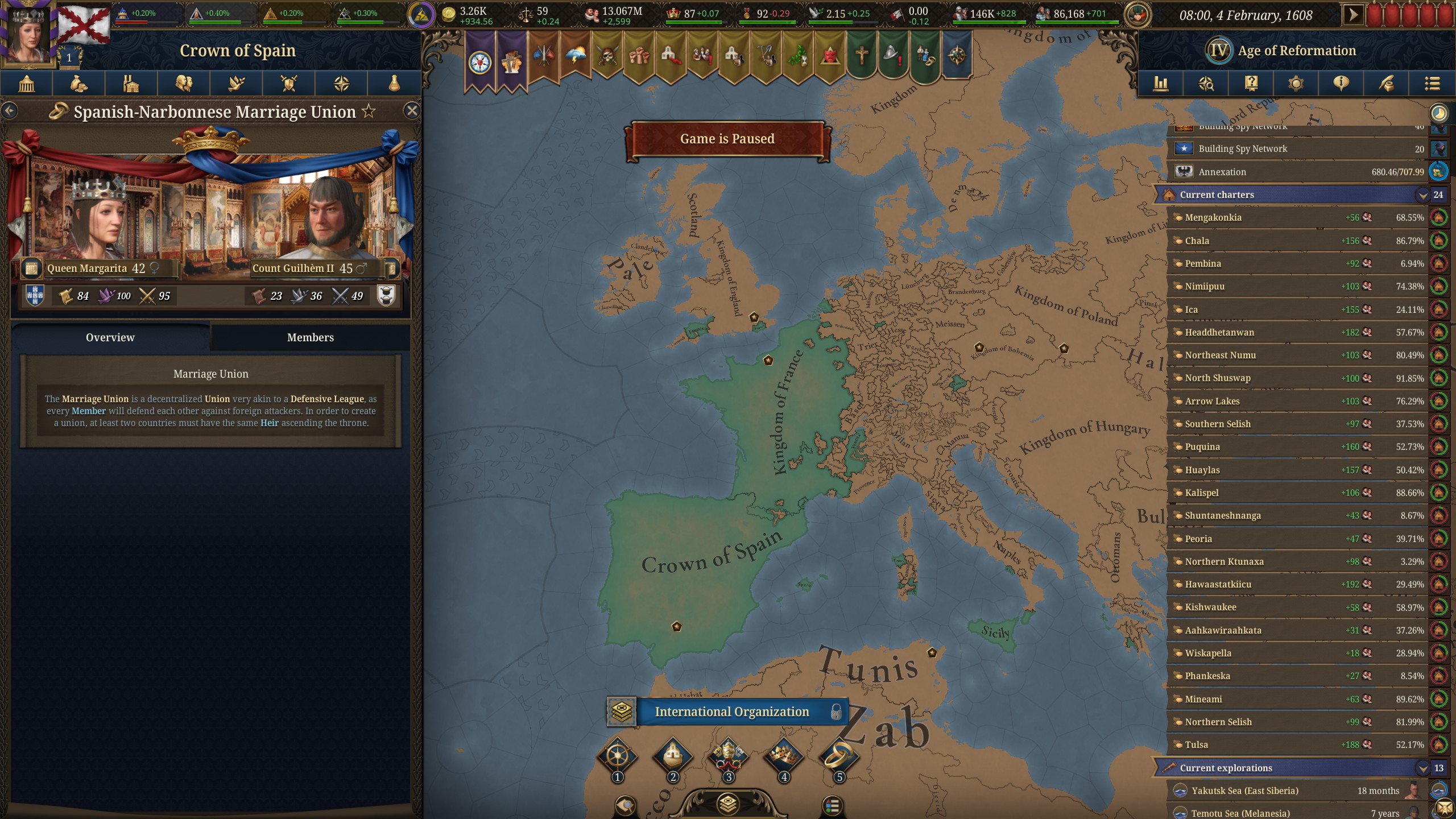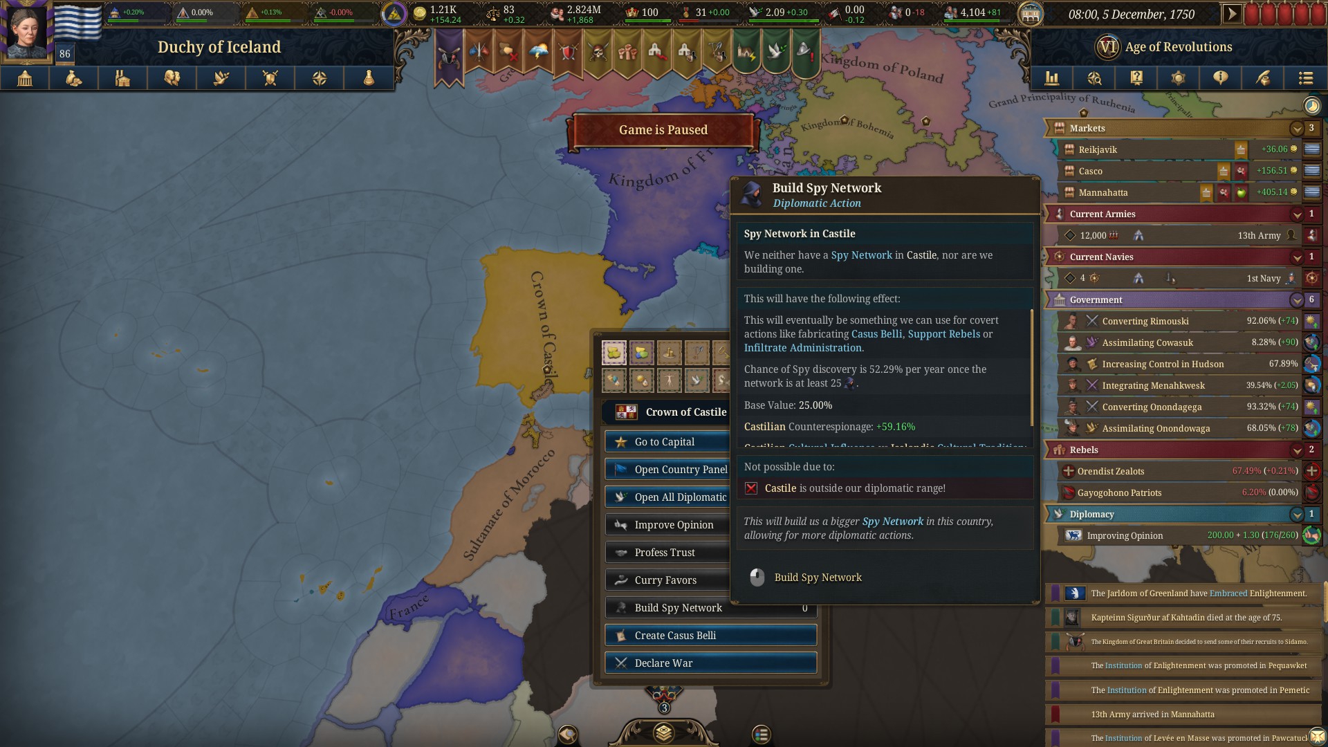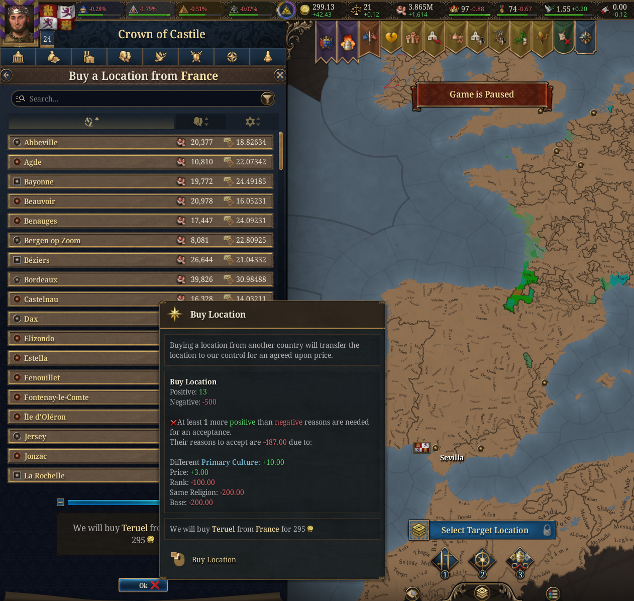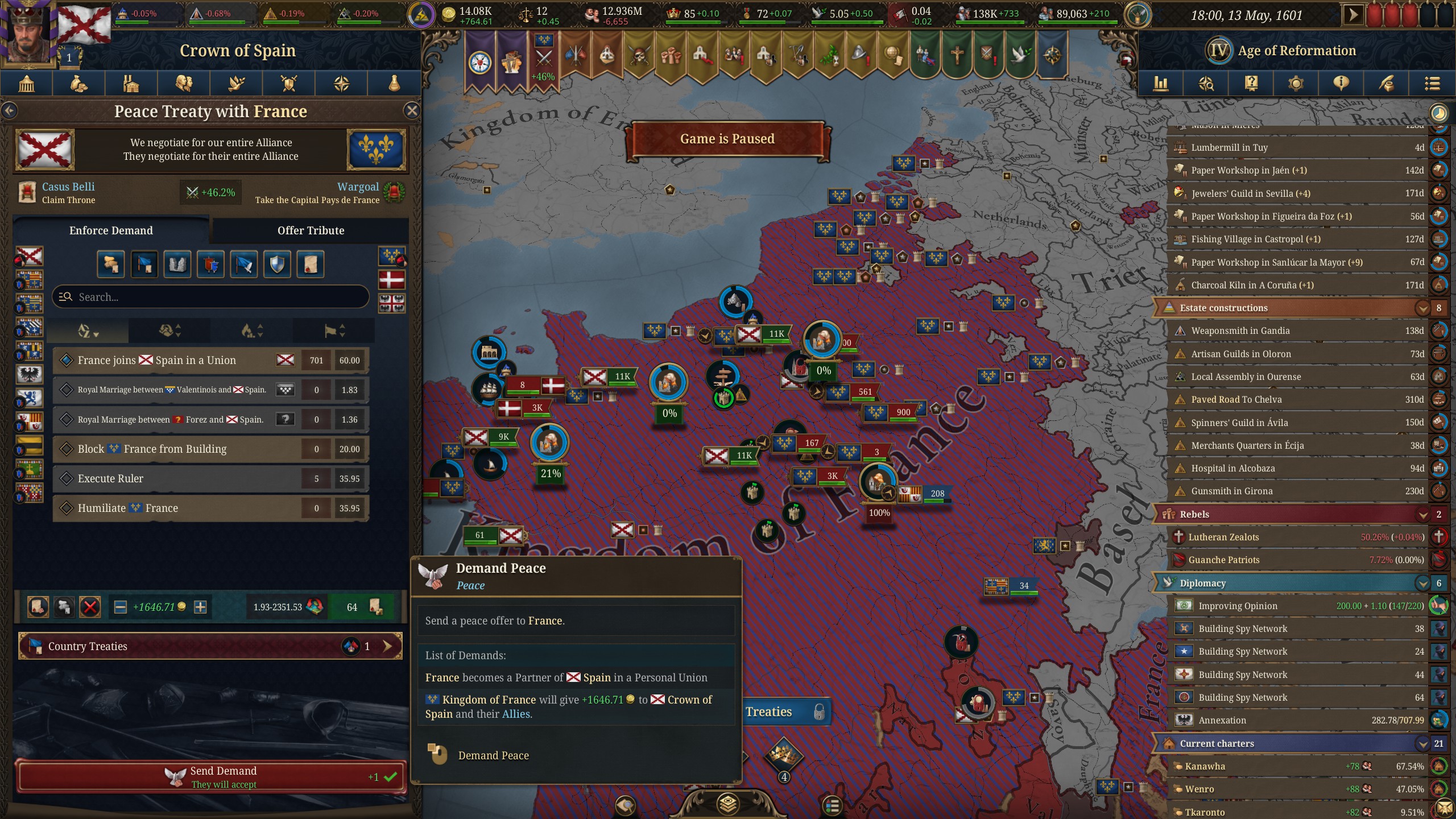 >В третьих, как мне воевать? Если играешь с заданиями, то Португалия сама прыгнет в унию и вообще будет намного легче. Если без, то ебашь Португалию в унию (претензия выскочит чуть позже). По претензии (через шпионсую сеть и создание кб) воюй с Арагоном, захвати все соседние с Францией провинции. Через тот же парламент цапни Наварру.