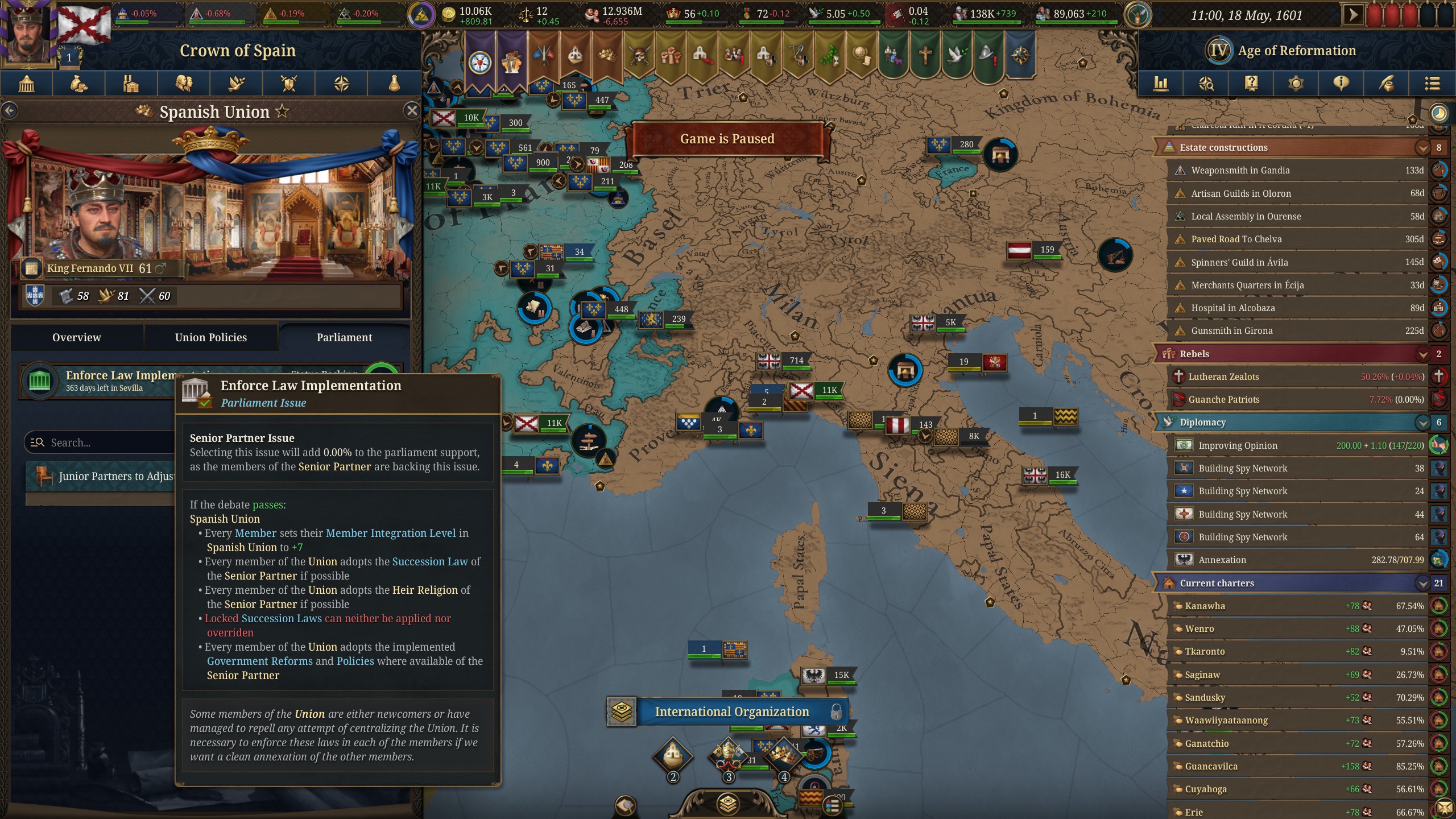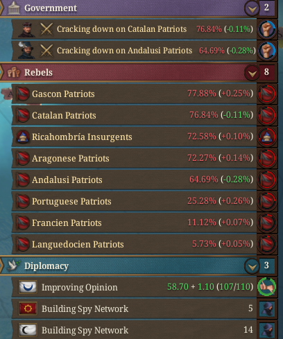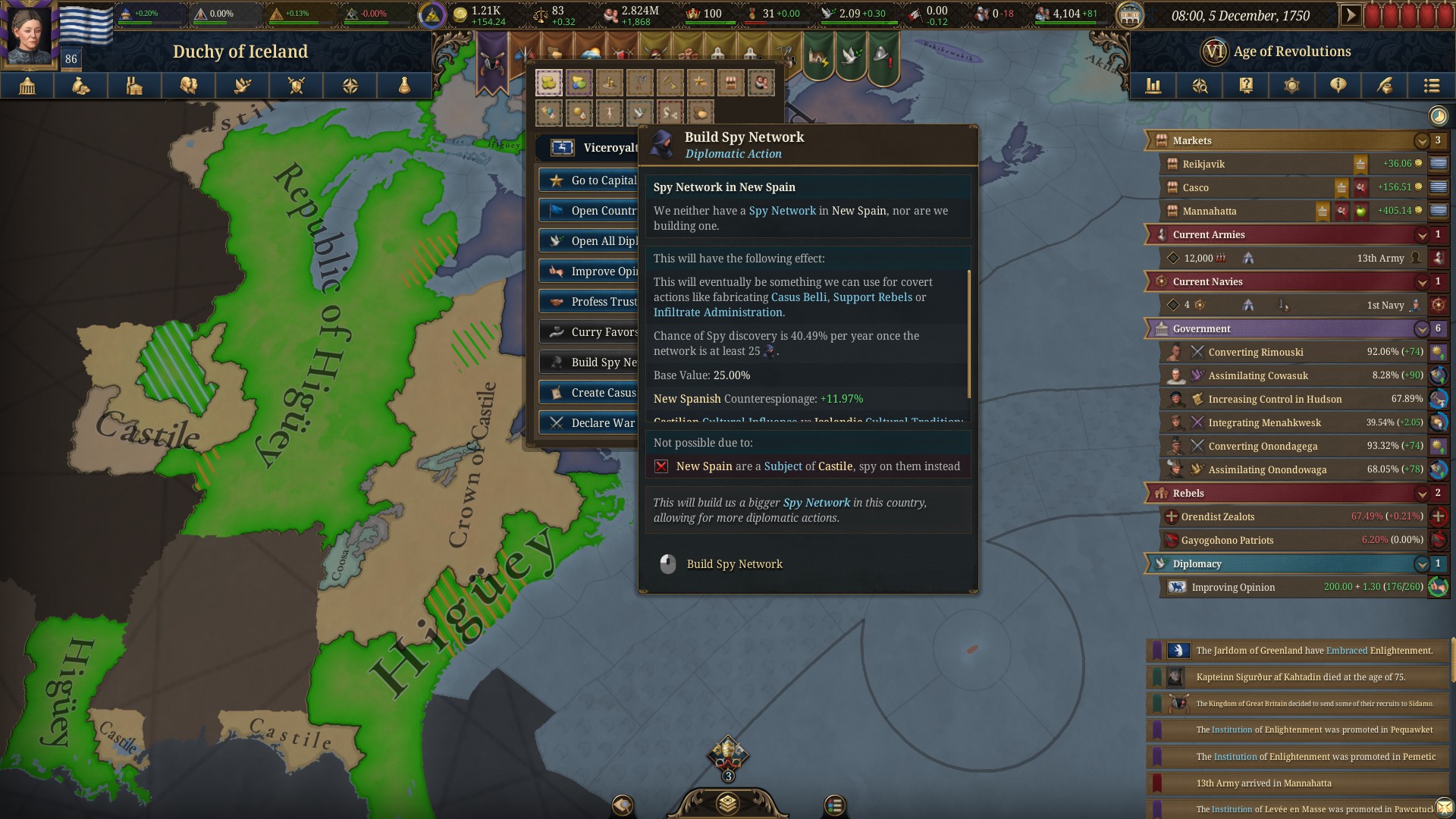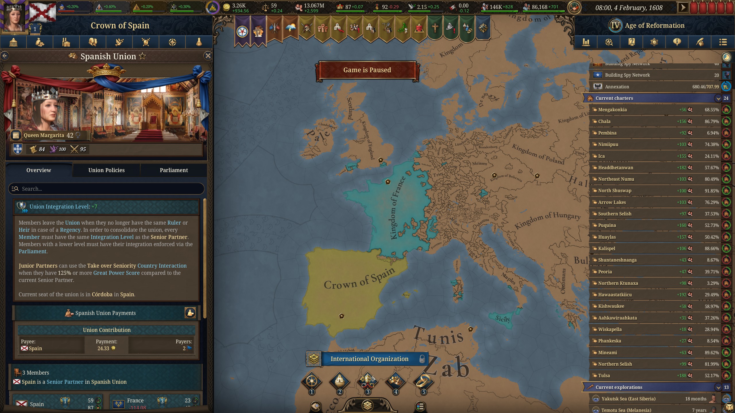>В третьих, как мне воевать? Если играешь с заданиями, то Португалия сама прыгнет в унию и вообще будет намного легче. Если без, то ебашь Португалию в унию (претензия выскочит чуть позже). По претензии (через шпионсую сеть и создание кб) воюй с Арагоном, захвати все соседние с Францией провинции. Через тот же парламент цапни Наварру.