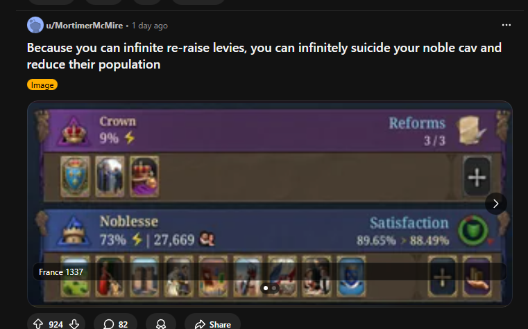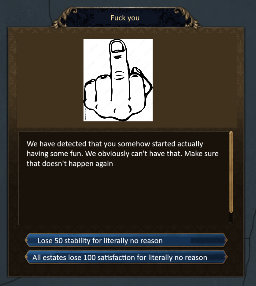 Или когда вместо того, что бы исправить модификаторы которые накладываются пачками, они врубили говно хуйню вроде событий, что ваш правитель может нечаянно ебнутся нахуй. Исправить читерные модификаторы и ветки прокачки ну нахуй. Дать говно события да. А потом они стали уменьшать пиздец от этих говно событий..