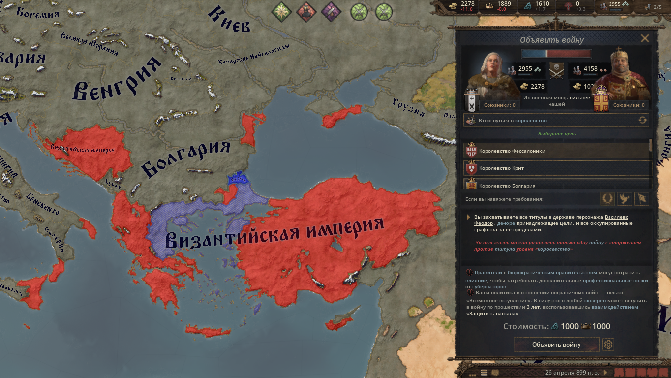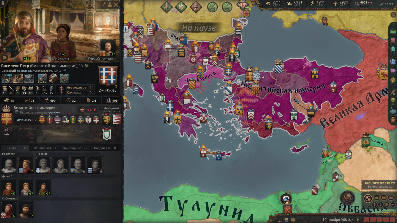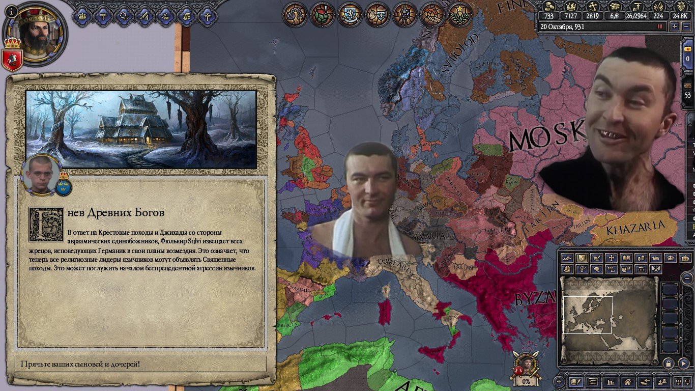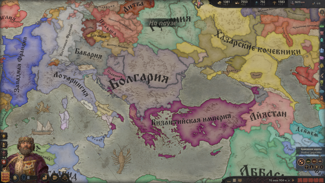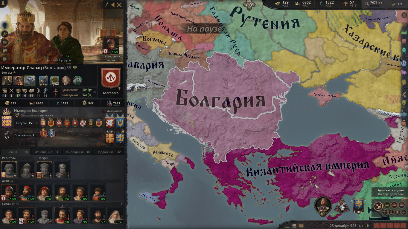 Какие же сыны собак придумали игру за Болгарию, мало что начинаем против 5000 конелуков Арпада, хотя тут еще можно выйти на белый мир если первым захватить его земли, так потом у нас хуева туча череда восстаний, авары, греки, славянские язычники, тенгриане, после смерти так вообще все земли делятся между сыновьями. Вопрос, а не проще было изначально Болгарию сделать империей? Ведь она была именно что царством а не королевством/княжеством. И вот я за первенца Симеона тенгрианина Владимира-Русате, который в свое время поднял против меня восстание, но был помилован в обмен на обращение, объединил вновь все земли и даже прихватил большую часть балкан, но у меня нету никакого уникального ивента, только создание кастомной империи или же Карпатии, которая предполагалась для Мадьяр. Есть только "Объединить южных славян" но оно вообще никаких титулов не дает, да и как назло милипиздрические графства уже захвачены более сильными державами вроде Византии и Лотарингии.