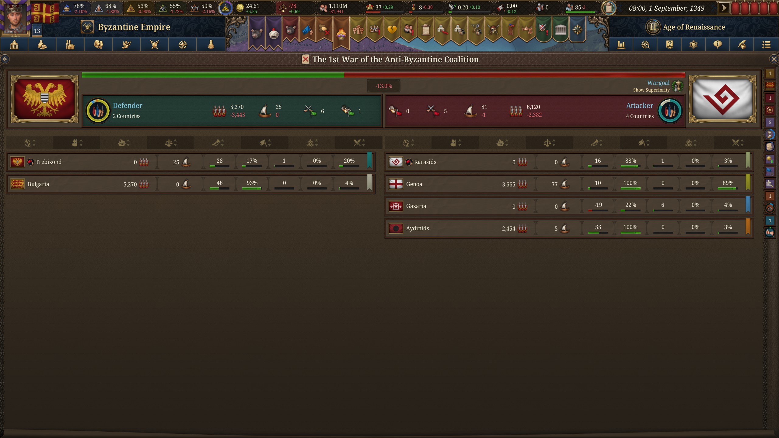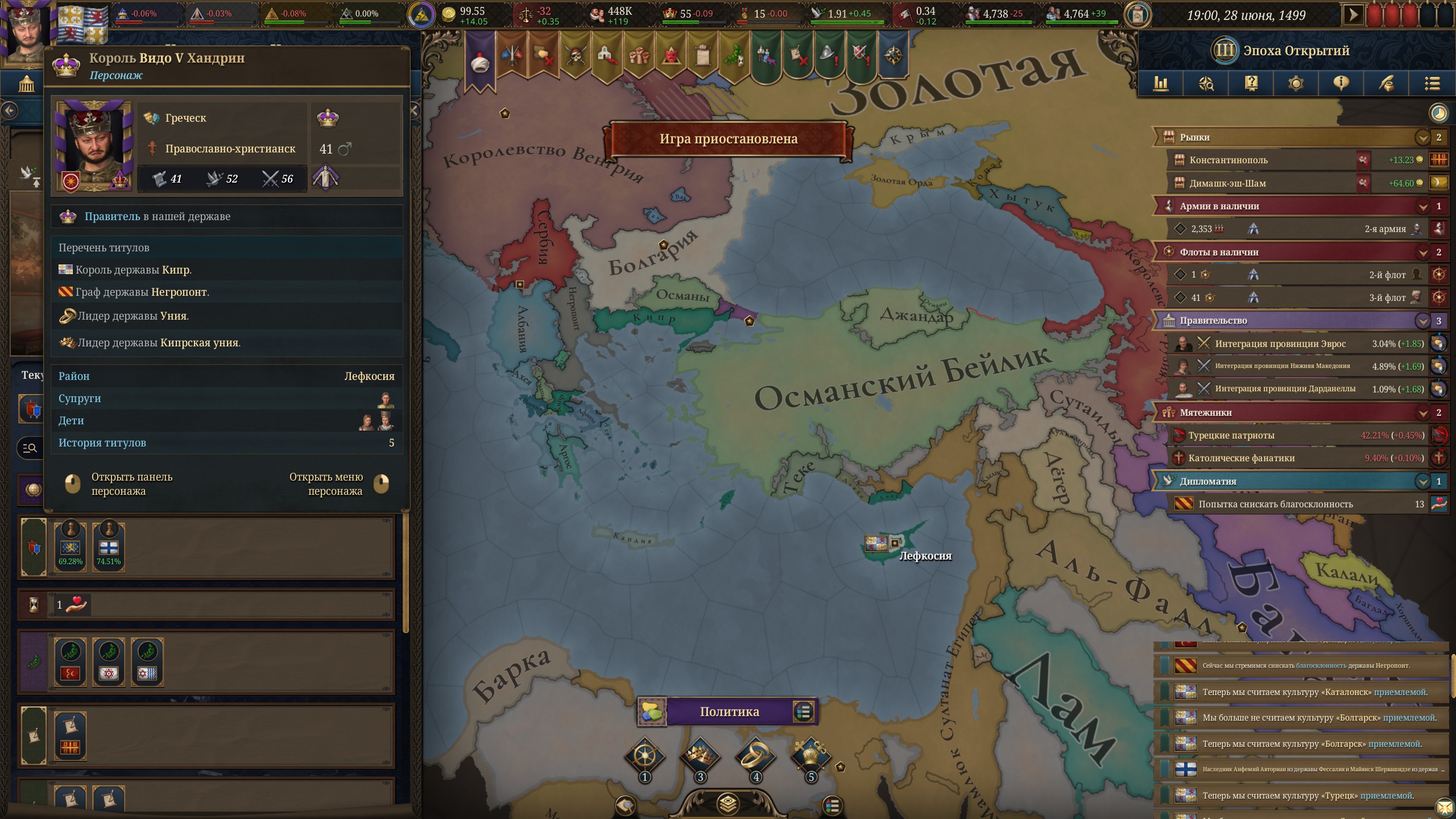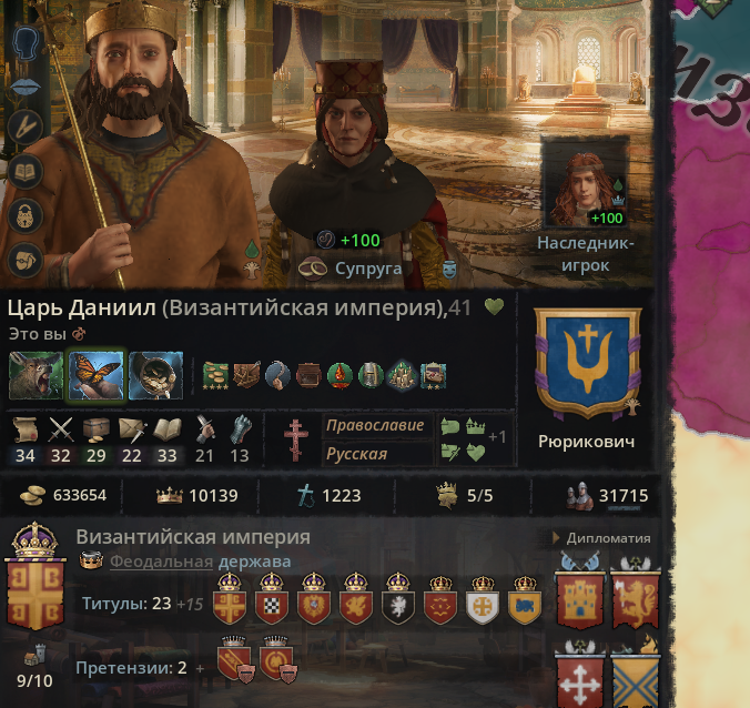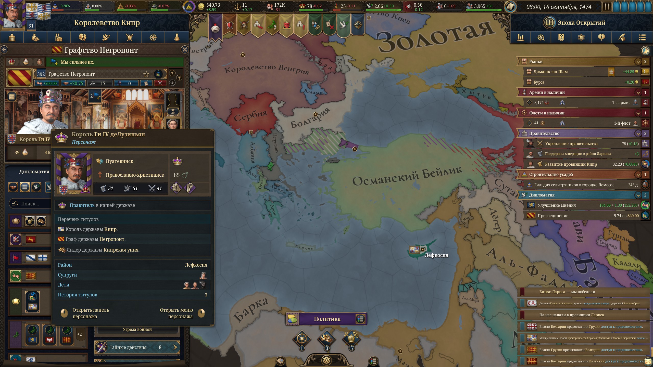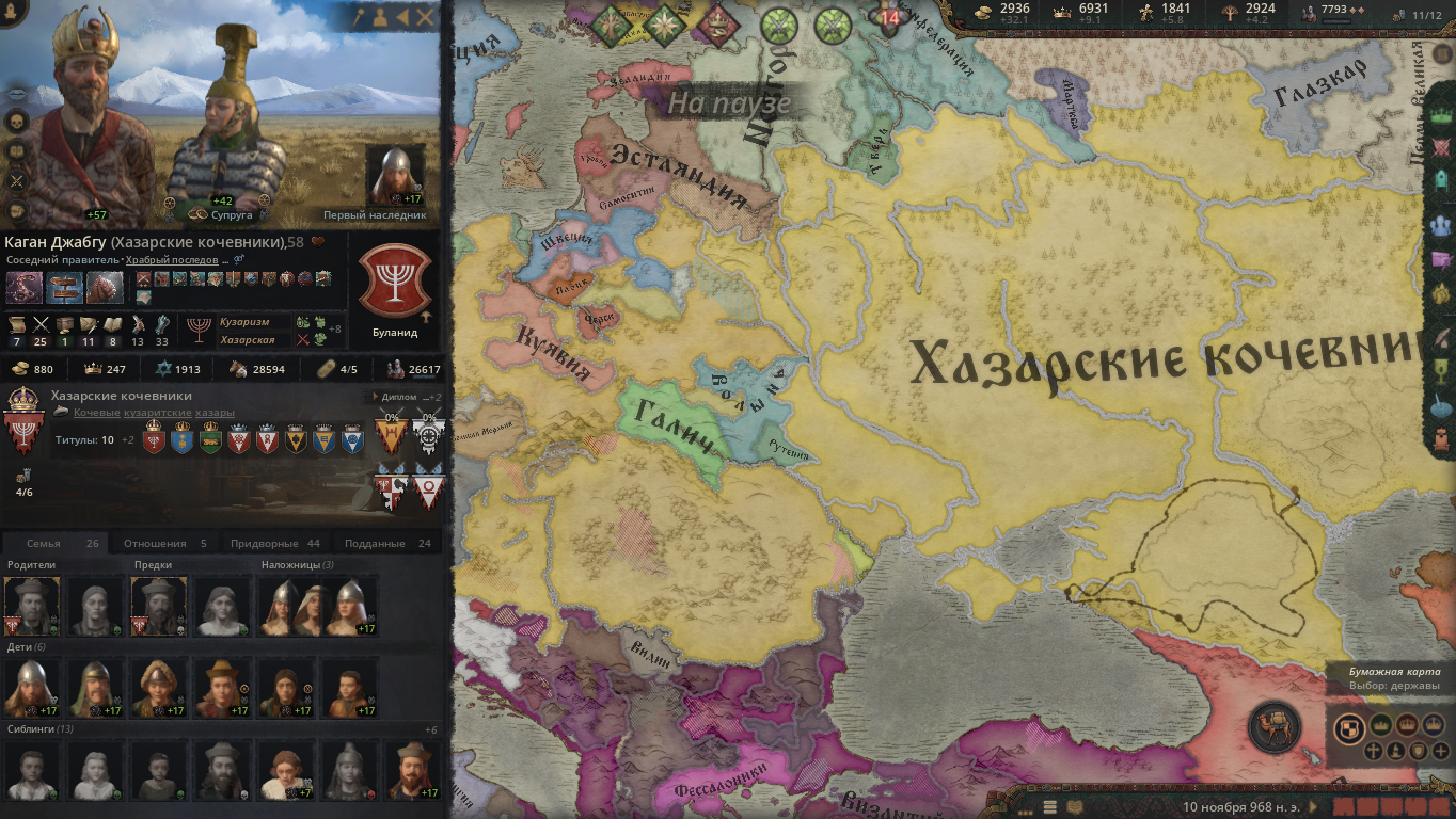 Какие же сыны собак придумали игру за Болгарию, мало что начинаем против 5000 конелуков Арпада, хотя тут еще можно выйти на белый мир если первым захватить его земли, так потом у нас хуева туча череда восстаний, авары, греки, славянские язычники, тенгриане, после смерти так вообще все земли делятся между сыновьями. Вопрос, а не проще было изначально Болгарию сделать империей? Ведь она была именно что царством а не королевством/княжеством. И вот я за первенца Симеона тенгрианина Владимира-Русате, который в свое время поднял против меня восстание, но был помилован в обмен на обращение, объединил вновь все земли и даже прихватил большую часть балкан, но у меня нету никакого уникального ивента, только создание кастомной империи или же Карпатии, которая предполагалась для Мадьяр. Есть только "Объединить южных славян" но оно вообще никаких титулов не дает, да и как назло милипиздрические графства уже захвачены более сильными державами вроде Византии и Лотарингии.