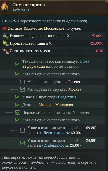 >>50504277 Ну да сидишь такой со 100 стабы и легитимности и тебе раз и ивент на -50 стабы, раз и другой -20, раз и претендент появился, и -50 к сословиям и налогам. И все по механике! А не потому что в таком-то году у страны или культуры прописан дизастер на - говно.