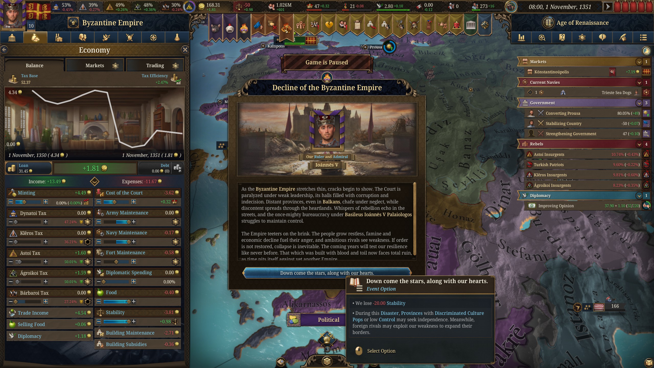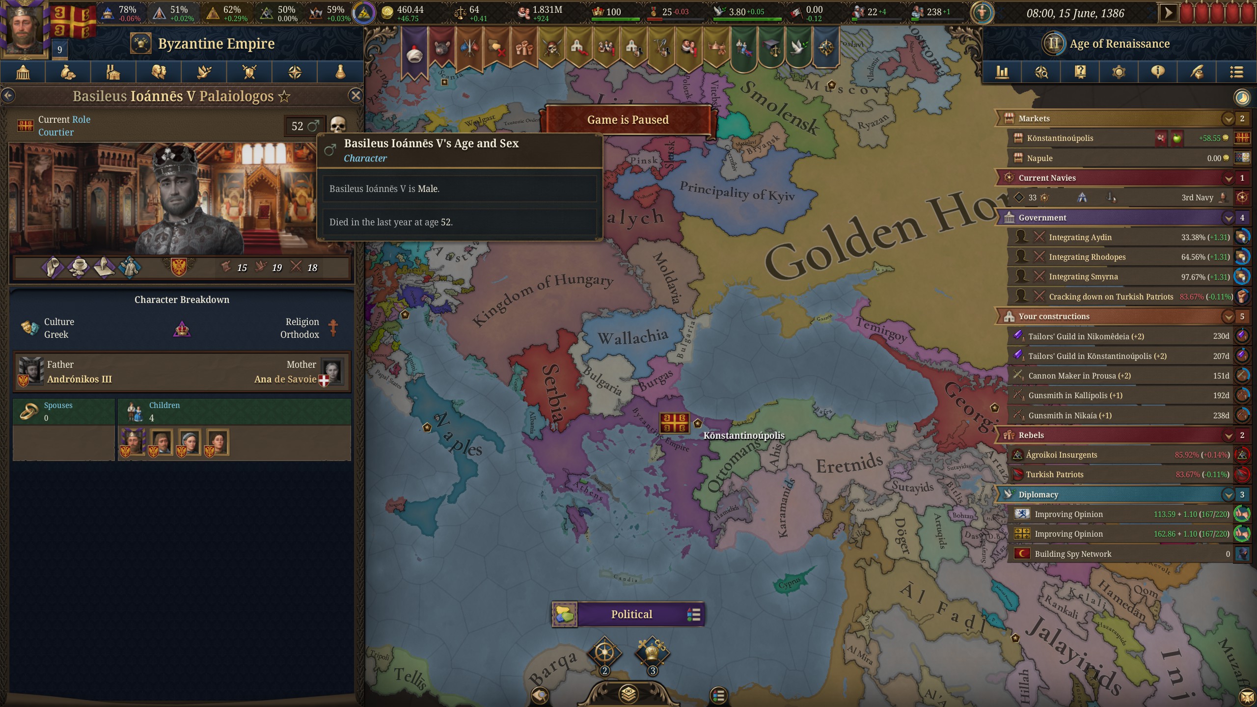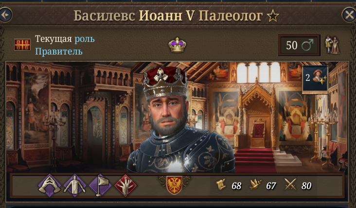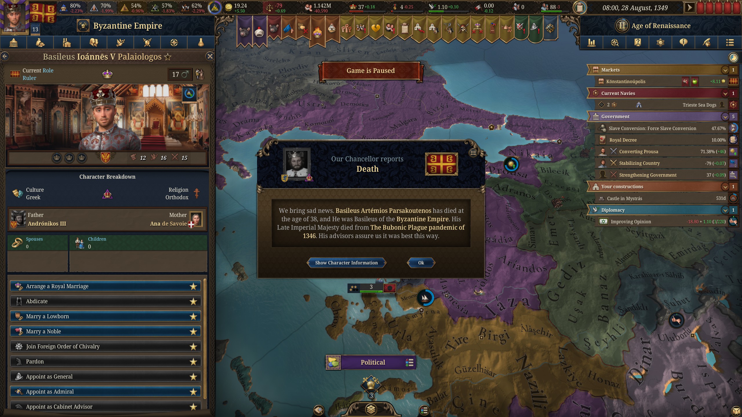 Стартовый дурачок умер, оставив после себя крепкую Византию. Хз, мне забавно вообще думать, как паренёк с трейтом slow, которого в детстве все буллили и ни во что не ставили (а в игромехе это выливалось в миллиард дизастеров и ивентов) оказался во главе разрушающихся остатков бывшей великой империи, и сумел сделать всё возможное, чтобы удержать страну на плаву. Это же просто мило представлять, как он, мямля и тупя, настаивал на своих государственных решениях, которые спасали страну, балансирующую на грани краха. А уж заканчивать дело его потомкам.