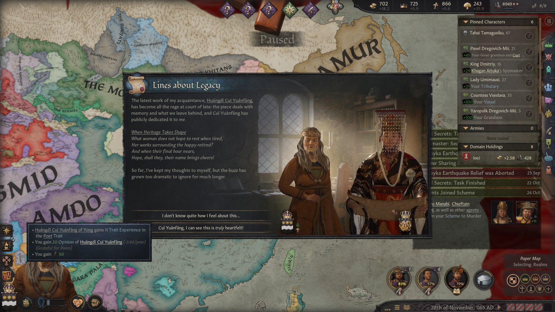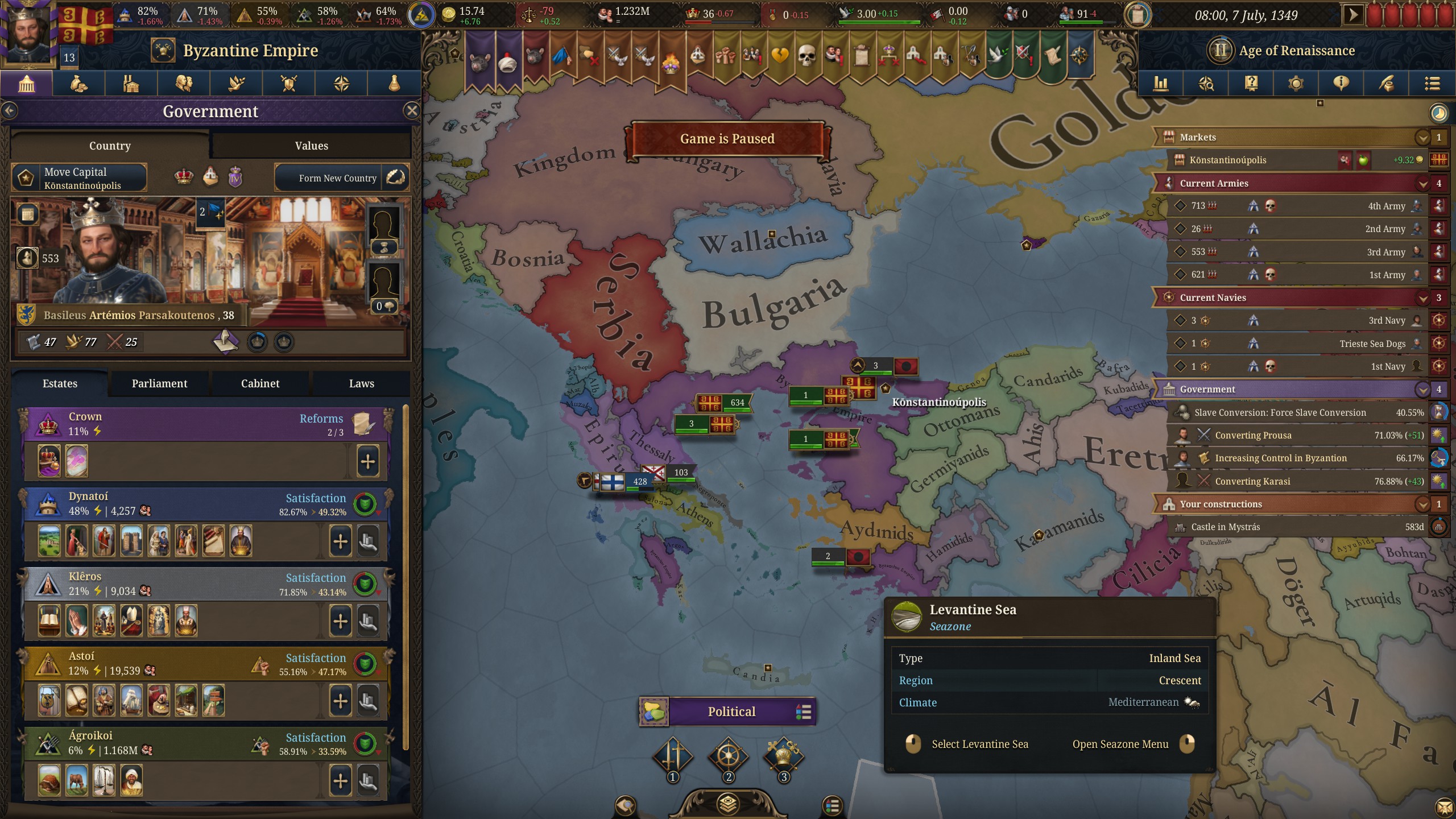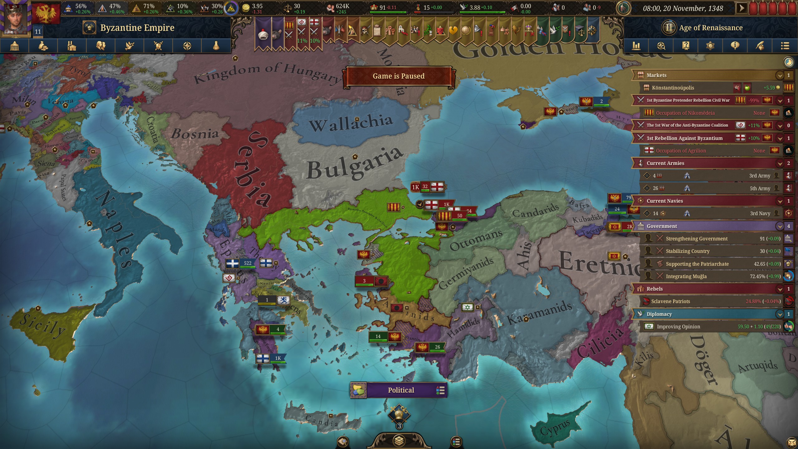Стартовый дурачок умер, оставив после себя крепкую Византию. Хз, мне забавно вообще думать, как паренёк с трейтом slow, которого в детстве все буллили и ни во что не ставили (а в игромехе это выливалось в миллиард дизастеров и ивентов) оказался во главе разрушающихся остатков бывшей великой империи, и сумел сделать всё возможное, чтобы удержать страну на плаву. Это же просто мило представлять, как он, мямля и тупя, настаивал на своих государственных решениях, которые спасали страну, балансирующую на грани краха. А уж заканчивать дело его потомкам.