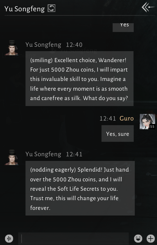 Ну что, дошел на легендар_очке до 11 уровня, облазив немного округу первой локации и сделав квест на сокровища развалин форта, там же изучил навык скрытного убийства и прокачал его 1 раз, также наменял кузнечиков и цветочков и прокачался у музыканта, все это я проебал в первый раз. Правда пока ни 1 босса не убил, но я даже на арене не пофехтовал так что наверное это норм, зачем лезть на боссов когда лох, мне даже типчик отказал на опушке, сказал на 16лвл приходи. А, еще встретил мелкую которой надо показать мув стратегического меча, чего то даст, хз. Завидую рнн-боярам и удаленщикам.