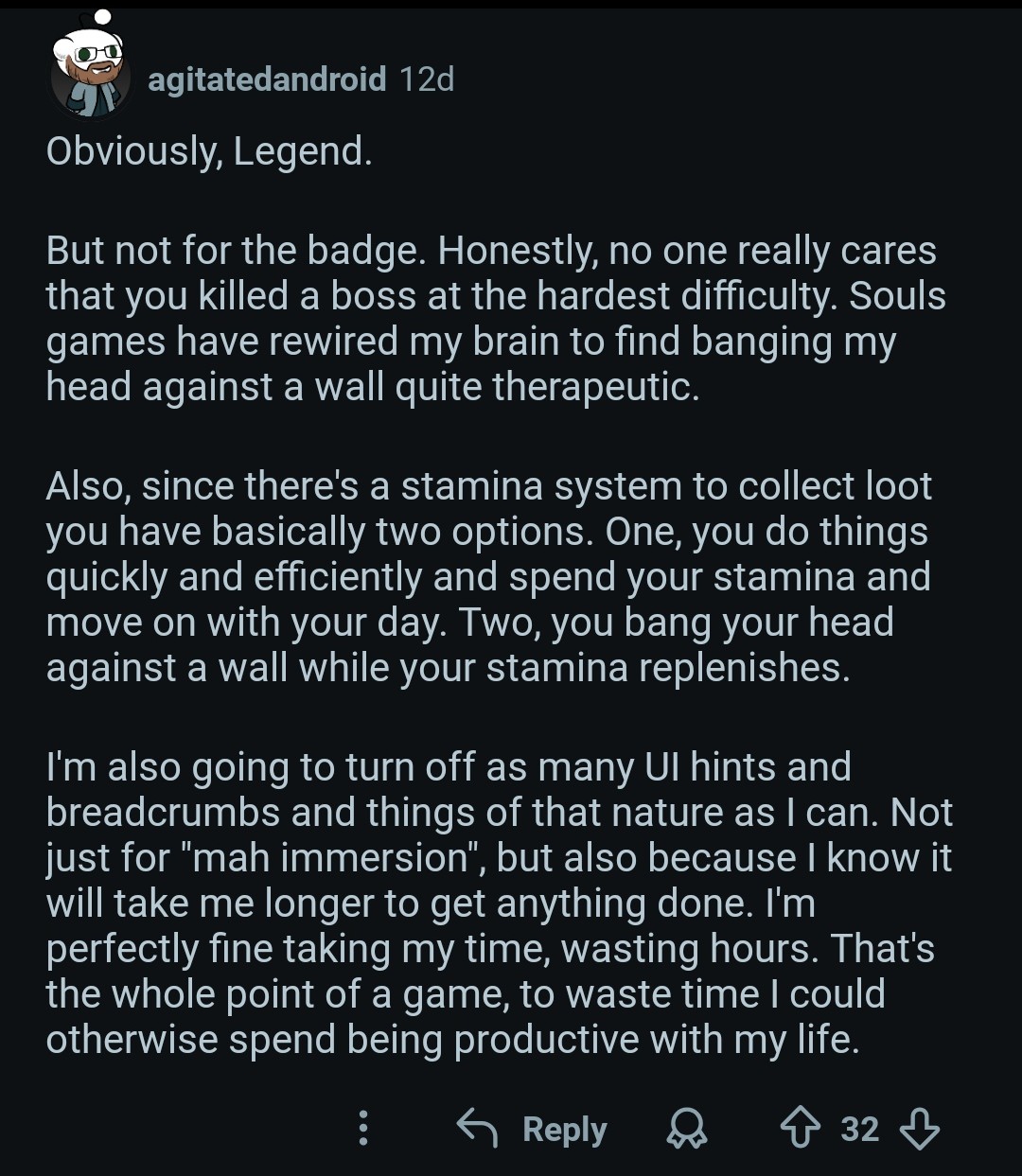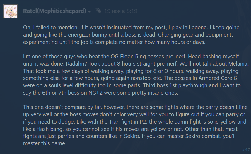 после вмятых ветров удалил вуву и подумываю удалить говнишь. игра реально классная, я прям вижу как долго тут можно аутировать оттачивая парирование на боссах и собирая билды всякие. это вот то что я искал.