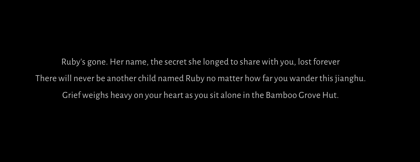 встречаем мужика, знаем его пару дней буквально, на нас напали, он умер, ну похуй так то, тут вокруг постоянно куча народу мрёт. о руби ваще ничё не понял, кто она нам приходится, да и кто такой гг сам по себе. бтв дальше сюжета не будет, все остальные обновы это филлер.