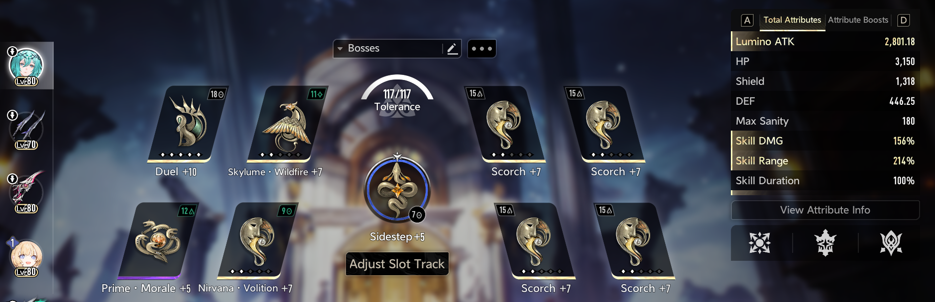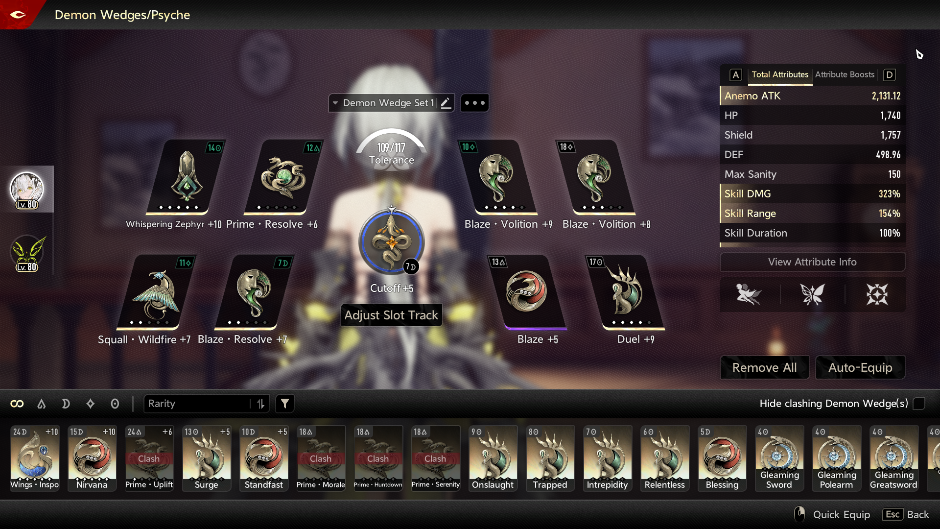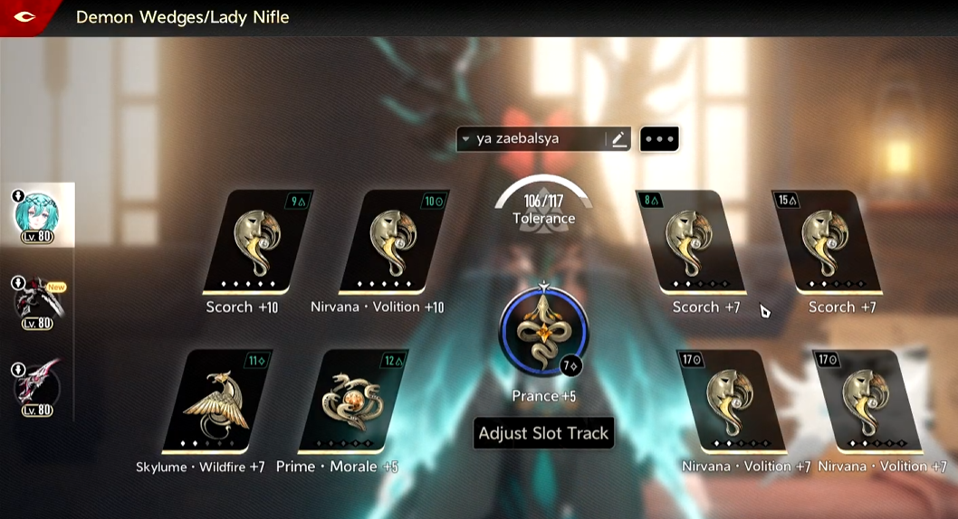 Cleared all of the theatre till IR act 12 with i6 lady nifle/i2 fina/i0fushu(i1 after Act 7). All of them are with purple wedges except wings inspo +7 on sups and duel +6 on nifle-sama. Both weapons on lady nifle are smelt 5.Others are smelt 0.Tbh the weapon skill dmg buffs get diluted heavily by the fushu skill dmg buffs. Skills are all 8 on supports and all 10 on nifle-sama.