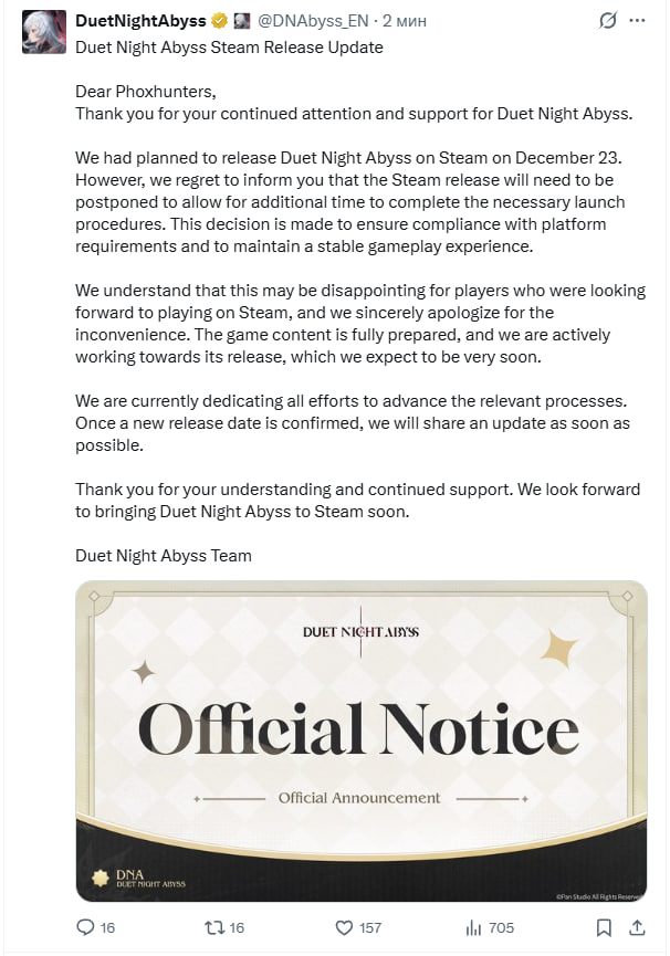 Не смотря на скорость треда пока я остаюсь заинтересован в игре, то буду продолжать срать в него потихоньку разным. Давайте обсудим новую обратную связь от разработчика: https://x.com/DNAbyss_EN/status/2005941989993243018 Про фиксы театра мы уже видели по внутриигровым уведомлениям.
