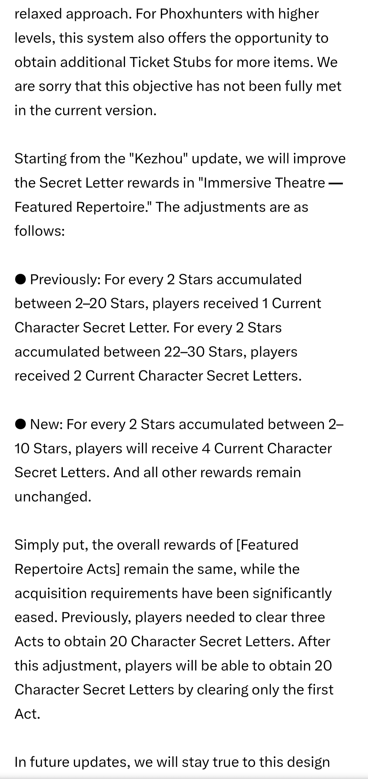 Театр не был настолько сложным, новые персонажи после театра и так попадали в еженедельных боссов, а после и вовсе в магазин. Они пишут: >For Phoxhunters with higher levels, this system also offers the opportunity to obtain additional Ticket Stubs for more items. We are sorry that this objective has not been fully met in the current version. И тут же пишут, что облегчают театр, чтобы персонажей было ещё проще забирать тем кто мало гриндит. Как это поможет Phoxhunters with higher levels? Остальные награды при этом те же. Рад за казуалов и рад, что смогу рассказывать всем вне треда, что любой дебил может выфармить нового персонажа легко, но дайте тогда что-то стоящее тем кто 10+ клинья выфармил.