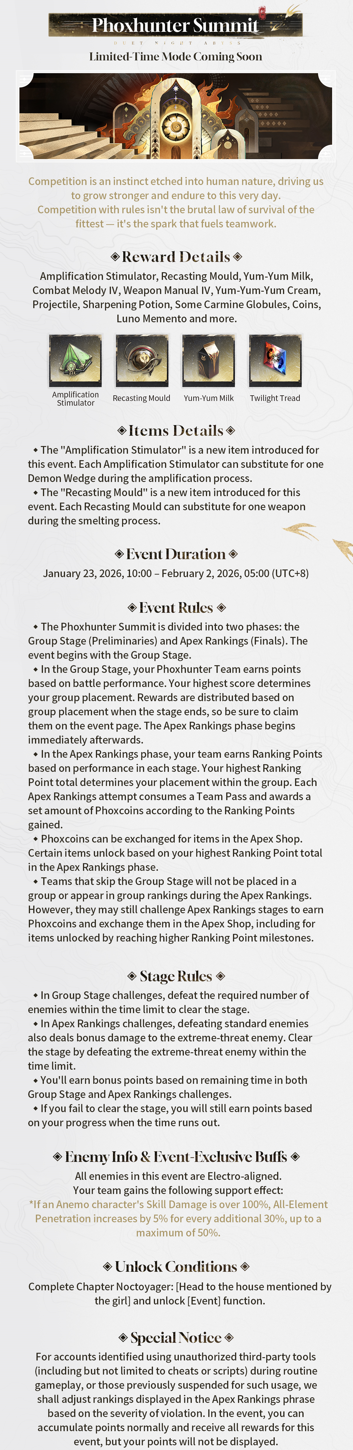 Our team will continue to enhance its detection mechanisms for scripts and similar unauthorized plugins to actively protect the gaming experience and fair environment for all Phoxhunters. We also reiterate this important reminder: please do not trust offers for "farming services" or "account sharing," as these practices significantly risk the security of your account and any associated assets.