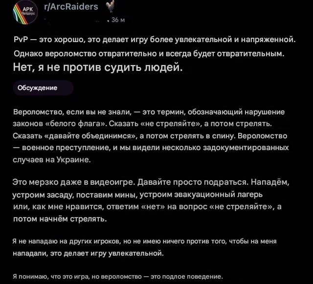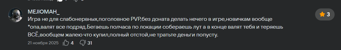 >>50487780 С одной стороны пиздатая игра, в которую приятно играть, стрелять, исследовать карты, выполнять задания и собирать разноцветный лут. С другой стороны постоянный стресс от осознания того, что в любой момент тебе в псину прилетит пуля и твое время будет потрачено впустую. У большинства людей психика не видит разницы между реальностью и игрой, и они переживают реальный стресс, который может реально сказаться на здоровье (давление, сердцебиение и тд). Поэтому нормальным людям (не психопатам) хотелось бы, чтобы таких ситуаций, где их обманывают/унижают/подстерегают было как можно меньше, тем более, когда убийство другого игрока - это не вин кондишен. Ты можешь получить то же самое с мобов и лутинга, никакого уникального лута игроки не дропают, опыта за убийство дают не сильно больше, чем за шершня. При этом ты сам подставляешься под агрессию со стороны третьих игроков, которые тебя завалят с чувством удовлетворения как поехавшую псину. Тебе просто дают возможность стрелять по игрокам, а делать это или нет - сугубо личный выбор каждого. Тех, кто выбирает насилие, в обществе не любят.