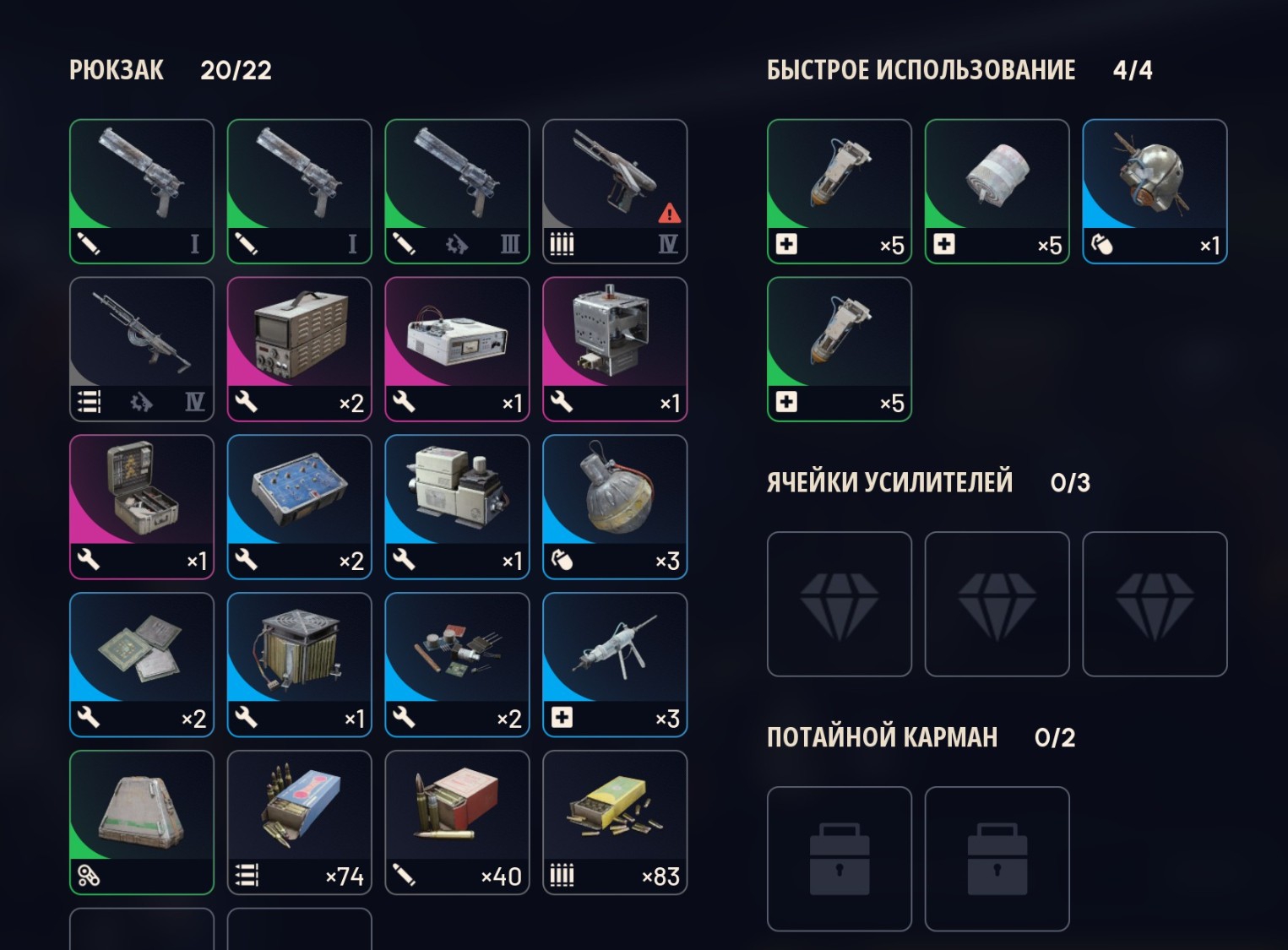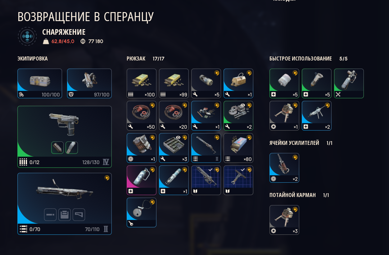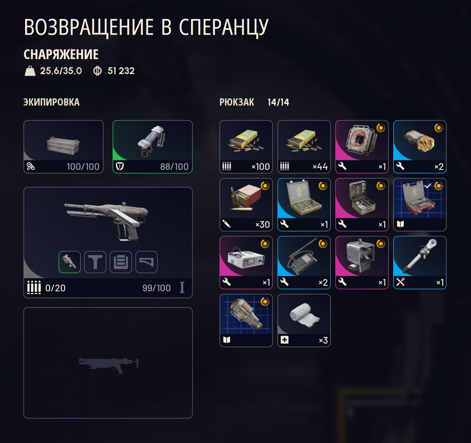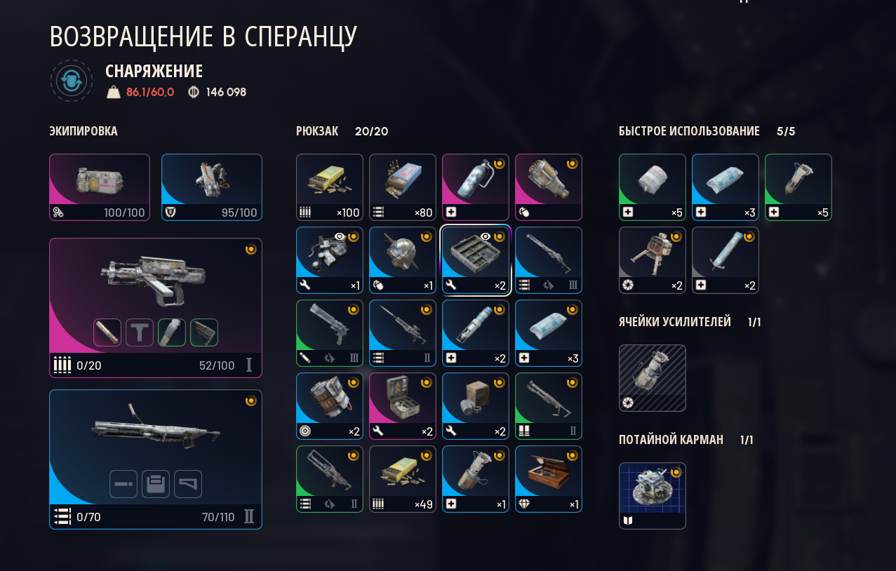 я хожу в гире за 20-30 в среднем: лайт шилд, добыча 2, анвил 1, стичер 2, по пачке патронов на каждый, 5 бинтов, 2 речарджа и вульфпак в очке.