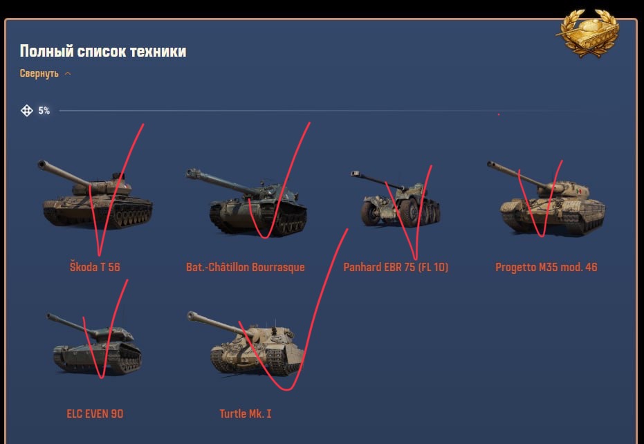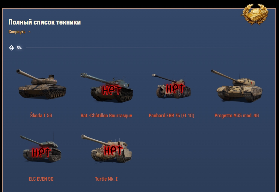 💪 Легенды — 6 редких танков: VIII Škoda T 56 , VIII Bat.-Châtillon Bourrasque , VIII Panhard EBR 75 (FL 10) , VIII Progetto M35 mod. 46 , VIII ELC EVEN 90 и VIII Turtle Mk. I . Вероятность выпадения — 5%.