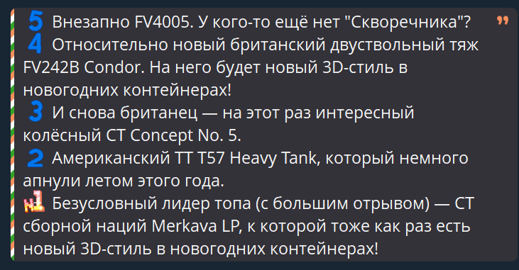 ♻️ И третья категория — 26 проверенных временем машин, которые станут надёжной опорой в сражениях. Среди них: VIII Chieftain/T95, VIII GSOR 1010 FB, VIII Lansen C, VIII EMIL 1951, VIII Объект 252У и другие. Вероятность выпадения — 90%.