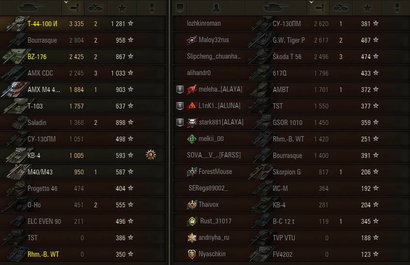 >>50504626 Не, я на разных танках играю. У меня на американском т34 всегда 0 урона, самый картонный танк, не понимаю как играть. Вот на чем я обычно играю: Ис-7, Супер-Конь, WZ111 A5, E77, Мышь, AMX mle 49, Tornvagn.