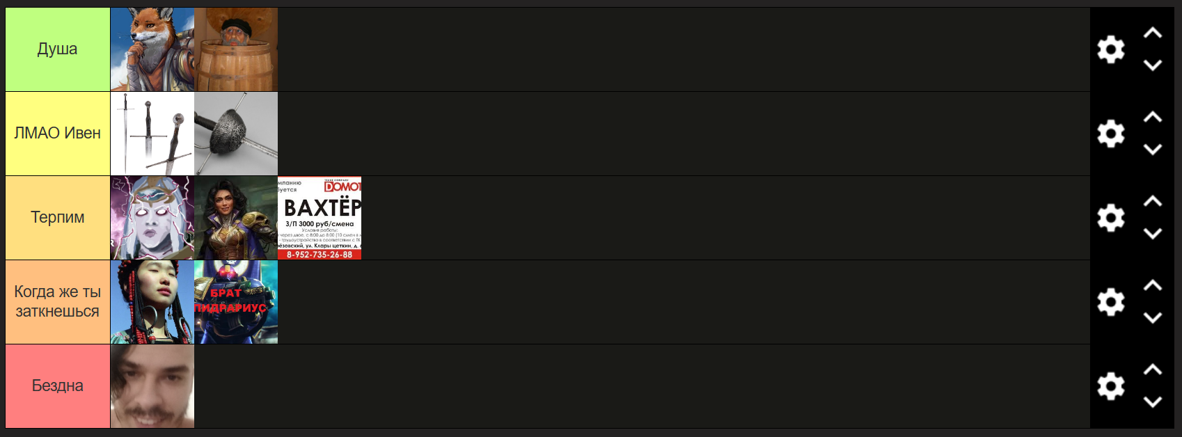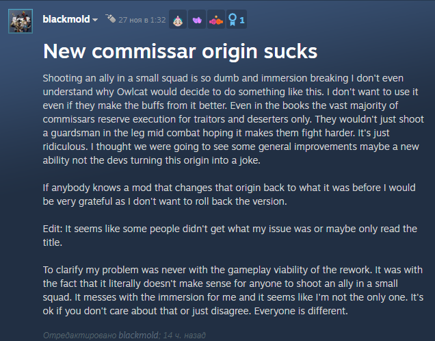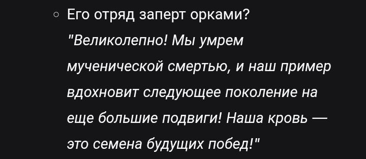 >>50493394 >позорных дефолтных Ну не надо, не такие уж и позорные. >>50493408 >>50493369 Да мне норм так то. ГД значительно отличаются мышлением от смертных так что норм. Хотя у ГД должен был быть такой же вариант как у демона только [ПУТЬ ДРАКОНА] РЫЧАНИЕ ДВИГАНИЕ ТАЗОМ/МОЛЧА ОСУДИТЕЛЬНО С СОЧУСТВИЕМ СМОТРЕТЬ Так то даже присутсиве гг должно молча решать вопросики. >>50493409 >еретик Однозначно должен меняться, варп в большом количестве пидорасит. Как я уже говорил, архенту в берсерка кхорна корраптить, Равора и Кассию сращивать с кораблем.